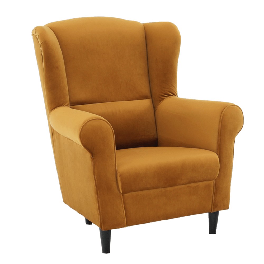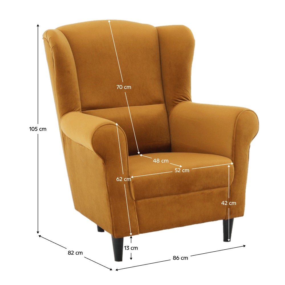 Kreslo-ušiak CHARLOT - tomu sa hovorí relax! Zvaľte sa do tohto pohodlného kresla a započúvajte sa do hudby, pozrite si obľúbený film či prečítajte si zopár stránok knihy. Je len na Vás, ako relaxujete, s týmto kreslom sa Váš pocit oddychu ešte umocní. Vo farebnom prevedení horčicovej látky riviera bude vynikať v každej miestnosti. Drevené nožičky, ktoré držia toto mohutné kreslo s rozmermi (ŠxHxV): 86x82x105 cm, sú v čiernej farbe. O Vaše pohodlie a komfort sa postarajú najmä výška chrbtovej opierky vo výške 70 cm a výška opierky na ruky 62 cm. Rozmaznávajte sa a užívajte si veľmi pohodlné a príjemné sedenie.