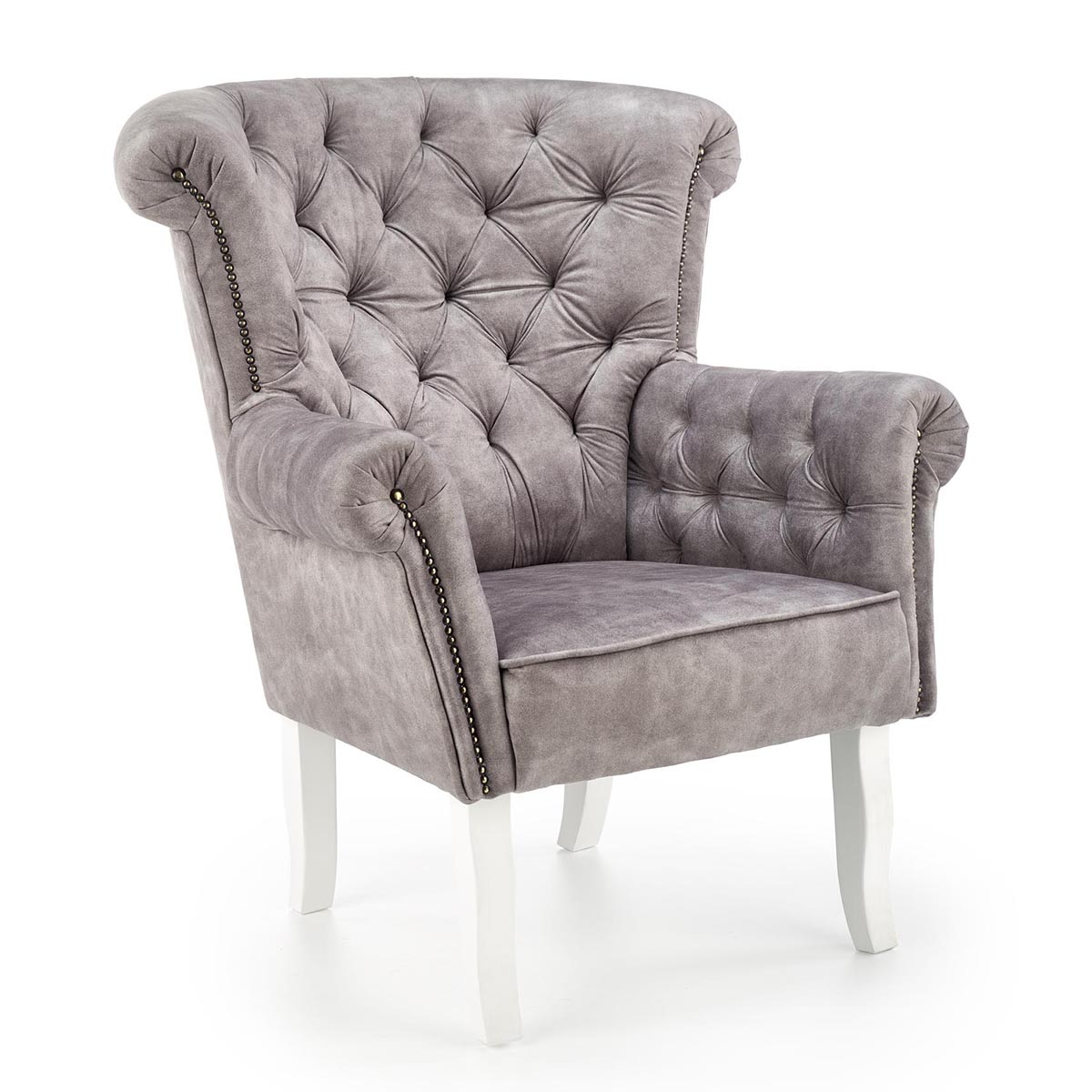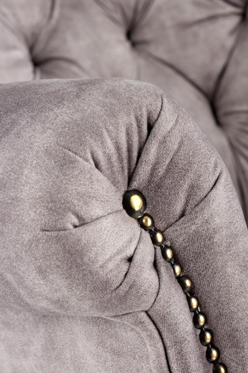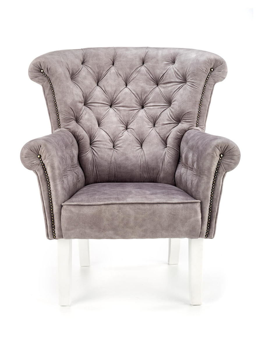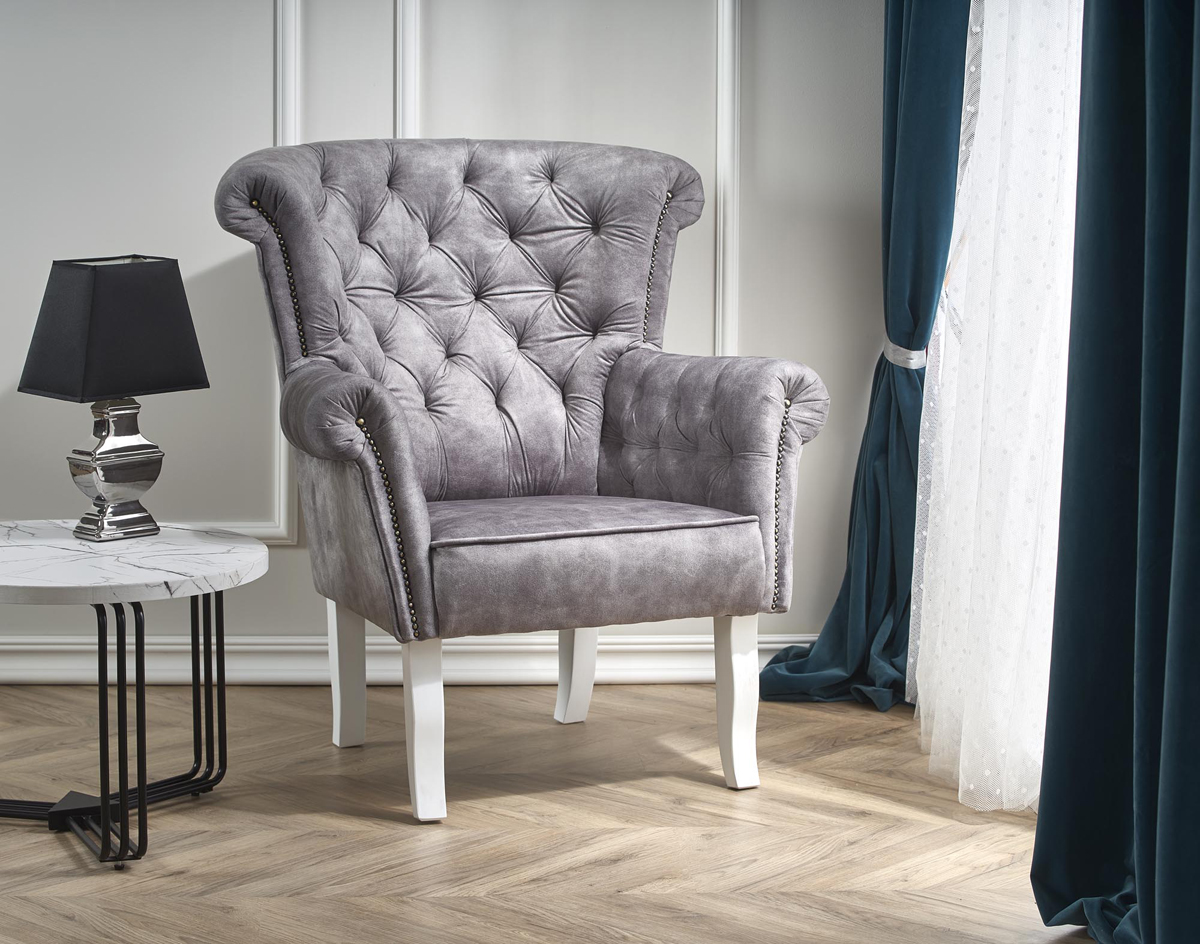 Honosné kreslo ITALO sa bude skvele vynímať vo Vašej obývačke, spálni alebo vstupnej hale. Je odeté do nádhernej, kvalitnej, zamatovej látky v nadčasovom sivom prevedení. Jeho stabilitu a pevnosť zabezpečujú štyri pevné nohy vyrobené z masívneho dreva bielej farby. K maximálnemu pohodliu prispievajú aj čalúnené podrúčky a vysoké operadlo. Dávku luxusu a majestátnosti kreslu dodáva dekoratívne prešívanie operadla a podrúčok, ktoré sú navyše zdobené z prednej časti. Rozmery kresla sú (ŠxHxV): 85x80x97 cm a výška sedu je 44 cm. Jeho maximálna nosnosť je 120 kg a je dodávané v monte. Italo bude Vašim najlepším priateľom, ponúkne Vám svoju náruč, keď prídete po náročnom dni v práci domov a dopraje Vám maximálny odpočinok, aký si zaslúžite.