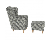 Kreslo (ušiak) s taburetkou ASTRID bude praktickým a pohodlným doplnkom vo Vašej domácnosti. Jadro tvorí purpena, ktorá poskytuje príjemné sedenie. Kreslo aj taburetka stojí na drevených nožičkách vo farbe buk a čalúnené sú látkou Alova vo farbe patchwork N1, pričom na výber sú aj v iných farebných vyhotoveniach. Je možné si objednať zo 7 farebných prevedení látky Alova. Výška sedu je 42 cm a hĺbka sedu je 48 cm.