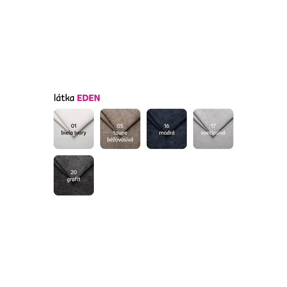 Ponúkame vám možnosť vybrať si z 5 farebných prevedení látky Eden za cenu 285 Eur. Pri individuálnej objednávke je potrebné zaplatiť 20% zálohu z danej sumy. Po uhradení zálohy bude Vaša požiadavka zadaná do výroby. Dodacia lehota 6-8 týždňov.