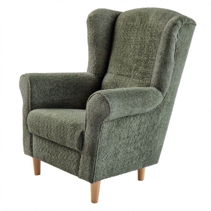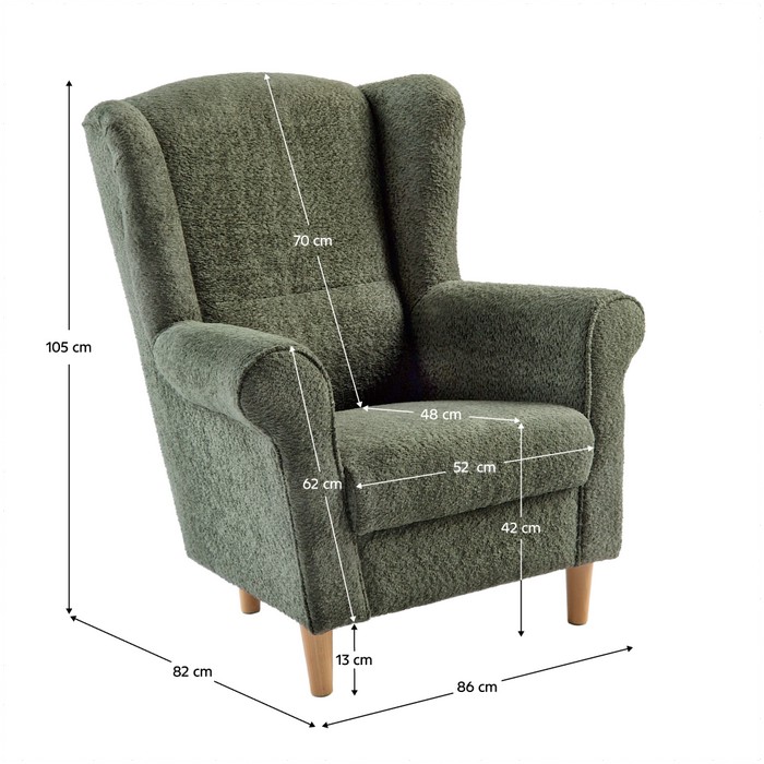 Kreslo CHARLOT vám poskytne dokonalé miesto na oddych po náročnom dni. Stačí sa pohodlne usadiť, oprieť hlavu a vychutnať si chvíle pokoja pri obľúbenej hudbe alebo filme. Tento štýlový ušiak je nielen komfortný, ale zároveň predstavuje elegantný doplnok do každej domácnosti. Vysoká, tvarovaná opierka chrbta s výškou 70 cm poskytuje oporu chrbtici a krku, čím pomáha predchádzať nepríjemným bolestiam. Pohodlie dopĺňajú aj široké opierky rúk, ktoré ponúkajú ideálne miesto na relax pre vaše ruky. Výplň kresla tvorí kvalitná PUR pena, ktorá sa vyznačuje výbornými vlastnosťami - spočiatku je pevnejšia, no postupne sa prispôsobí telu a poskytne ešte väčší komfort bez straty svojho objemu. Kreslo je čalúnené príjemnou zelenou látkou Coral Bouclé a stabilitu mu dodávajú pevné drevené nožičky v bukovom prevedení. Materiál kresla tvorí látka Coral Bouclé 20 v kombinácii s drevom a PUR penou. Oderuodolnosť textílie podľa testu Martindale dosahuje 45 000 oderov. Farebné prevedenie je sivá v kombinácii s bukom. Rozmery kresla sú (ŠxHxV): 86x82x105 cm. Výška sedu je 42 cm, hĺbka sedu 48 cm a šírka sedu 52 cm. Výška opierky chrbta je 70 cm a výška opierky na ruky 62 cm. Kreslo stojí na drevených nožičkách s výškou 13 cm. Maximálna nosnosť kresla je 120 kg.
