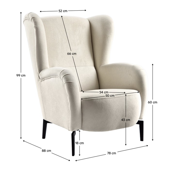 Objavte dokonalú rovnováhu medzi štýlom a pohodlím s kreslom RAMON, ktoré sa stane elegantnou dominantou vášho interiéru. Jeho nadčasový dizajn typu ušiak vyniká mäkkými tvarmi a moderným vzhľadom. Kreslo je celočalúnené kvalitnou látkou Gerra 10 v smotanovej farbe, ktorá sa vyznačuje vysokou oderuodolnosťou - až 40 000 oderov podľa testu Martindale. O stabilitu a moderný vzhľad sa starajú čierne kovové nožičky s výškou 18 cm od podlahy, ktoré zároveň uľahčujú čistenie pod kreslom. Výplň z pružiny falista a PUR peny T30 poskytuje optimálnu oporu a výnimočné pohodlie počas dlhého sedenia. Vďaka vysokému operadlu s rozmerom 66 cm, pohodlným podrúčkam vo výške 60 cm a priestrannému sedadlu (HxŠ): 54x50 cm si užijete maximálny komfort pri čítaní, sledovaní televízie či oddychu. Kreslo Ramon s rozmermi (ŠxHxV): 78x88x99 cm, výškou sedu 43 cm a nosnosťou 120 kg je synonymom komfortu, elegancie a moderného dizajnu.