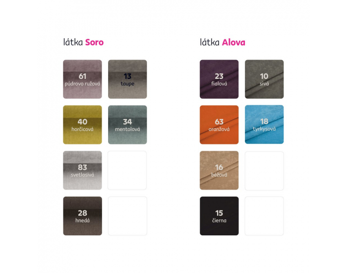 Možnosť objednania v 6 farebných prevedeniach látky alova v cene 365 eur alebo látky Soro v cene 379 Eur. Pri individuálnej objednávke je potrebné zaplatiť 20% zálohu z danej sumy. Po uhradení zálohy bude Vaša požiadavka zadaná do výroby. Dodacia lehota 8-10 týždňov.