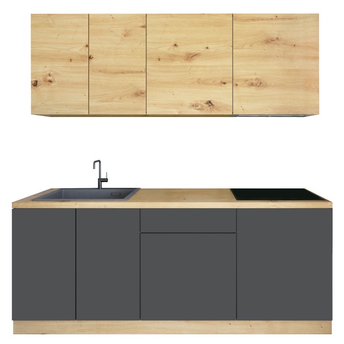 Dodajte svojej kuchyni štýl, funkčnosť a moderný nádych s kuchynskou linkou VINETU 200, ktorá je navrhnutá s dôrazom na praktické využitie priestoru a elegantný vzhľad. Vďaka svojim rozmerom 200x46,8 cm je ako stvorená pre menšie priestory či moderné byty, kde vynikne svojím premysleným dizajnom. Linka je vyrobená z laminovanej DTD s hrúbkou 1,5 cm a laminovanej MDF s hrúbkou 1,6 cm, pričom ABS hrany zabezpečujú odolnosť a dlhú životnosť. Korpus aj horné dvierka sú vo farbe dub artisan, zatiaľ čo spodné dvierka v grafitovo sivej farbe dodávajú kuchyni výrazný, no harmonický kontrast. Moderné bezúchytkové PUSH OPEN otváranie prináša čisté línie a komfortné používanie - jednoduchým dotykom sa dvierka pootvoria, takže rukoväte nie sú potrebné. Plastové nožičky v čiernej farbe s výškou 10 cm pôsobia subtílne, no zároveň poskytujú stabilitu. Hornú časť kuchyne tvoria skrine G80 (ŠxHxV): 80x31,3x72 cm a dve univerzálne skrinky G60 (ŠxHxV): 60x31,3x72 cm, ktoré ponúkajú dostatok miesta na riad či potraviny. Dolnú sekciu dopĺňajú skrinky D80Z (ŠxHxV): 80x46,8x82 cm), D60S1 (ŠxHxV): 60x46,8x82 cm a D60 (60×46,8×82 cm), obe v univerzálnom prevedení. Kuchyňa je dodávaná bez pracovnej dosky a drezu, takže si môžete vybrať variant, ktorý najlepšie zodpovedá vášmu vkusu. Súčasťou balenia je predný aj zakončovací sokel s úchytkami na upevnenie, čo zabezpečuje esteticky čisté zakončenie. Linka sa dodáva v demonte, bez dekorácií a spotrebičov, pripravená na jednoduchú montáž. Spojenie dubového dekoru, grafitovej sivej farby a minimalistického prevedenia vytvára nadčasový vzhľad, ktorý perfektne zapadne do každého moderného interiéru.