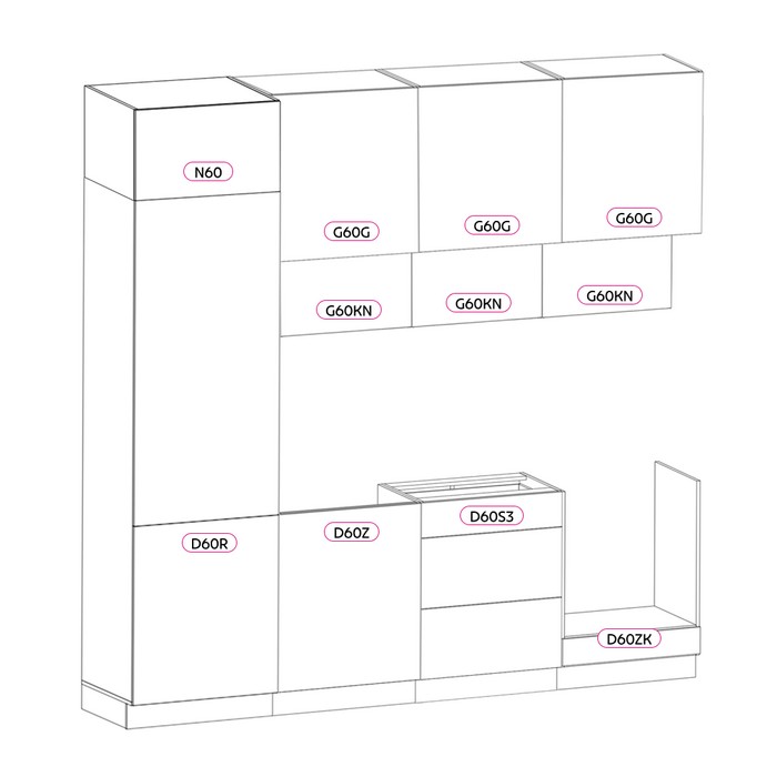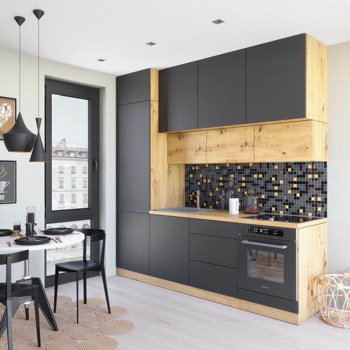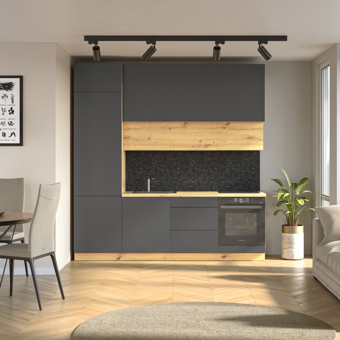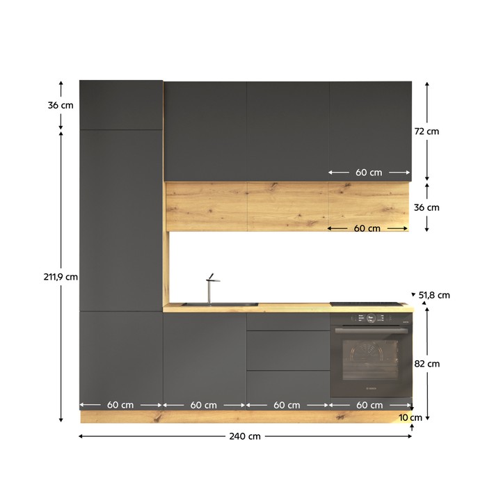 Kuchynská linka VINETU 240 je ideálnym riešením pre menšie priestory aj moderné byty. Je navrhnutá tak, aby ponúkla dostatok praktického úložného priestoru, no zároveň pôsobila ľahko a vzdušne. Kombinácia korpusu a horných dvierok z laminovanej DTD vo farbe dub artisan a spodných dvierok z laminovanej MDF v sivom odtieni vytvára elegantný kontrast, ktorý dokonale zapadne do moderného interiéru. ABS hrany zaručujú dlhú životnosť a odolnosť voči poškodeniu. Systém bezúchytkového PUSH UP otvárania prináša čisté línie, maximálny komfort a sofistikovaný vzhľad. Stačí jemne zatlačiť na dvierka a automaticky sa pootvoria do polohy, v ktorej ich možno pohodlne uchopiť. Celková šírka kuchynskej linky je 240 cm s hĺbkou 57,8 cm. Hrúbka materiálu DTD je 1,5 cm a MDF 1,6 cm. Kuchyňa stojí na plastových čiernych nožičkách s výškou 10 cm, ktoré umožňujú jednoduché čistenie priestoru pod linkou. Súčasťou zostavy je potravinová skrinka D60R (ŠxHxV): 60x57,8x211,9 cm - univerzálna a priestranná, nad ktorou možno umiestniť skrinku N60 (ŠxHxV): 60x57,8x36 cm). Hornú časť linky dopĺňajú tri univerzálne skrinky G60G (ŠxHxV): 60x44,8x72 cm a tri skrinky G60KN (ŠxHxV): 60x31,3x72 cm s výklopnými dvierkami. Spodnú časť tvorí dolná skrinka D60Z (ŠxHxV): 60x46,8x82 cm, skrinka D60ZK (ŠxHxV): 60x51,8x82 cm s priestorom na rúru (ŠxHxV): 57x50x59,5 cm) a dolná skrinka D60S3 (ŠxHxV): 60x46,8x82 cm s praktickými zásuvkami. Linka je dodávaná bez pracovnej dosky a drezu, takže si ju môžete prispôsobiť podľa vlastných predstáv. V ponuke je možnosť dokúpiť pracovnú dosku a drez z našej širokej ponuky. Súčasťou balenia je predný a dva zakončovacie sokle, ako aj úchytky na sokel. Kuchynská linka Vinetu sa dodáva v demonte, bez spotrebičov a dekorácií. Jej minimalistický vzhľad, kombinácia dub artisan a sivej farby, spolu so systémom PUSH OPEN bez úchytiek vytvárajú moderný, nadčasový a elegantný celok, ktorý sa ľahko prispôsobí vášmu štýlu aj priestoru.