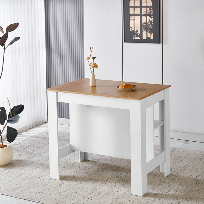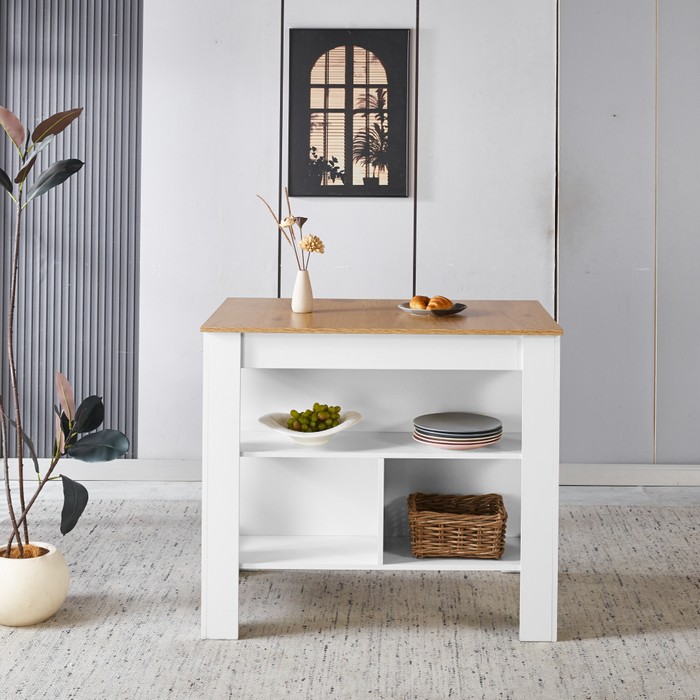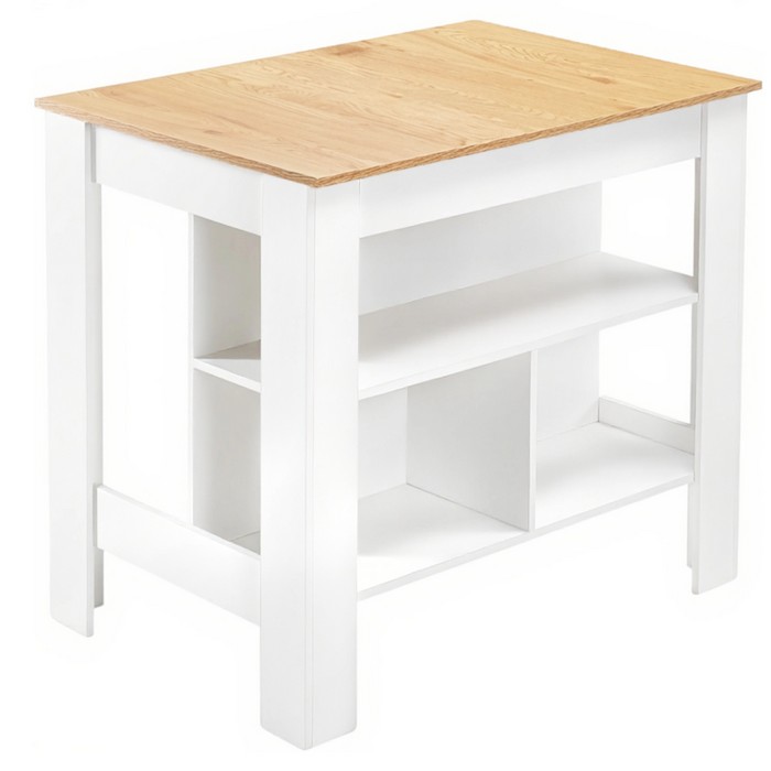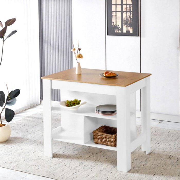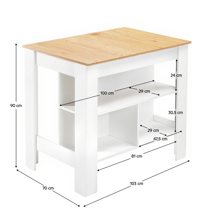 Kuchynský ostrovček LUNAN predstavuje praktické riešenie pre každodenné fungovanie v kuchyni, pričom kladie dôraz na jednoduchosť a účelnosť. Kombinácia bielej farby s dekorom dubu pôsobí sviežo a ľahko sa začlení do rôznych štýlov interiéru. Konštrukcia z laminovanej MDF zabezpečuje dostatočnú odolnosť a jednoduchú údržbu pri bežnom používaní. Ostrovček s rozmermi (ŠxHxV): 103x70x90 cm ponúka priestrannú pracovnú dosku s hrúbkou 1,3 cm, ktorá poskytuje miesto na prípravu jedál. Spodná časť je riešená otvoreným úložným priestorom s policami, ktoré umožňujú prehľadné uloženie kuchynských potrieb. Vrchná polica má rozmery (ŠxHxV): 100x29x24 cm a nosnosť 5 kg, spodná polica má rozmery (ŠxHxV): 47,5x29x30,5 cm s nosnosťou 2,5 kg. Celková nosnosť ostrovčeka je 120 kg. Model je praktický a moderný doplnok vhodný aj do menších kuchýň, kde rozšíri pracovnú plochu aj úložné možnosti bez zbytočného zaťaženia priestoru. Dodáva sa v demonte pre jednoduchú montáž.