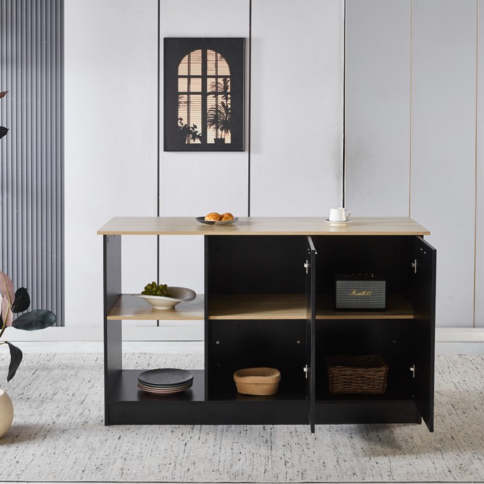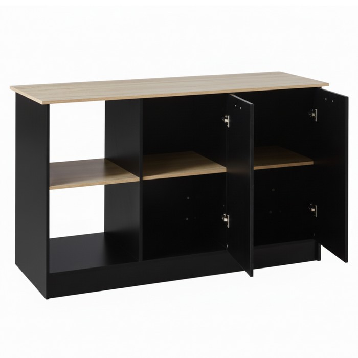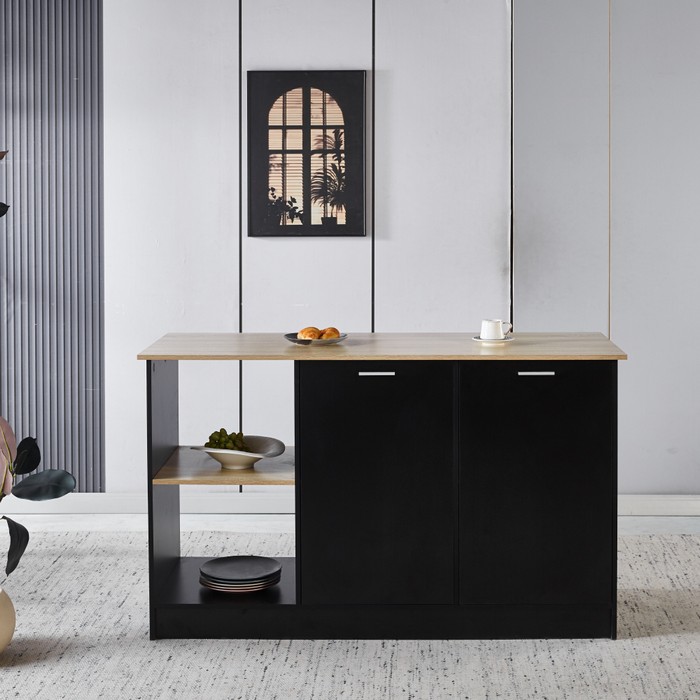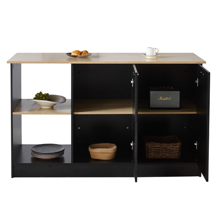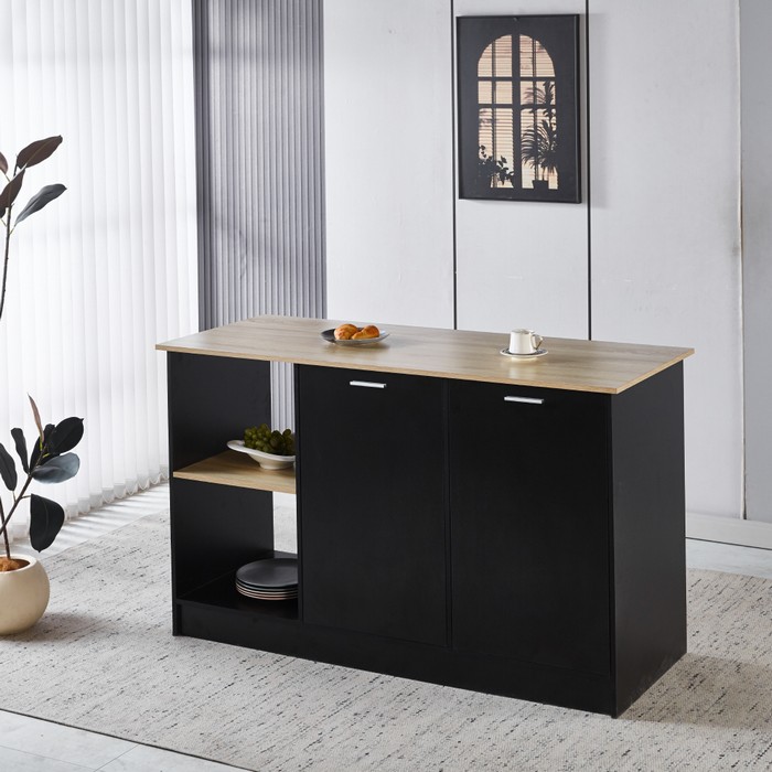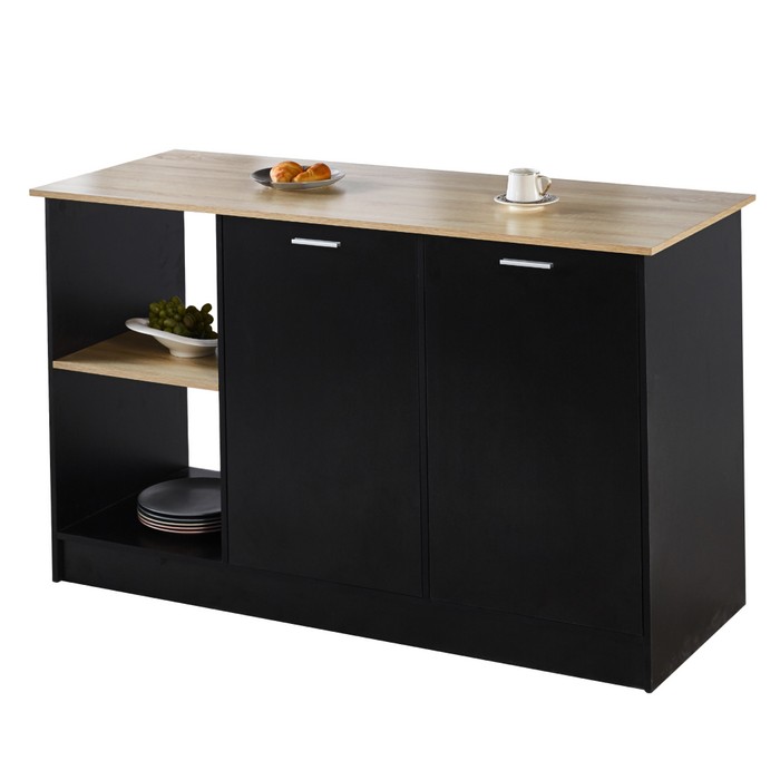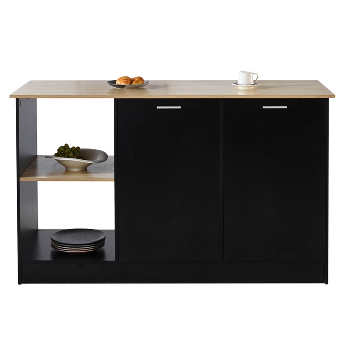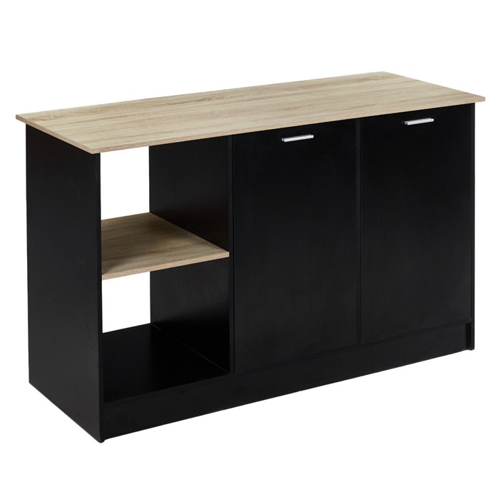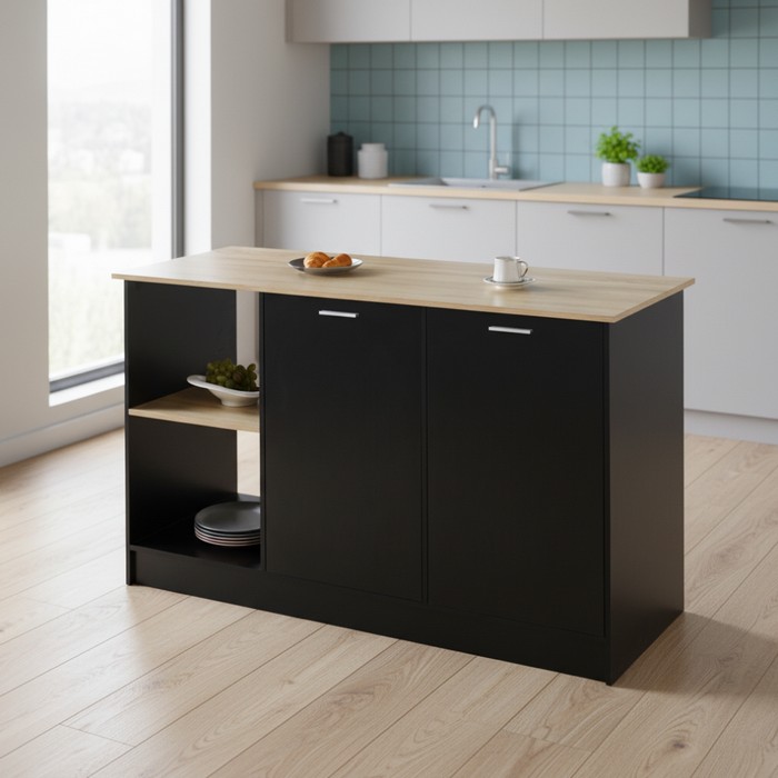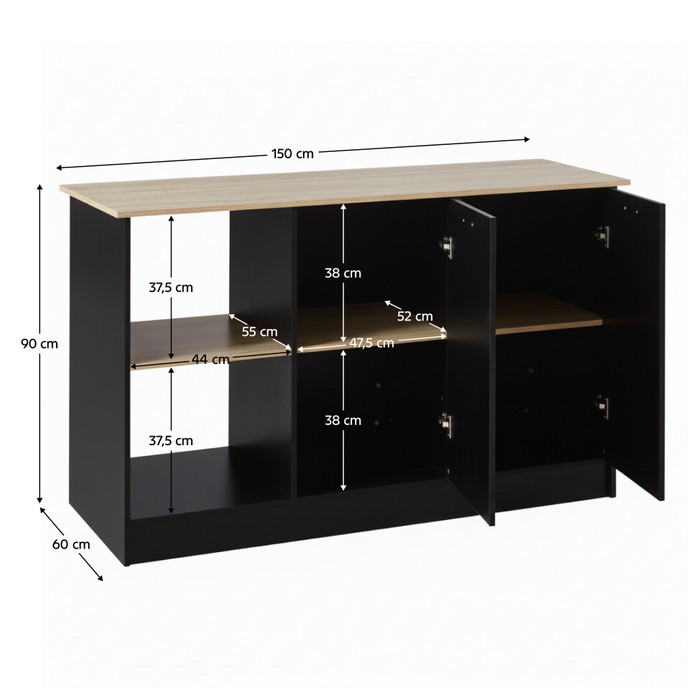 Kuchynský ostrovček POMPEJ je štýlovým a praktickým doplnkom, ktorý sa hodí do modernej kuchyne a zároveň rozšíri pracovnú aj úložnú plochu. Konštrukcia je vyrobená z laminovanej MDF v kombinácii s kovom, pričom farebné prevedenie dub a čierna pôsobí elegantne a nadčasovo. Priestranná pracovná doska poskytuje dostatok miesta na prípravu jedál, servírovanie aj každodenné činnosti. Ostrovček má rozmery (ŠxHxV): 150x60x90 cm a hrúbka pracovnej dosky je 1,4 cm. Celková nosnosť dosahuje 120 kg. Úložný priestor je riešený kombináciou otvorených políc a uzavretej dvojdverovej skrinky, ktorá ponúka praktické uskladnenie kuchynských potrieb. Rozmery vnútorných políc sú (ŠxHxV): 47,5x52x38 cm a rozmery ďalších políc sú (ŠxHxV): 44x55x37,5 cm. Nosnosť každej police je 5 kg. Dvierka sú vybavené plastovými úchytkami v striebornej farbe, ktoré uľahčujú manipuláciu. Je dodávaný v demonte a vďaka svojmu praktickému vyhotoveniu a modernému dizajnu predstavuje spoľahlivé riešenie pre každú domácnosť.