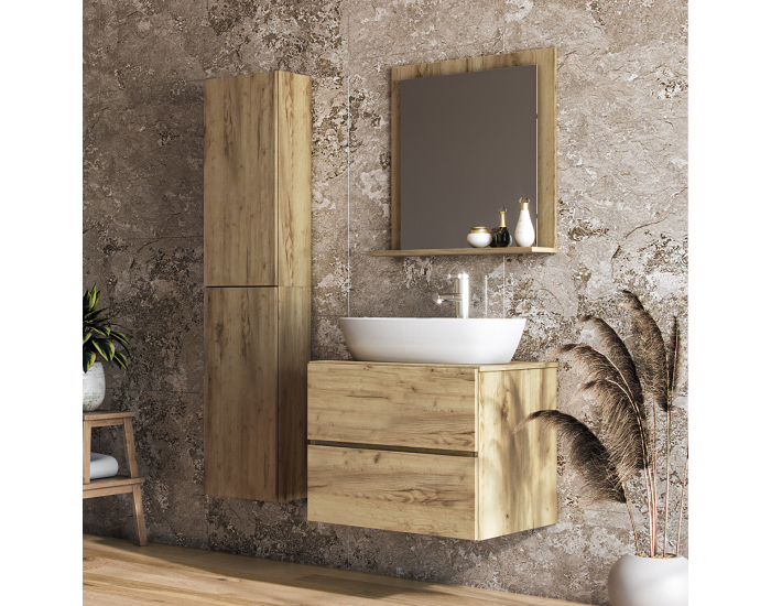 Kúpeľňová skrinka na stenu (2 ks) BALETA 2S poskytne mimoriadny úložný priestor pre všetky uteráky, kozmetické prípravky a iné drobnosti, ktoré v kúpelni nesmú chýbať. Komplet dvoch rovnakých skriniek zo sebou nesie veľké výhody v ich zavesení na stenu. Môžete ich zavesiť zvisle vedľa seba, prípadne medzi ne zavesiť zrkadlo. Veľmi pekne pôsobia zavesené zvisle pod sebou, v tomto variante vyrerajú ako jedna vysoká skrinka, ktorá dodáva priestoru v kúpelni dôstojný vzhľad. Keďže skrinky sú závesné, priestor pod nimi ostane otvorený a tak sa uľahčí čistenie podlahy. Každá skrinka je vyrobená zo 16 mm hrubej kvalitnej drevotriesky a je orientovaná zvyslo na výšku. Disponuje otváracími dvierkami na silných závesoch, ktoré sa dajú namontovať pre otváranie do obidvoch strán a dokonca sú obohatené otváracím systémom TIP ON. Vo vnútri každej skrinky nájdete jednu poličku. Rozmery jednej skrinky sú (ŠxHxV): 32,6x21,7x75,6 cm. Veľmi pekný vzhľad im dodáva prevedenie craft zlatý, ktoré nádherne ukáže aj na ostatných prvkoch rady Baleta, ktoré spolu tvoria veľmi pekný celok a ten dodá Vašej kúpeľni ten správny šmrnc.