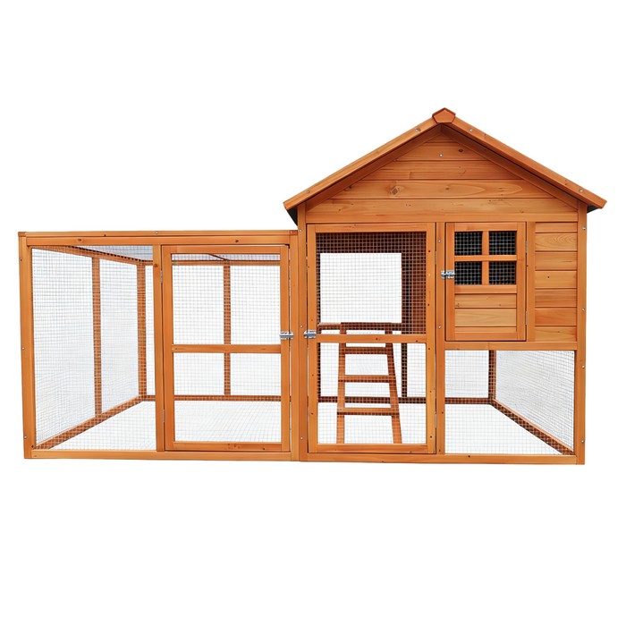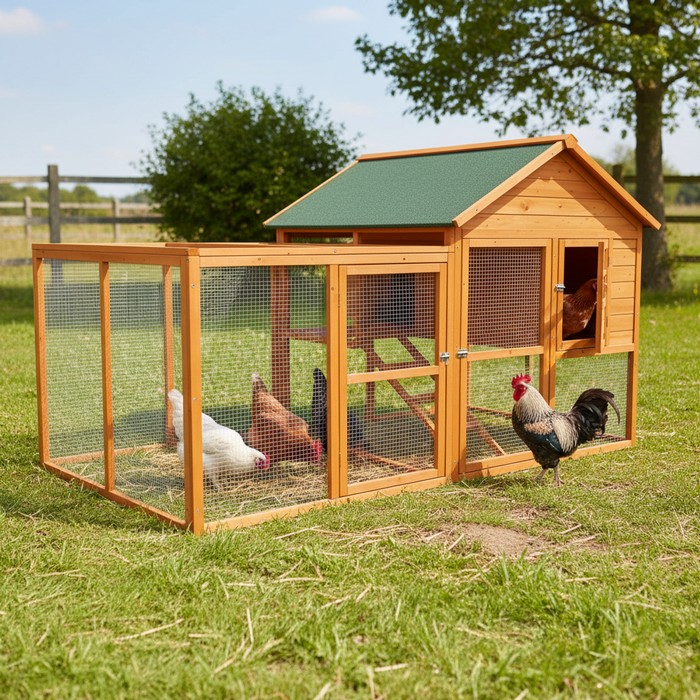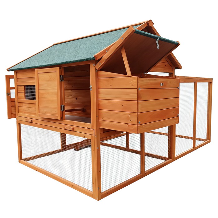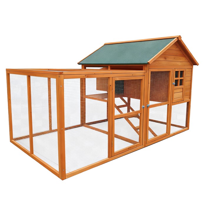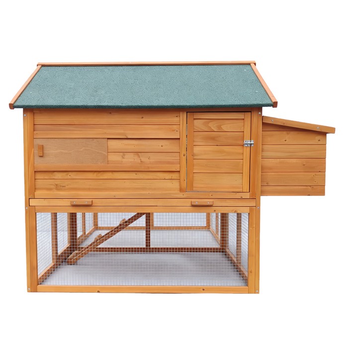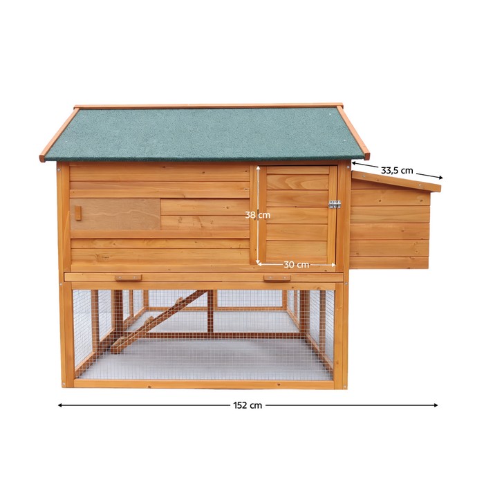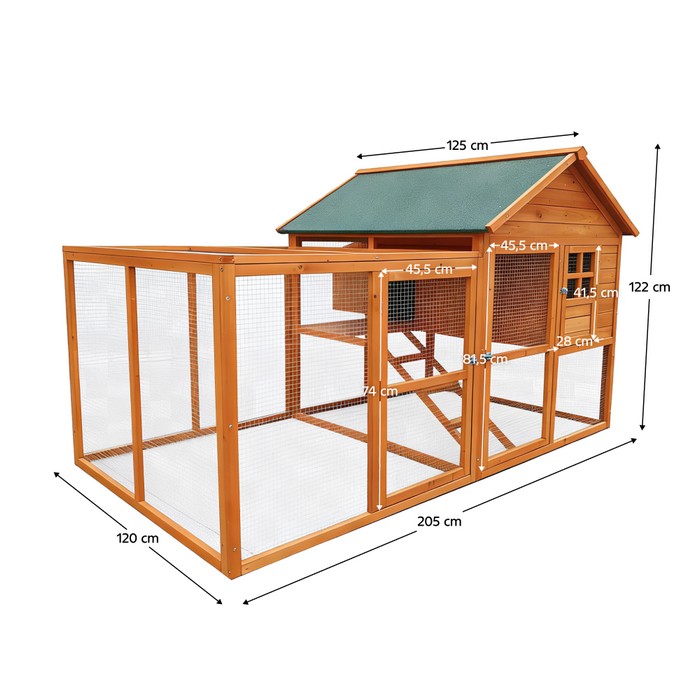 Kurín KAMEO je vyrobený z kvalitného jedľového dreva v hnedej farbe, ktoré je doplnené pozinkovaným oceľovým pletivom a zelenou strechou z asfaltovej plste zabezpečujúcou ochranu pred dažďom, vetrom, snehom aj mrazom. Celkové rozmery kurína sú (ŠxHxV): 205x152x122 cm a jeho stabilná konštrukcia je navrhnutá tak, aby poskytovala bezpečné a komfortné podmienky pre domáci chov. Súčasťou kurína je praktická rampa s rozmermi (ŠxH): 80x25 cm, ktorá prepája vyvýšenú oddychovú časť s priestranným výbehom. Pozinkované pletivo s hrúbkou 0,6 mm pomáha chrániť zvieratá pred vniknutím predátorov. Uzatvárateľné dvere sú vybavené zásuvnou západkou z nehrdzavejúcej ocele, ktorá zvyšuje bezpečnosť celého priestoru. Údržbu kurína uľahčuje výsuvné dno s rozmermi (ŠxHxV): 45,5x108x3 cm, umožňujúce rýchle a hygienické čistenie. Praktický bočný box na vajíčka so sklápacou strechou s rozmermi (ŠxHxV): 36x46x34 cm zabezpečuje pohodlný zber vajec bez nutnosti vstupu do výbehu. Kurín poskytuje ideálne podmienky na odpočinok, znášanie vajec aj voľný pohyb zvierat. Model je vhodný pre sliepky aj králiky a jeho kapacita je približne 9 až 11 sliepok. Pre maximálnu stabilitu je potrebné kurín umiestniť na rovný povrch a odporúča sa jeho ukotvenie do zeme. Produkt je dodávaný v demonte.