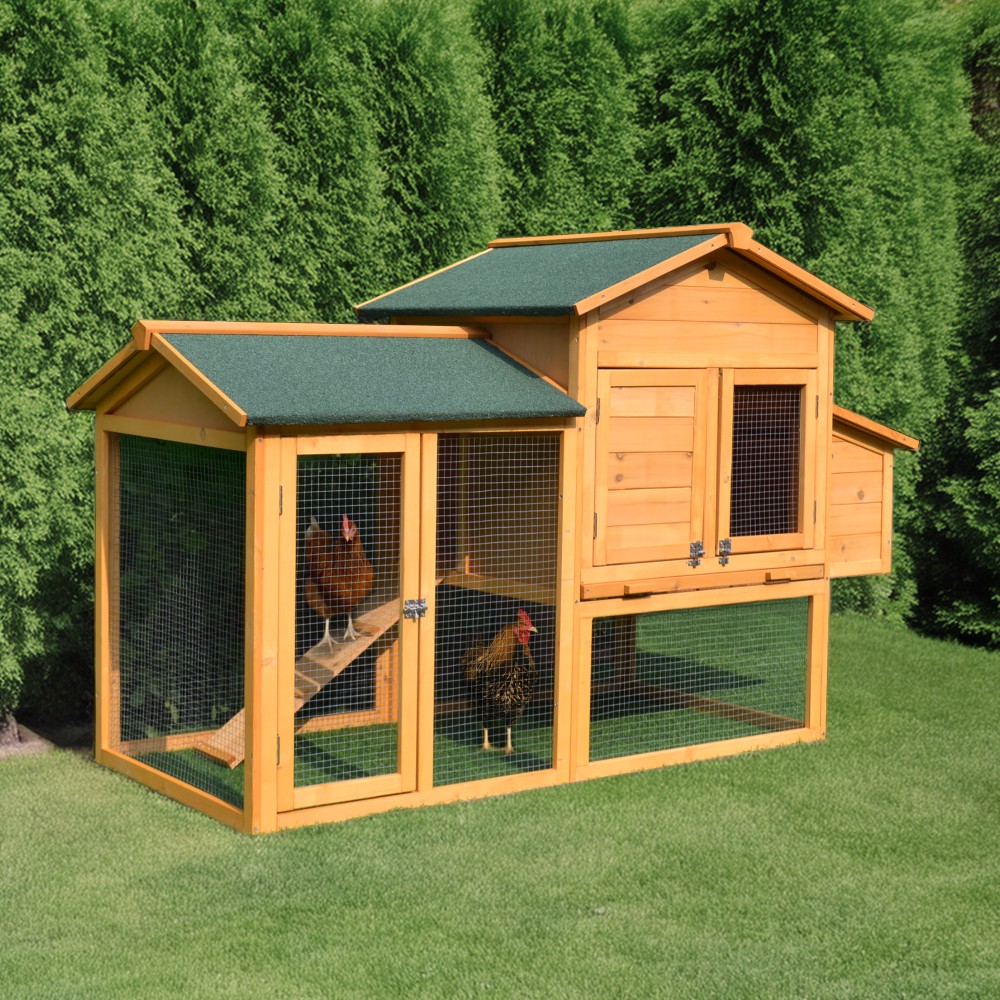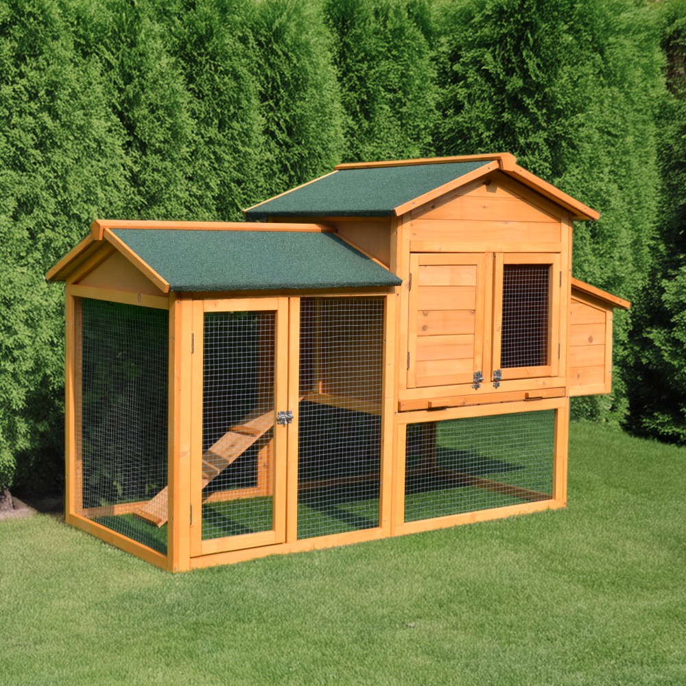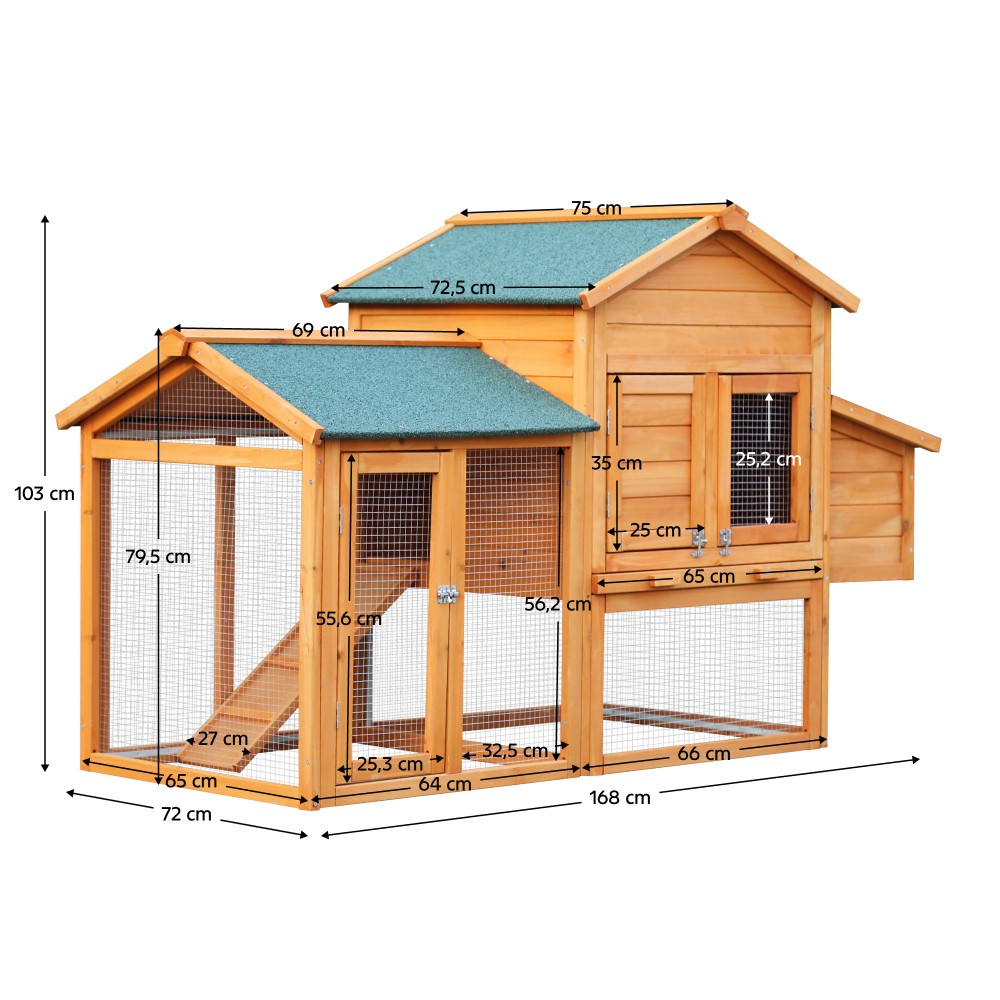 Kurín pre sliepky PIPON predstavuje ideálne riešenie pre každého chovateľa, ktorý hľadá bezpečný, komfortný a funkčný domov pre svoju hydinu či malé zvieratá. Je vyrobený z kvalitného jedľového dreva, doplneného o pevné pletivo z pozinkovanej ocele s hrúbkou 0,6 mm, ktoré poskytuje ochranu pred predátormi. Vďaka streche z asfaltovej plste v zelenej farbe je interiér kurína účinne chránený pred dažďom, vetrom, snehom aj mrazom, čím sa zabezpečujú vhodné podmienky v každom počasí. Kurín ponúka priestranný výbeh, kde majú sliepky dostatok miesta na pohyb, odpočinok aj kŕmenie. Pomocou rampy s rozmermi (ŠxHxV): 54x27x2 cm sa ľahko dostanú na horné poschodie, ktoré slúži ako pokojné miesto na odpočinok a znášanie vajec. Bočný box so sklápacou strechou im zabezpečuje tiché prostredie pre znášanie, pričom prístup k vajíčkam je jednoduchý a pohodlný. Jednoduchú údržbu zabezpečuje výsuvné dno s rozmermi 76x65x2 cm - po jeho vytiahnutí ho stačí vyčistiť a znova zasunúť naspäť. Bezpečnostné prvky ako zasúvacie západky z nerezového železa na dvierkach chránia zvieratá pred neželanými návštevníkmi a udržia ich v bezpečí po celý deň aj noc. Kurín je vhodný nielen pre sliepky (kapacita cca 4 - 5 kurčiat), ale aj pre iné menšie zvieratá, ako sú napríklad králiky. Nepotrebuje kotvenie do zeme, no mal by byť umiestnený na rovnom povrchu. Je dodávaný v demontovanom stave, čo umožňuje jednoduchú manipuláciu a montáž. Kurín Pipon ponúka všetko, čo vaše zvieratá potrebujú - bezpečie, komfort, ochranu pred počasím a praktickosť pre chovateľa. Skvelá voľba pre každého, komu záleží na pohode a zdraví svojich zvierat.