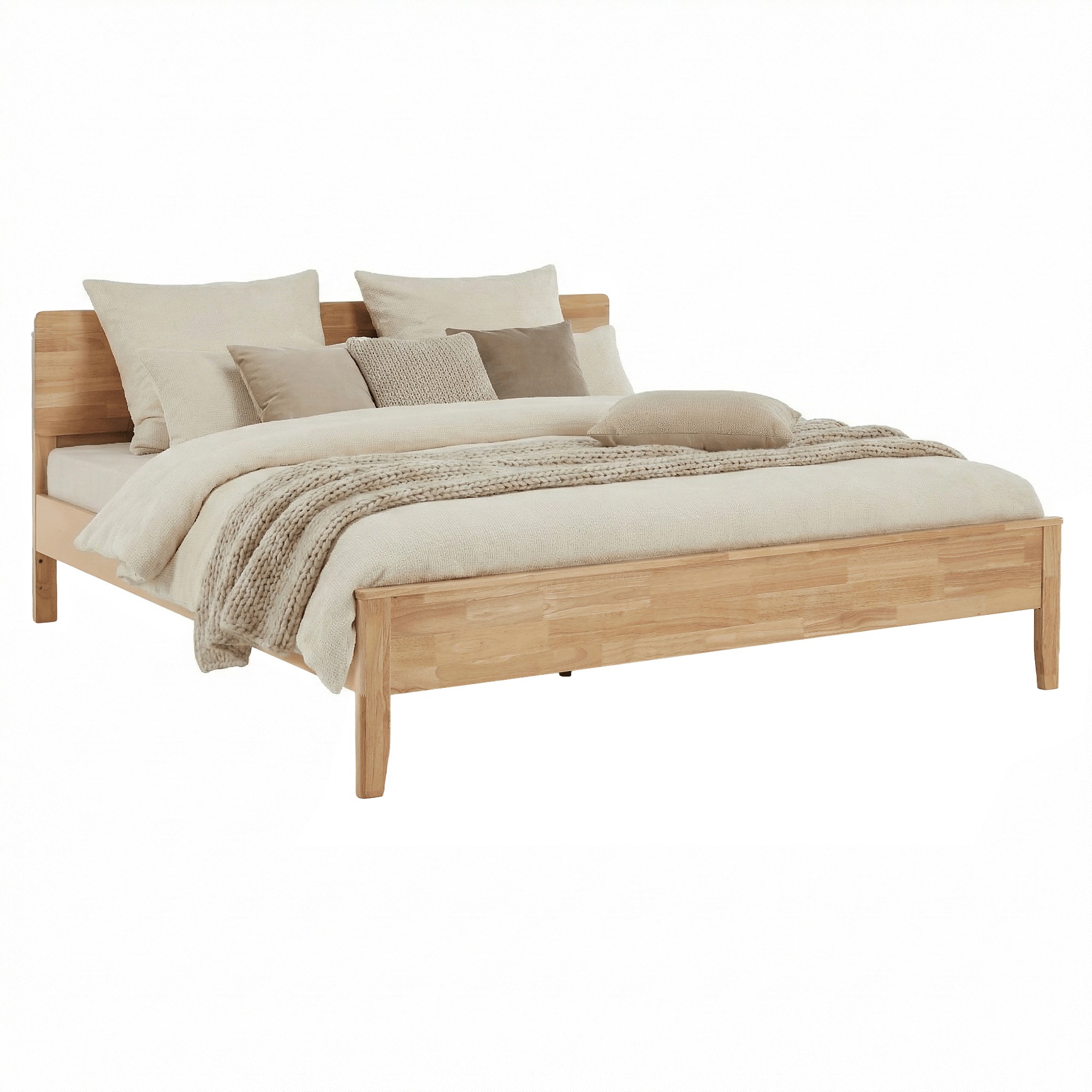 Manželská posteľ NOEMI poskytuje vysoký komfort a vytvára príjemné miesto určené na pokojný spánok, oddych aj relax po náročnom dni. Je vyrobená z kvalitného kaučukového dreva v prírodnom odtieni, ktoré zabezpečuje pevnosť, stabilitu a dlhú životnosť. Povrch masívneho dreva je ošetrený lakom, ktorý drevo chráni a zároveň zvýrazňuje jeho prirodzenú kresbu. Celkový vzhľad postele dopĺňajú štýlové nožičky, na ktorých je konštrukcia postavená. Posteľ sa dodáva spolu s roštom, ktorý je tvorený husto uloženými borovicovými lamelami, tie poskytujú matracu optimálnu oporu a prispievajú k pohodlnému spánku. Model sa dodáva bez matraca, pričom odporúčaný rozmer matraca je 160x200 cm. Celkové rozmery postele sú (ŠxHxV) 167,5x207x87,5 cm a plocha na spanie má rozmer 160x200 cm. Výška rámu postele je 41,5 cm a maximálna nosnosť je 150 kg na jednu osobu. Rošt obsahuje borovicové laty s hrúbkou 1,4 cm a šírkou 7 cm, pričom medzera medzi jednotlivými latami je 4,5 cm. Matrac je možné zapustiť do hĺbky približne 2 cm. Posteľ sa dodáva bez matraca, vankúšov, nočných stolíkov a dekorácií. Dodanie je v demontovanom stave, preto je potrebná montáž