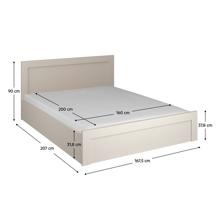 Posteľ KAROS 160x200 je vyrobená z laminovanej DTD s hrúbkou 1,6-3,2 cm a prichádza v modernom prevedení kašmír, ktoré dodá spálni elegantný vzhľad. Ponúka priestrannú plochu na spanie 160×200 cm, pričom jej celkové rozmery sú (ŠxHxV): 167,5x207x90 cm. Praktickým prvkom je veľký úložný priestor ukrytý pod lôžkom. Jednoduchý prístup zabezpečuje výklopný lamelový rošt s plynovými piestami. Výška po rošt je 20 cm a zapustenie matraca je 12 cm, pričom odporúčaná minimálna výška matraca je 13 cm. Posteľ sa dodáva bez matraca, s možnosťou dokúpenia z našej ponuky. Nosnosť postele je 90 kg na osobu. Zaujme moderným dizajnom, dodáva sa v monte a je dostupná len na objednávku s dodacou lehotou približne 3-5 týždňov.