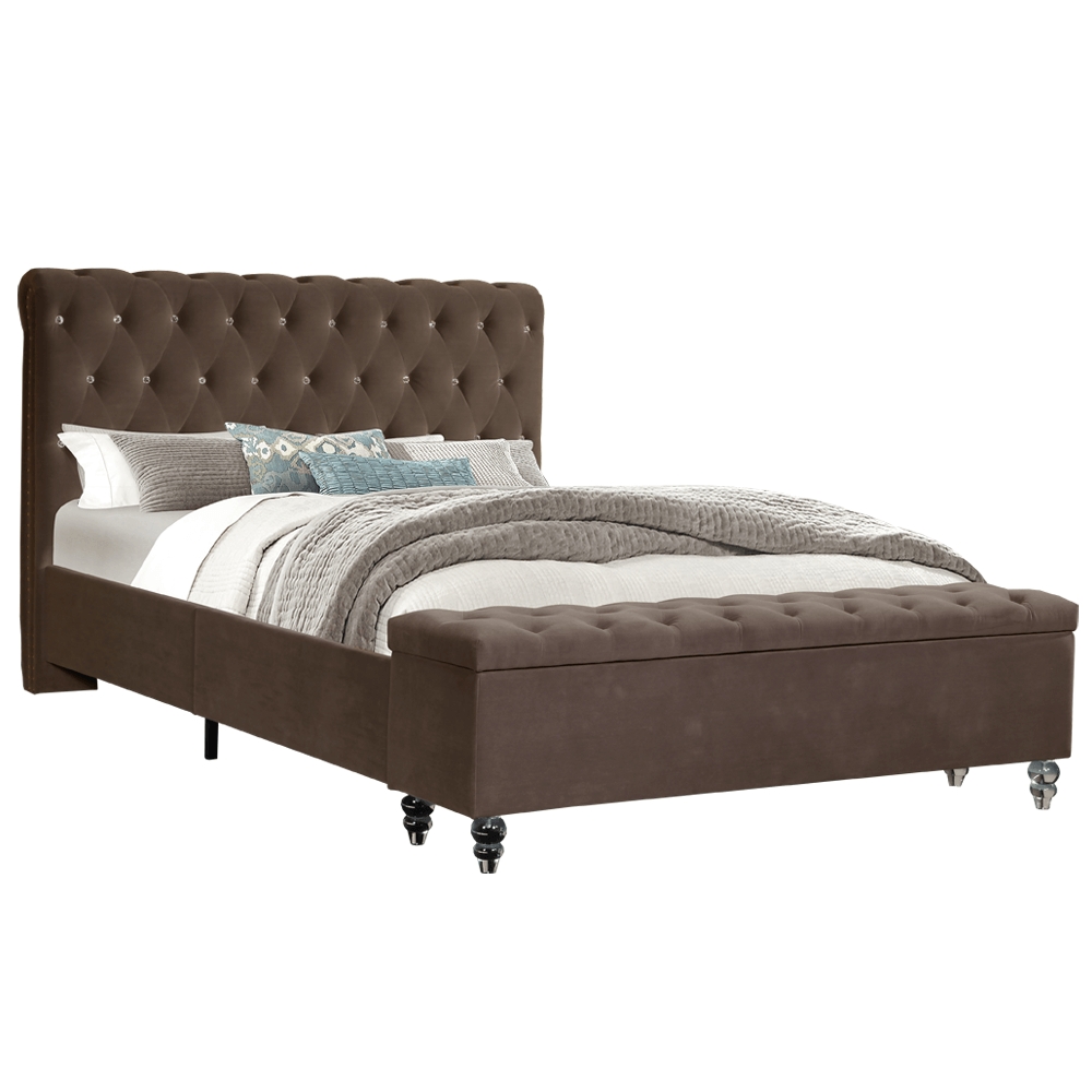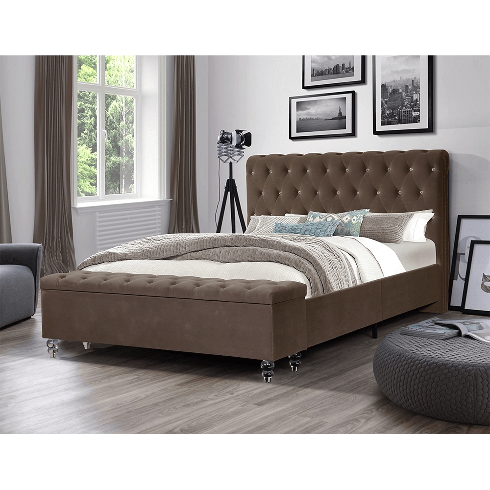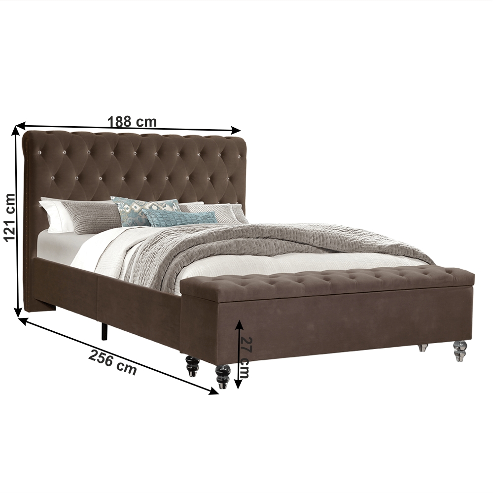 Doprajte si oddych po celom namáhavom dni s manželskou posteľou s roštom a úložným priestorom ANGALA. Rozmery postele sú (ŠxHxV): 188x256x121 cm, pričom rozmery lôžka sú (ŠxH): 180x200 cm. Výška po rošt je 27 cm. Predné čelo tvorí prešívaná lavica, ktorá po otvorení ponúka úložný priestor. Stabilitu posteli dodávajú akrylové číre nohy v neobyčajnom tvare. Hnedé farebné prevedenie krásne ladí k posteli a vnáša do interiéru eleganciu. Luxus posteli dodávajú ozdobné krištále v čele postele. Čalúnená je látkou Velvet, ktorá je príjemná na dotyk. Posteľ aj sama o sebe ponúka úložný priestor, ktorý nájdete po vyklopení lamelového roštu. Ten je dodávaný k posteli. Dodávaná je v demonte bez matraca, ktorý je možné zakúpiť z našej ponuky.