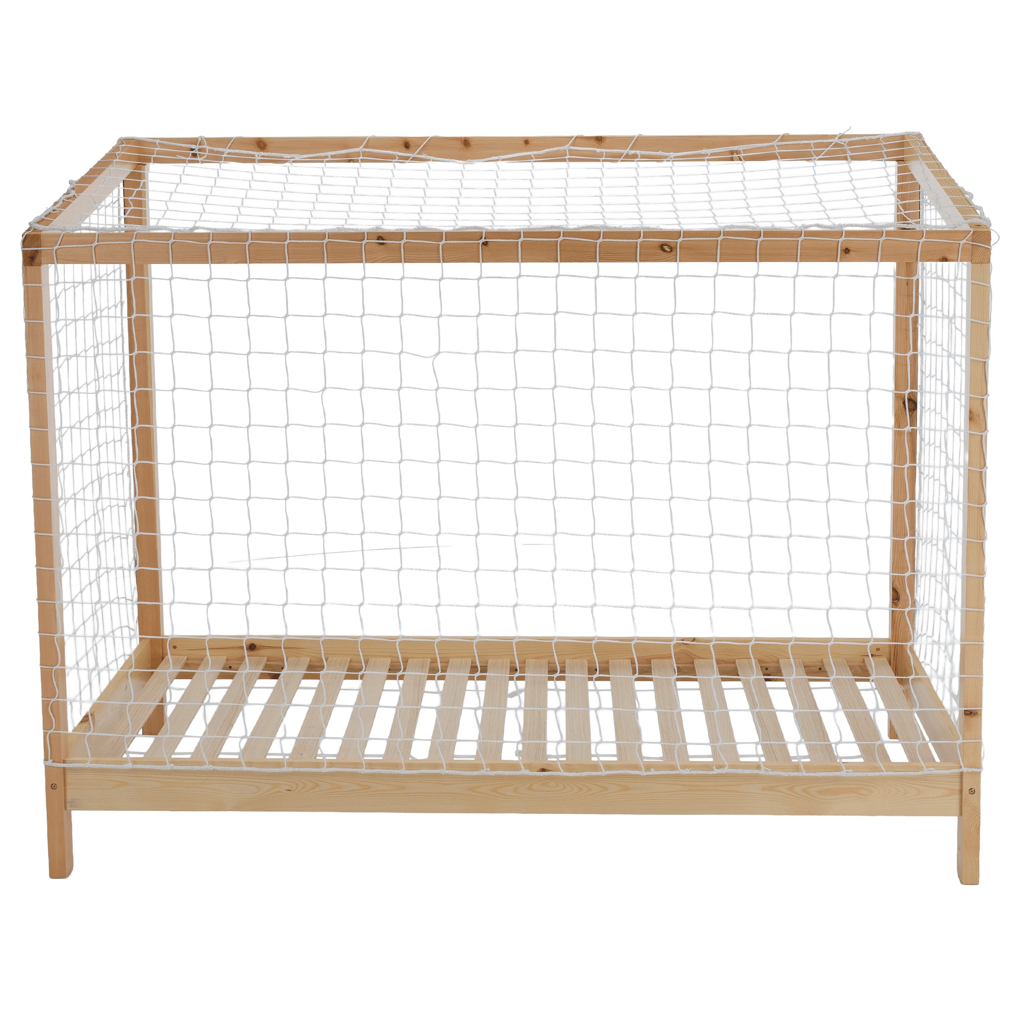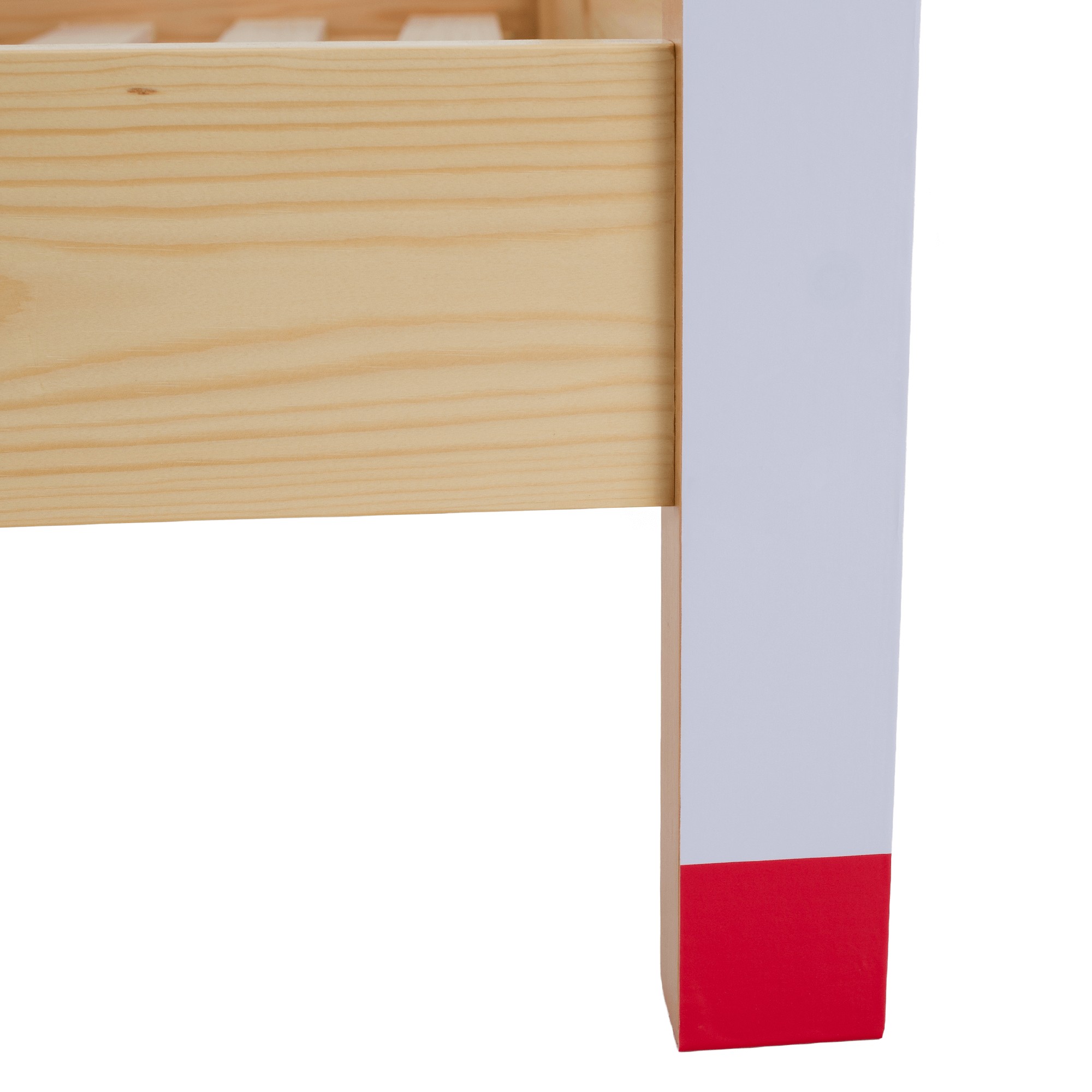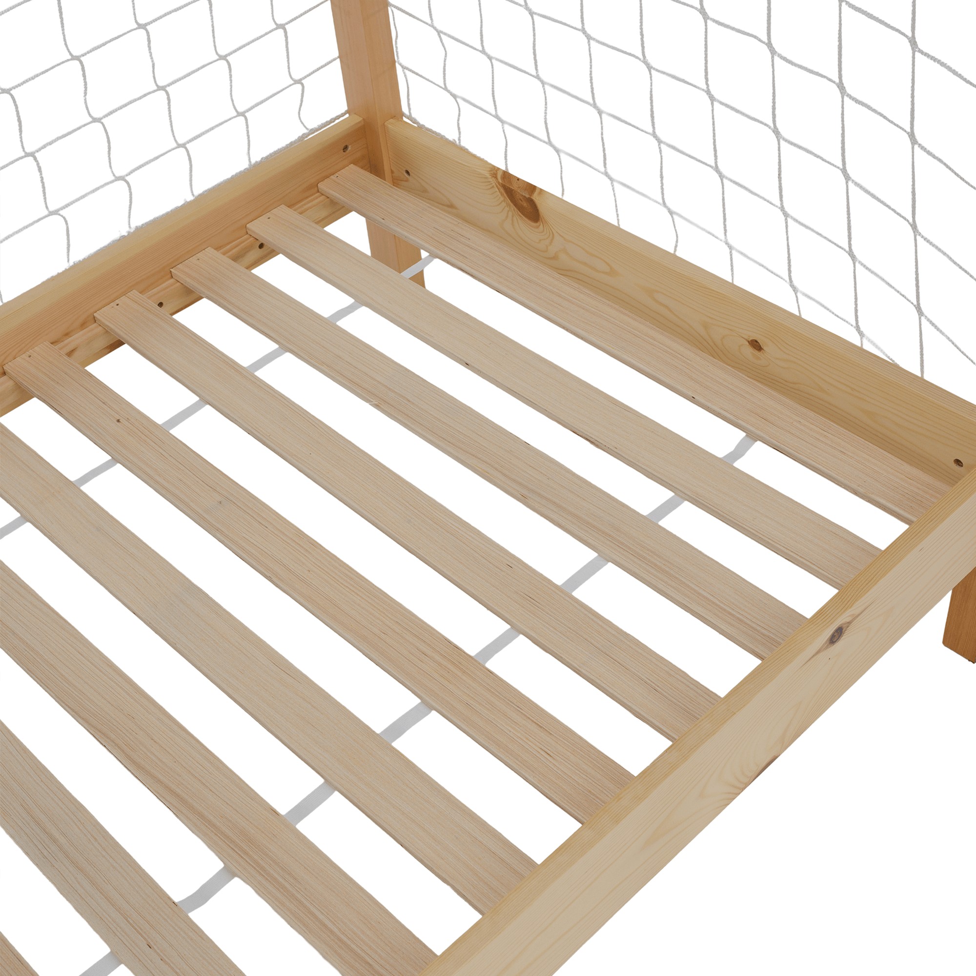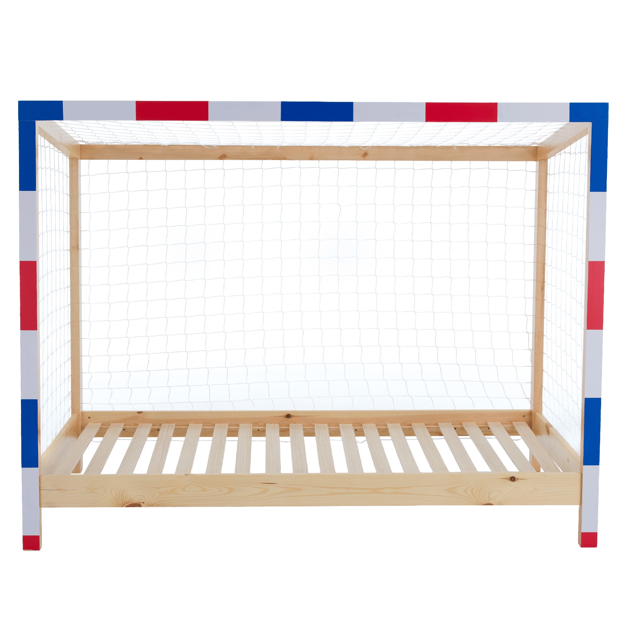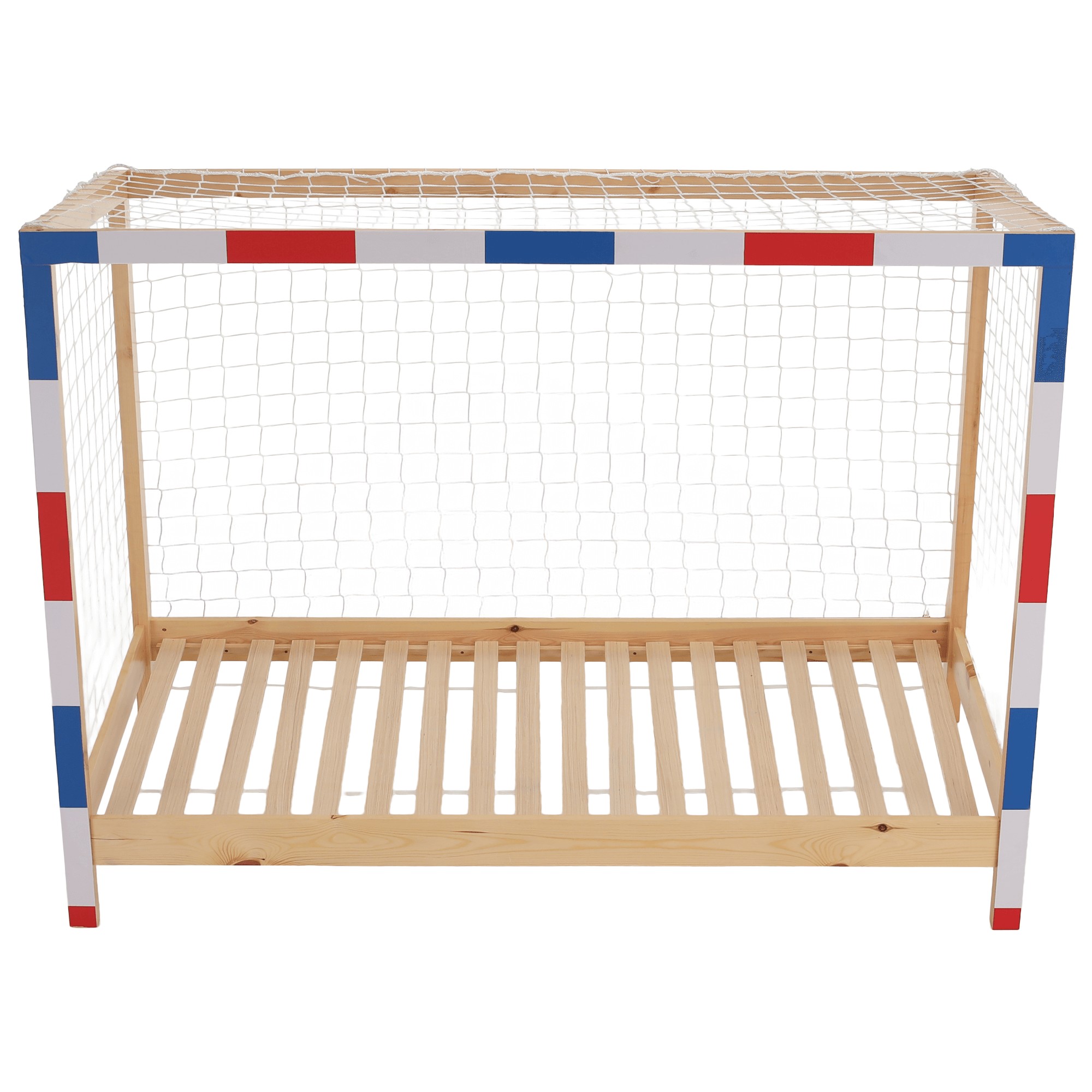 Montessori posteľ FUTAL v tvare futbalovej brány je skvelou voľbou pre malých milovníkov futbalu. Spája hravosť, štýlový dizajn a funkčnosť, pričom poskytuje priestor nielen na spánok, ale aj na snívanie o veľkých športových úspechoch. Vyrobená je z kvalitného borovicového masívu v prírodnom prevedení, ktorý zaručuje pevnosť a dlhú životnosť. Predná časť v kombinácii bielej, modrej a červenej farby dotvára autentický futbalový vzhľad. Nechýba ani biela sieť, ktorá dodáva posteli jedinečný charakter. Posteľ sa dodáva s rolovaným preglejkovým roštom, bez matraca. Odporúčame k nej dokúpiť pružinový matrac s rozmermi 90x200 cm. Celkové rozmery postele sú (ŠxHxV): 206x96x165 cm, pričom plocha na spanie má štandardný rozmer 90x200 cm. Konštrukcia má hrúbku 2 cm, výška bočnice je 12 cm a zadná časť dosahuje 149 cm. Rošt je uložený vo výške 22 cm a posteľ stojí na nožičkách vysokých 16 cm. Maximálna nosnosť je 95 kg. Posteľ je dodávaná v demonte spolu s bielou sieťou, s možnosťou doplnenia matraca podľa vlastného výberu. Odporúčaná maximálna výška matraca je 15 cm.