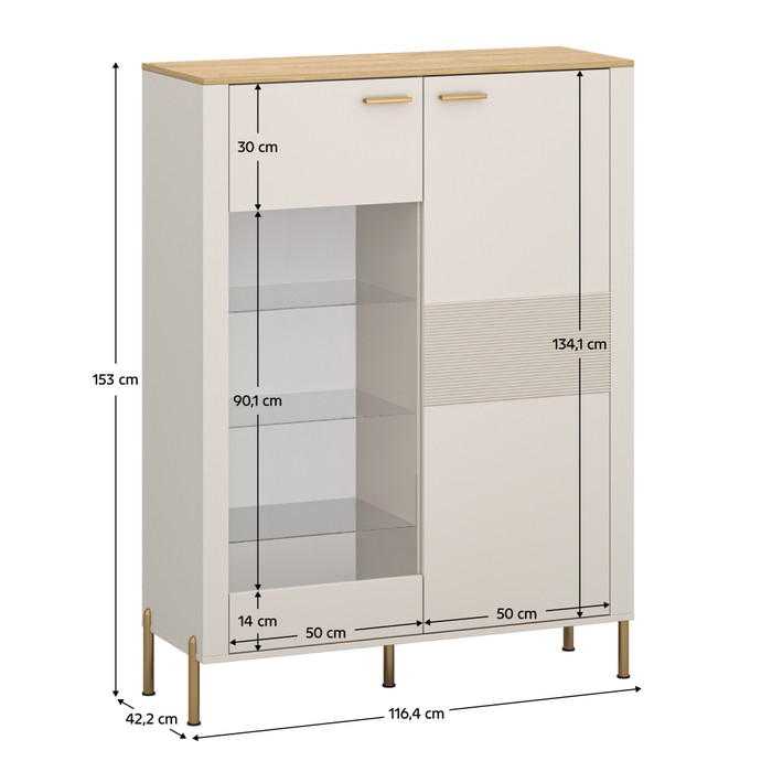 Nízka vitrína RUNOL 1D1W ponúka praktický úložný priestor vo forme políc skrytých za dvierkami, pričom kombinácia plných a sklenených políc dodáva nábytku elegantný vzhľad. Predná časť vitríny je doplnená o sklenenú výplň, ktorá zvýrazňuje vystavené dekorácie či riad. Dvierka sa otvárajú pomocou kovových úchytiek v zlatej farbe, čo umocňuje luxusný charakter. Vitrína je vyrobená z kvalitnej laminovanej DTD, fóliovanej MDF, PVC a skla, s farebným prevedením v tónoch kašmír a dub kamenný. Predné plochy sú zdobené dekoratívnym frézovaním, ktoré dodáva celému kusu moderný aj štýlový nádych. Hrúbka materiálu je 1,6 cm. Konštrukcia stojí na pevných kovových nožičkách vysokých 15 cm, rovnako v zlatej farbe. Každá polica má nosnosť 3 kg. Celkové rozmery vitríny sú (ŠxHxV): 116,4x42,2x153 cm. Vitrína sa dodáva bez LED osvetlenia, no je možné ho dokúpiť z našej ponuky pre ešte efektnejšie podsvietenie. Pre bezpečnú stabilitu odporúčame nábytok pripevniť k stene. Produkt je dostupný len na objednávku, s dodacou lehotou 3 - 5 týždňov, a dodáva sa v demonte, pripravený na montáž.
