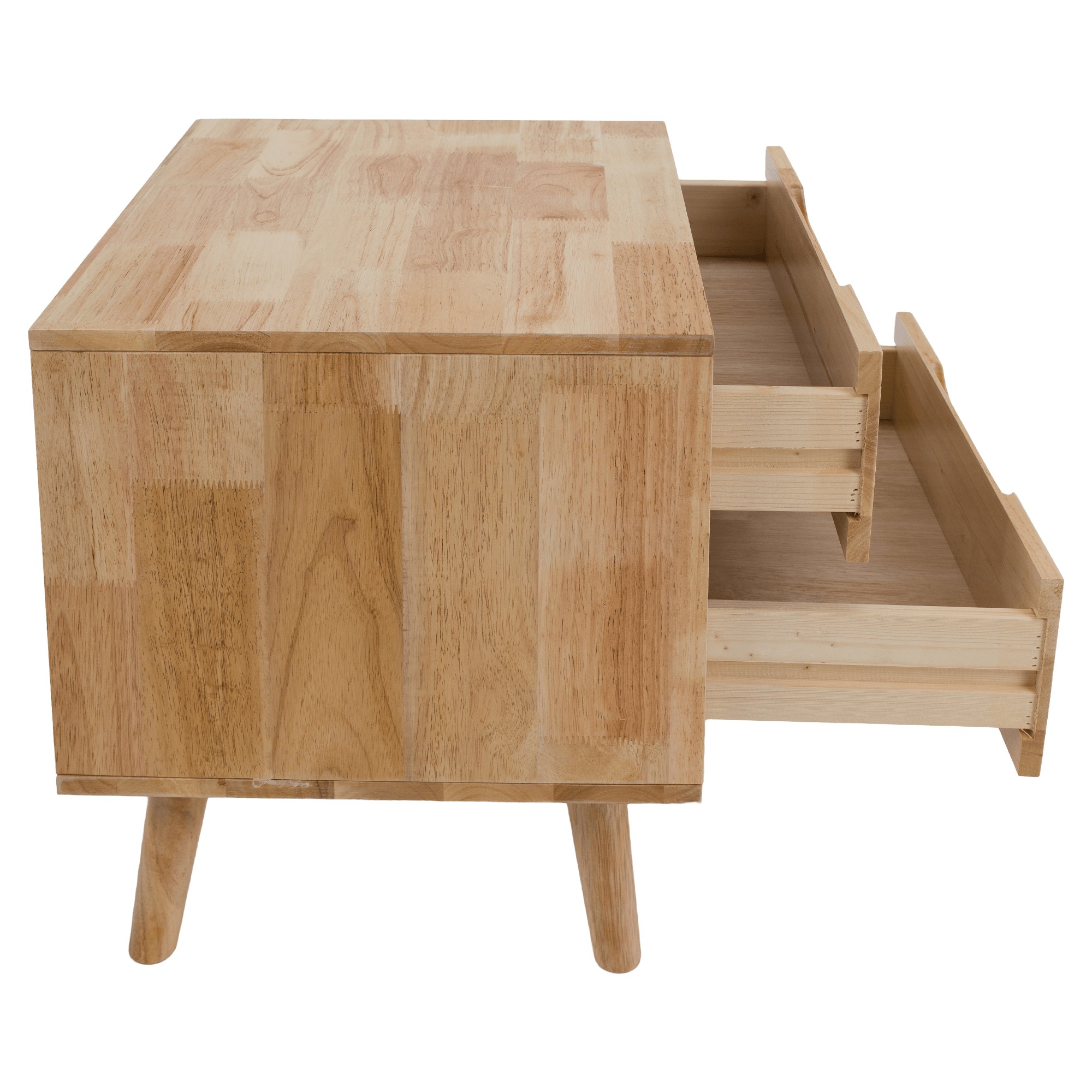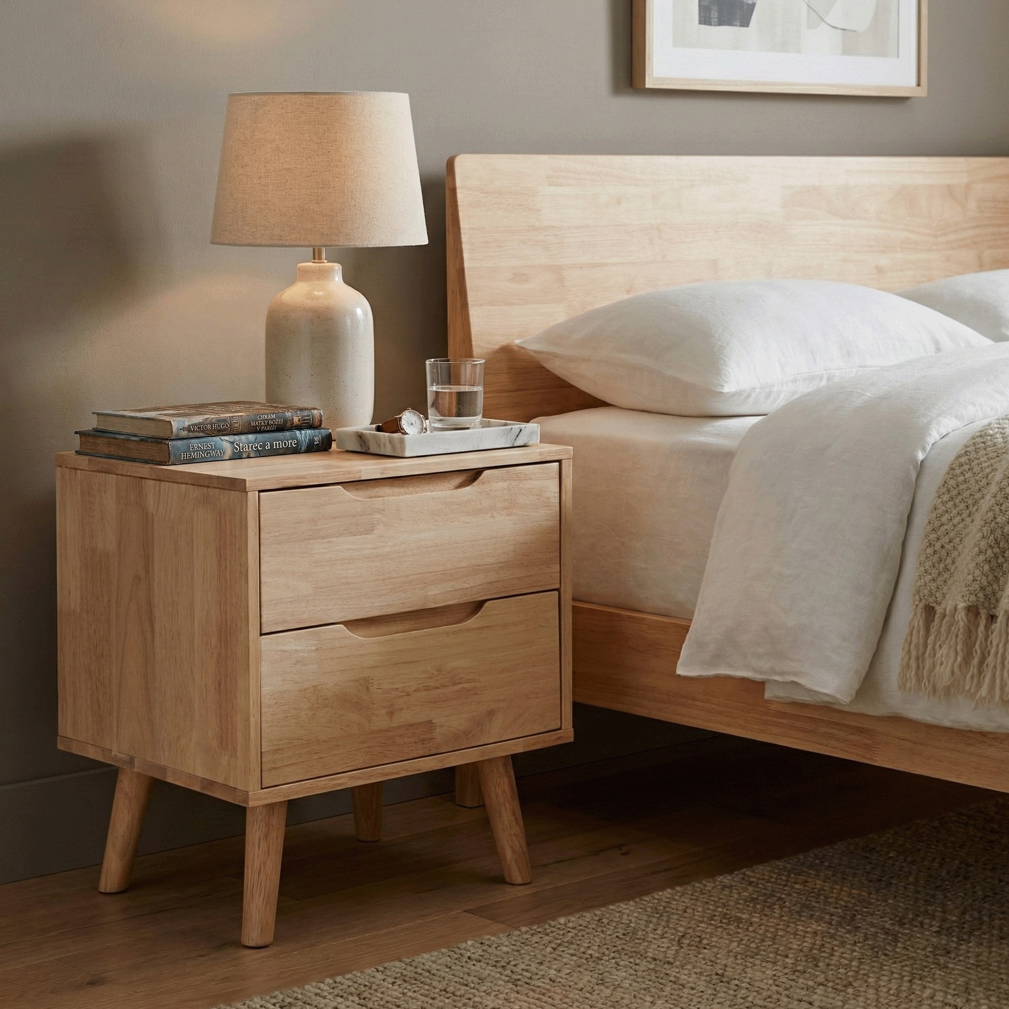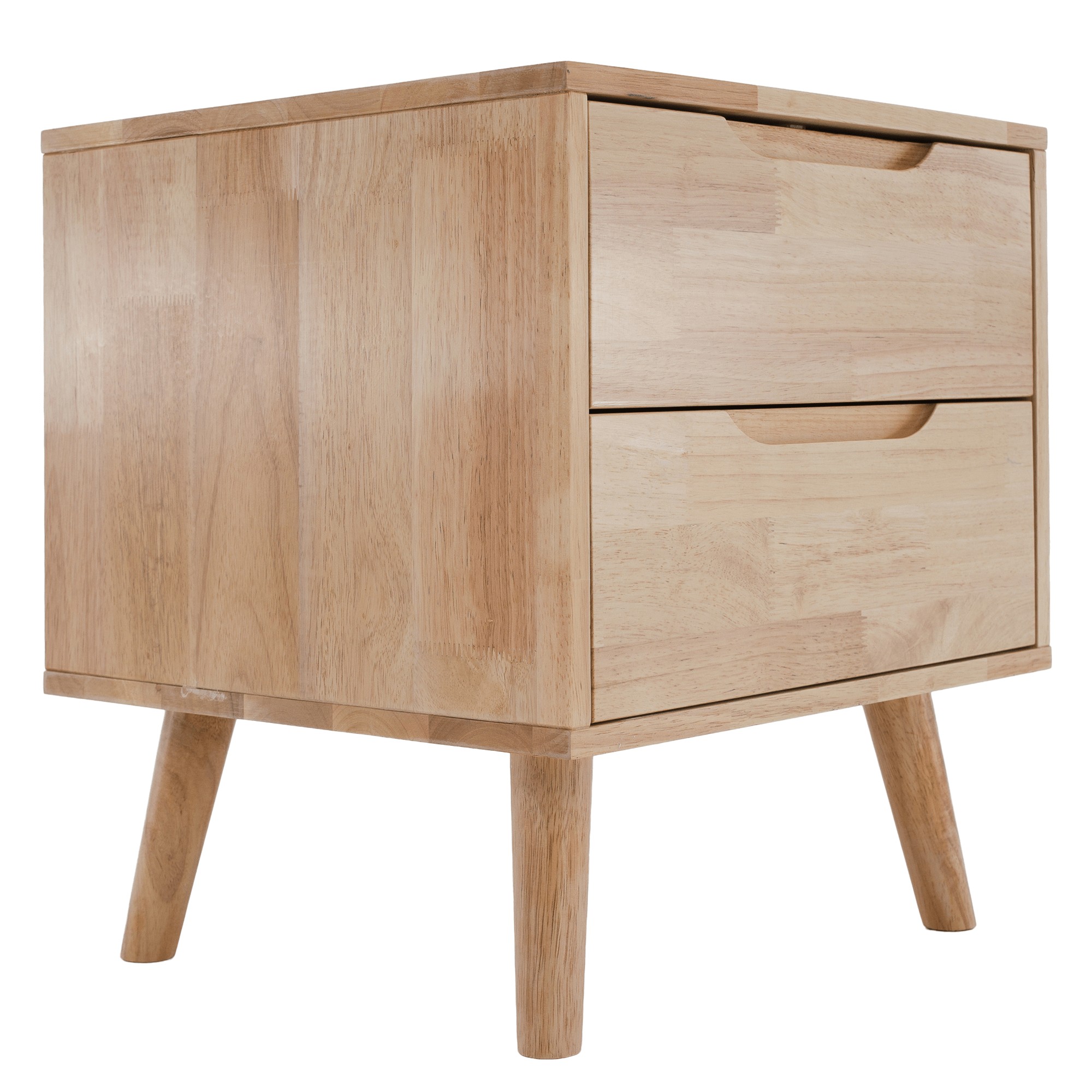 Nočný stolík BRUNI je štýlový a funkčný doplnok, ktorý dokonale doplní vašu spálňu. Jeho kompaktný dizajn umožňuje umiestnenie aj do menších priestorov, pričom stále poskytuje dostatok úložného priestoru v dvoch zásuvkách, do ktorých si môžete odložiť všetko potrebné. Vrchnú plochu stolíka môžete využiť na lampu, dekorácie alebo predmety, ktoré chcete mať počas noci vždy poruke. Stolík je vyrobený z kombinácie odolného kaučukového dreva, ktoré tvorí rám a nožičky, a borovicového dreva použitého na zásuvky, pričom celé prevedenie je v prírodnom tóne, ktorý dodáva nábytku nadčasový vzhľad. Zásuvky nemajú klasické úchytky - ich pohodlné otváranie zabezpečujú praktické zafrézované úchyty, a stabilitu stolíka zaručujú pevné nožičky vysoké 15 cm. Má celkové rozmery (ŠxHxV): 43x40,5x48 cm, výšku stolíka 33 cm a dodáva sa v demontovanom stave.