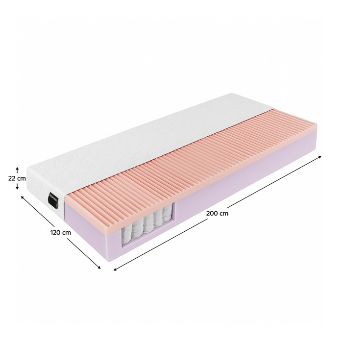 Taštičkový matrac CLOUD 120x200 je ideálnou voľbou pre všetkých, ktorí hľadajú kvalitný spánok, správnu podporu tela a maximálne pohodlie počas celej noci. Matrac má rozmery (ŠxD): 80x200 cm a výšku 22 cm, pričom jeho nosnosť na jednu osobu je 120 kg. Jadro tvorí 7-zónový taštičkový systém s hustotou 220 taštičiek/m2, ktorý poskytuje cielenú podporu jednotlivým častiam tela, od hlavy až po chodidlá, a pomáha udržiavať chrbticu v prirodzenej polohe. Matrac je obojstranný - jedna strana obsahuje komfortnú penu H3 pre stredne tvrdý pocit a druhá strana pevnejšiu penu H4 pre tvrdšie ležanie, takže si môžete jednoducho vybrať tvrdosť podľa svojich potrieb. Poťah Ovata z jemného mikrovlákna (150 g/m2, 100 % polyester) je prešívaný, odzipsovateľný po celom obvode a prateľný pri 40 oC, čo zaručuje jednoduchú údržbu a hygienu. Matrac je certifikovaný podľa Oeko-Tex Standard 100, čo zabezpečuje jeho zdravotnú nezávadnosť a bezpečnosť. Pre optimálny výkon matraca sa odporúča používať latkový alebo lamelový rošt s medzerami maximálne 6 cm. Základ matraca tvoria taštičkové pružiny, ktoré spolu so 7-zónovou profiláciou podporujú ergonomické uloženie tela a pohodlný spánok.