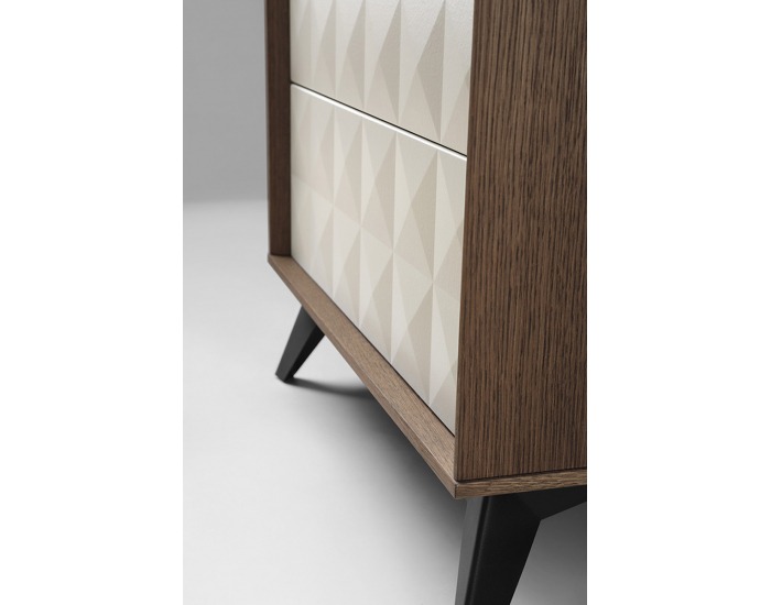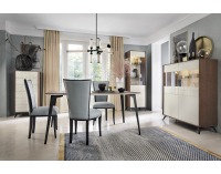 Modernú obývaciu izbu ZOOM si môžete zakúpiť ako zostavu, ktorú tvorí (ŠxHxV): komoda (113,6x43x125 cm), komoda (166,7x43x88 cm), TV stolík (203x43x46,4 cm), polica s osvetlením (130x19x18 cm), zrkadlo (25x2x90 cm), zrkadlo (60x2x90 cm) a konferenčný stolík (100x100x33,6 cm). Kolekcia Zoom je ako stvorená na zariadenie moderných obývačiek či jedální. Jej jednotlivé prvý je možné spolu dokonale kombinovať a vyskladať tak jeden harmonický celok. Jemne načrtnutý dizajn, tenký korpus z čokoládovo hnedého duba Zoom dodáva kolekcii jemnosť, pričom vypuklá štruktúra na predných plochách nadobúda unikátny charakter v prevedení matnej fólie Savana mat. Materiál použitý na jej výrobu je kvalitná prírodná dyha, ktorá sa vyznačuje jednoduchou údržbou. Dvierka a zásuvky sú bez úchytkové, preto disponujú praktickým a nadčasovým systémom otvárania PUSH-TO-OPEN a samodoťahovacím systémom zatvárania.