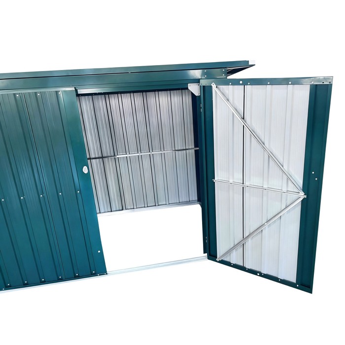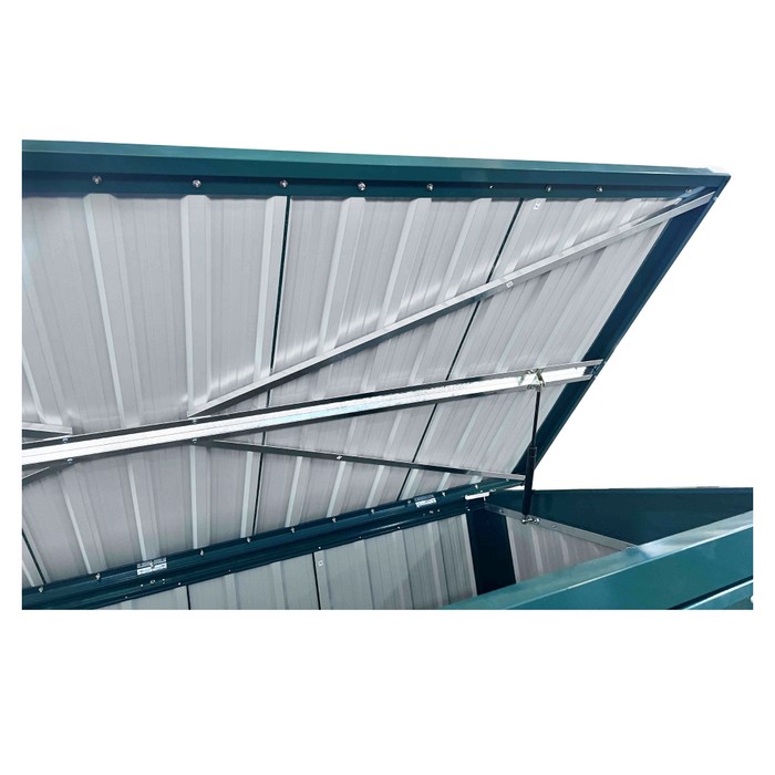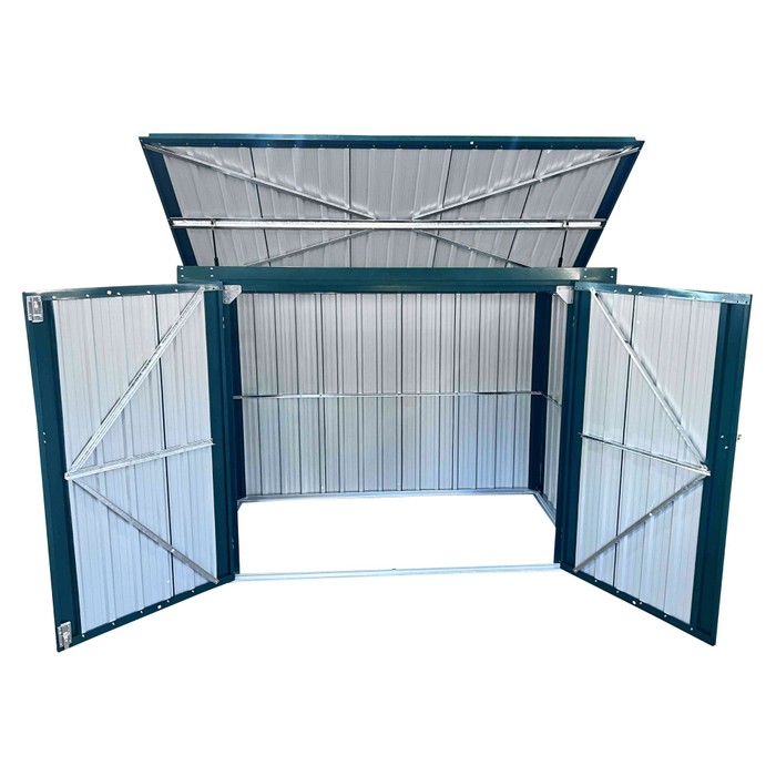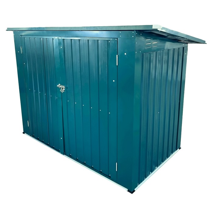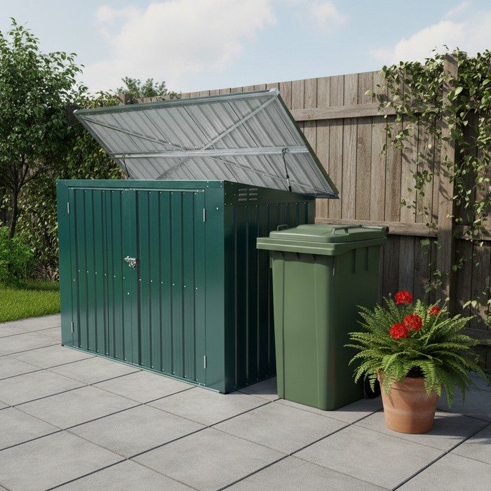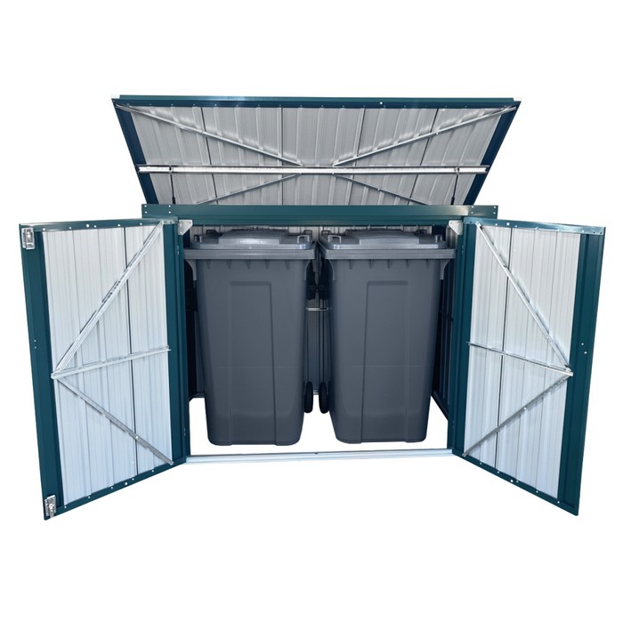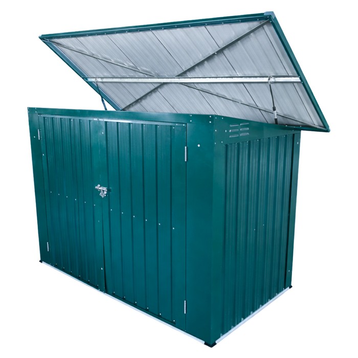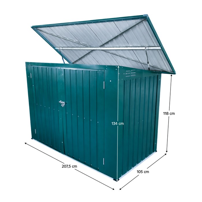 Oceľový box na smetné koše RUBIS predstavuje praktické, odolné a multifunkčné riešenie pre zakrytie odpadkových nádob v exteriéri. Je vyrobený z kvalitnej ocele v zelenom farebnom prevedení, pričom hrúbka materiálu 0,8 mm zabezpečuje vysokú stabilitu, pevnosť a dlhú životnosť aj pri celoročnom používaní. Celkové rozmery boxu sú (ŠxHxV): 207,5x105x118/134 cm, čo poskytuje dostatok priestoru na uloženie dvoch smetných košov. Box je určený pre dva koše s maximálnym objemom 240 litrov, pričom odporúčaný rozmer jedného koša je (ŠxHxV): 74x74x106 cm. Je vybavený horným výklopným vekom, ktoré výrazne uľahčuje vkladanie odpadu aj manipuláciu pri vyprázdňovaní nádob. Predná časť obsahuje praktické dvierka so západkou, ktoré zvyšujú bezpečnosť a stabilitu uložených košov a zároveň umožňujú ich jednoduché vyberanie. Vďaka svojej konštrukcii je box odolný voči dažďu aj UV žiareniu, čím spoľahlivo chráni obsah pred nepriaznivými poveternostnými podmienkami, vetrom aj neželaným prístupom zvierat. Okrem uloženia smetných košov ho možno využiť aj ako prístrešok na záhradné náradie alebo iné vonkajšie vybavenie, čo z neho robí univerzálne riešenie pre rôzne potreby domácnosti. Je praktický, multifunkčný a dodávaný v demonte. Pre zachovanie jeho kvality a predĺženie životnosti sa odporúča výrobok dodatočne chrániť pred nepriaznivými poveternostnými podmienkami.