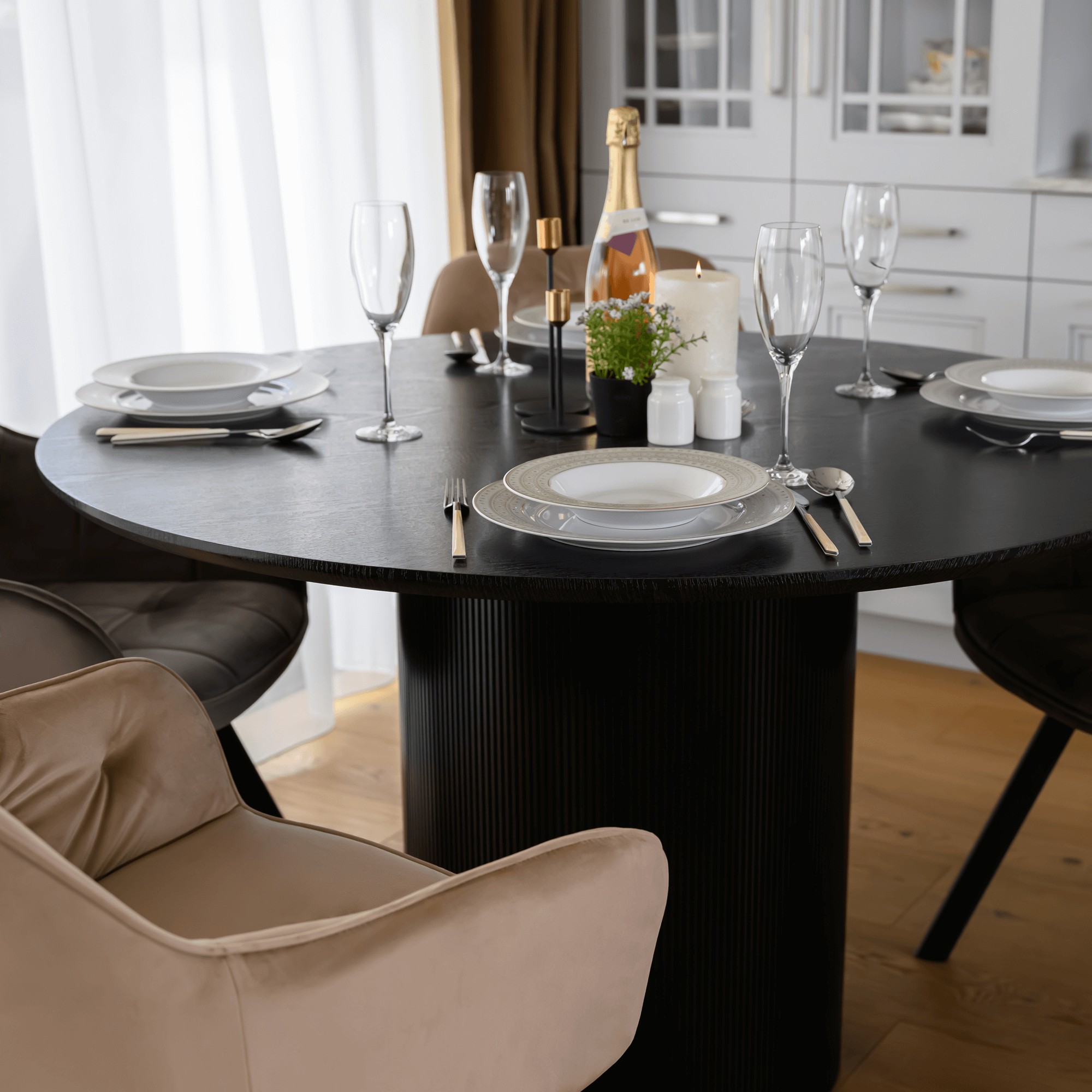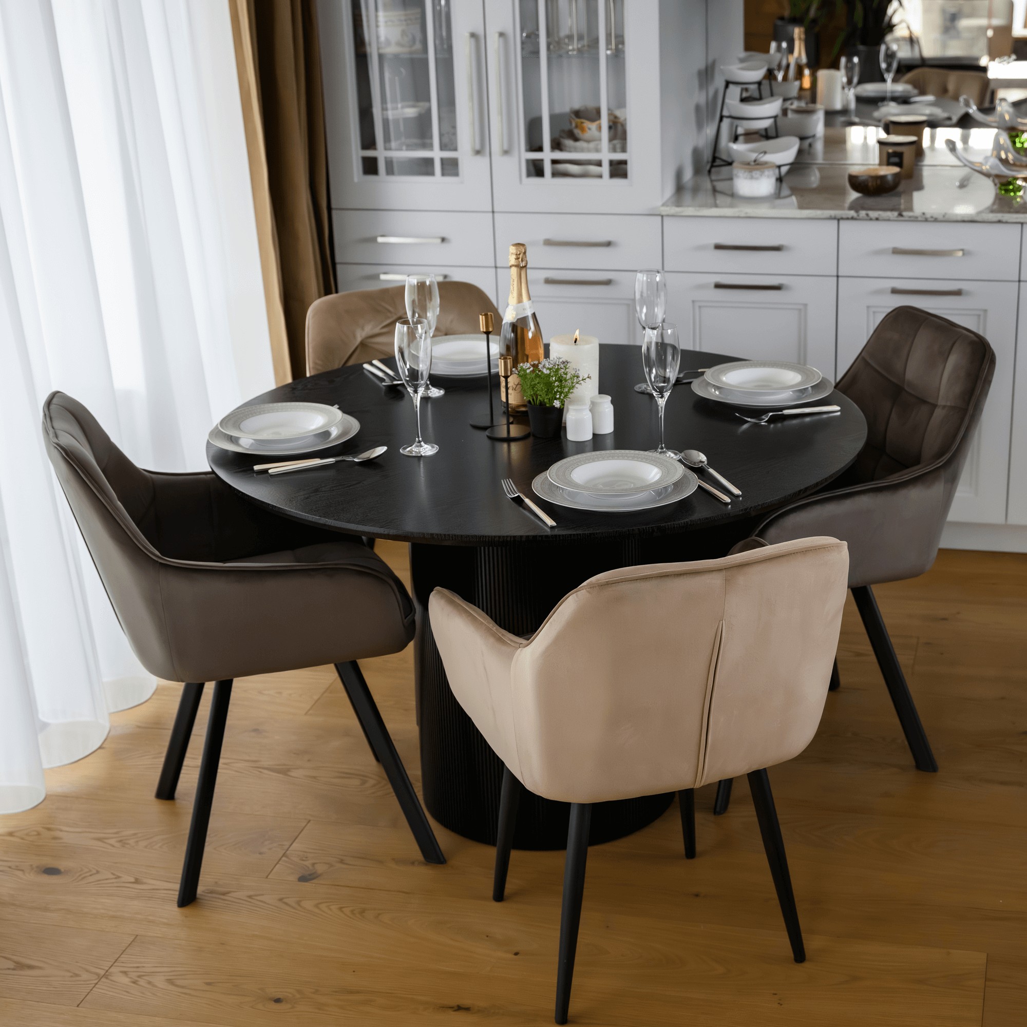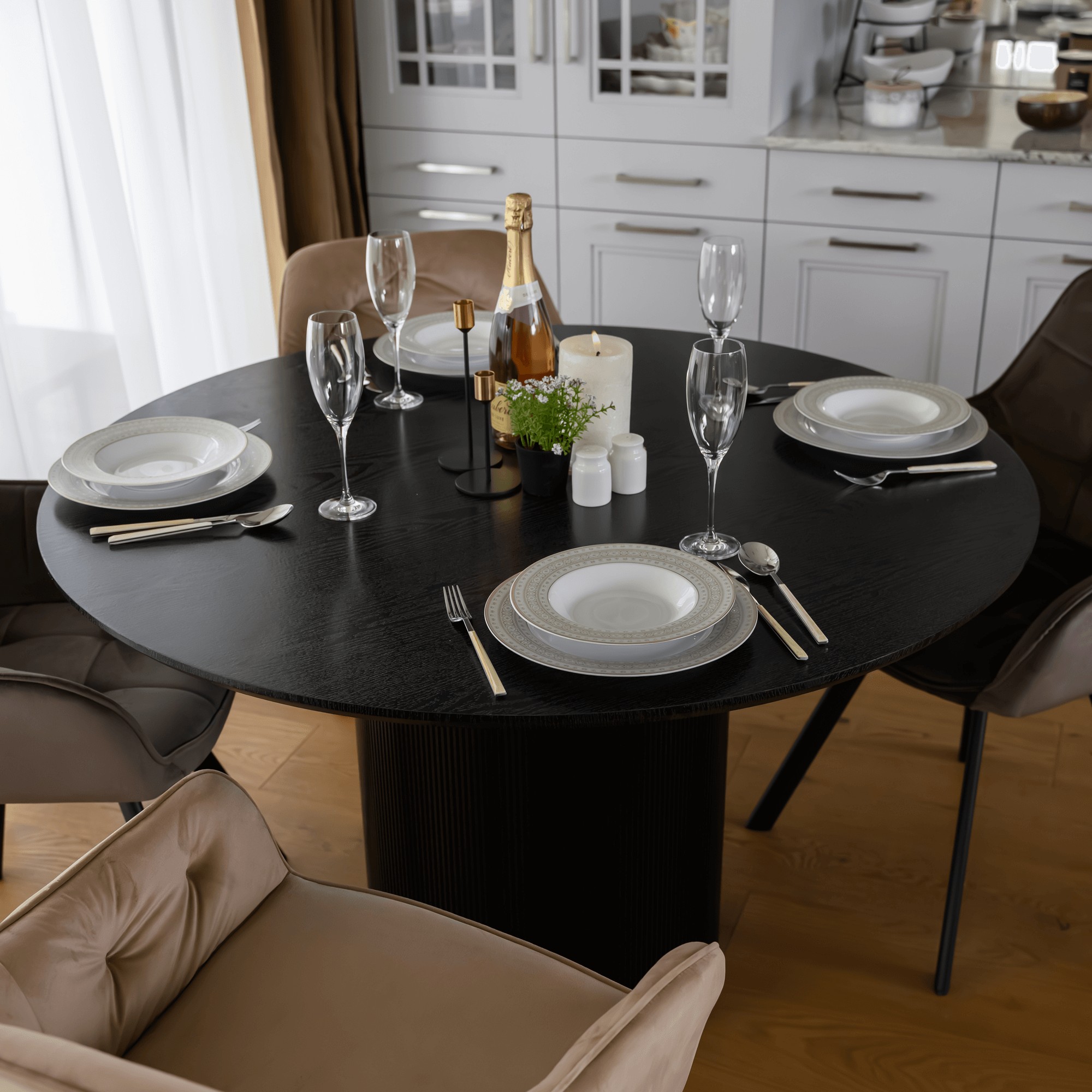 Okrúhly jedálenský stôl Mahir Typ 2 120 v elegantnej čiernej farbe je ideálnym doplnkom pre moderné interiéry. Tento stôl, vyrobený z kvalitného dyhovaného MDF materiálu, ponúka nielen štýlový vzhľad, ale aj praktickosť a odolnosť. S priemerom 120 cm poskytuje dostatok priestoru pre pohodlné stolovanie štyroch osôb.