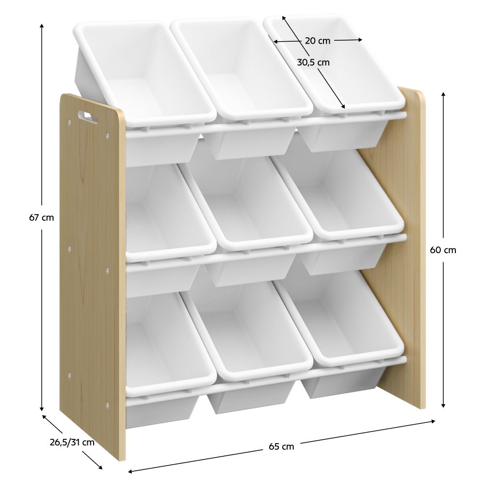 Organizér BOIS predstavuje praktické a zároveň estetické riešenie do detskej izby, ktoré spája funkčnosť s jednoduchým dizajnom. Vďaka svojim kompaktným rozmerom (ŠxHxV): 65x26,5/31x67 cm sa hodí aj do menších priestorov, kde ponúka prehľadné a ľahko dostupné miesto na uloženie hračiek, kníh či školských potrieb. Vyrobený je z kvalitnej MDF v prírodnom prevedení a po bokoch má praktické výrezy pre jednoduchšiu manipuláciu. Regál tvorí trojposchodová konštrukcia doplnená o deväť plastových boxov v neutrálnej bielej farbe s rozmermi 20x30,5x12 cm, ktoré sa ľahko kombinujú s ostatným zariadením izby. Boxy sú upevnené na kovových tyčiach, vďaka čomu pevne držia na svojom mieste, no zároveň sa dajú jednoducho vybrať a vyčistiť. Hrúbka MDF materiálu je 1,2 cm a kovových prvkov 1,6 cm, čo zaručuje stabilitu a odolnosť. Organizér tak nielen uľahčuje udržiavanie poriadku, ale zároveň podporuje deti v rozvíjaní samostatnosti a zodpovednosti pri upratovaní. Vďaka svojmu vzhľadu pôsobí aj ako príjemný doplnok, ktorý zútulní priestor určený na hranie aj učenie. Dodáva sa v demonte.