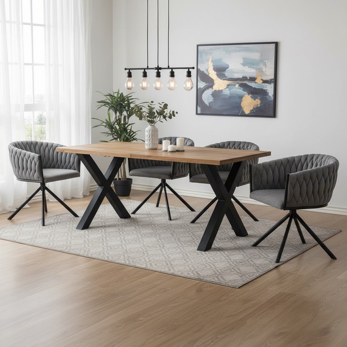 Jedálenská stolička ZALA s otočnou funkciou zaujme moderným dizajnom aj pohodlným sedením. Dominantným prvkom je operadlo s jemným prepletaním, ktoré dodáva stoličke originálny a elegantný charakter. Stabilitu zabezpečuje kovová konštrukcia v čiernom prevedení, pričom otočný mechanizmus umožňuje praktické a komfortné používanie každý deň. Poťah z príjemnej Velvet látky v sivom odtieni pôsobí vkusne a ľahko sa kombinuje s rôznymi štýlmi interiéru. Stolička je vyrobená z kombinácie látky Velvet a kovu, pričom textília dosahuje 80 000 oderov podľa testu Martindale, čo zaručuje dobrú odolnosť pri každodennom používaní. Rozmery stoličky sú (ŠxHxV): 64x60x74 cm, výška sedu 45 cm, hĺbka sedu 46 cm a šírka sedu 50 cm. Chrbtová opierka má šírku 50 cm a výšku 29 cm. Nosnosť stoličky je 100 kg. Model je vybavený opierkami na ruky, otočnou funkciou a dizajnovým spracovaním s dekoratívnym prepletaním. Dodáva sa v demonte pre jednoduchú montáž.