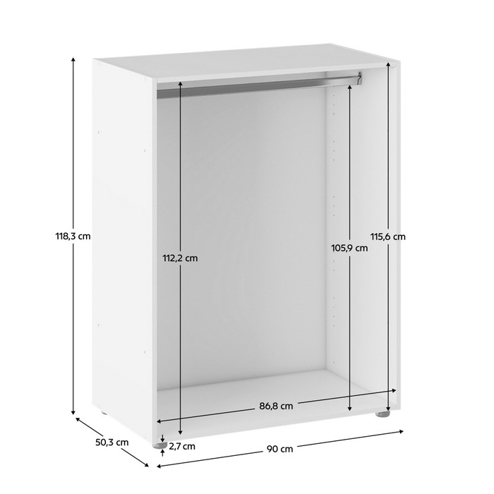Otvorená šatníková skrinka JAMES TYP 1 je praktickým riešením pre spálne, šatníky aj predsiene. Je vyrobená z laminovanej DTD a má elegantnú bielu farbu, ktorá sa ľahko kombinuje s ostatným nábytkom. Skrinka má rozmery (ŠxHxV): 90x50,3x118,3 cm a hrúbku materiálu 1,6 cm, čo zabezpečuje stabilitu a pevnosť. Vďaka vešiakovej tyči z kovu v chrómovej farbe s nosnosťou 5 kg môžete pohodlne zavesiť kabáty, košele alebo šaty. Výška po vešiakovú tyč je 105,9 cm, takže oblečenie zostáva prehľadne usporiadané a ľahko dostupné. Skrinka stojí na plastových nožičkách sivé farby, ktorých výška je nastaviteľná od 2,8 do 4 cm, čo umožňuje jednoduché vyrovnanie nerovností podlahy. Predvŕtané otvory umožňujú montáž políc a zásuviek podľa potreby a pre väčšiu bezpečnosť odporúčame skrinku pripevniť k stene. Tento kvalitný slovenský výrobok je dodávaný v demonte, takže si ho môžete jednoducho zostaviť doma.