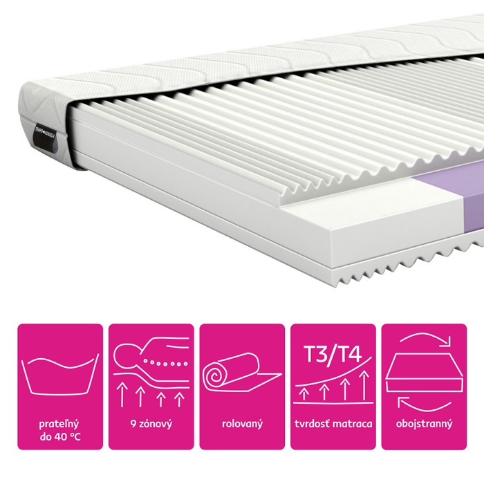 Penový matrac FOAMY je vyrobený z kombinácie kvalitnej PUR peny s hustotou T25 – T35 a vysokoelastickej HR peny s hustotou 35 kg/m3, pričom poťah tvorí 100 % polyester. Matrac má rozmery 140x200 cm, výšku 15 cm a je vyhotovený v bielej farbe. Je navrhnutý ako obojstranný model s rozdielnou tvrdosťou ložných plôch - stredne tvrdou T3 a tvrdšou T4, čo umožňuje jeho pravidelné otáčanie a rovnomerné opotrebovanie. Konštrukcia matraca je sendvičová a jadro je rozdelené do 9 anatomických zón, ktoré zabezpečujú optimálne opretie jednotlivých častí tela a podporujú správnu polohu chrbtice počas spánku. Maximálna nosnosť matraca je 100 kg na osobu. Pre správne fungovanie a dostatočné odvetranie odporúčame matrac používať na lamelovom rošte s pružnými predpätými lamelami, pričom medzera medzi lamelami by nemala presiahnuť 6 cm. Pre zachovanie vlastností a predĺženie životnosti sa odporúča matrac otáčať každé 3 až 4 mesiace. Matrac je vybavený prešívaným poťahom zo 100 % polyesteru s gramážou 130 g/m2, ktorý má certifikát OEKO-TEX. Poťah je snímateľný, vybavený zipsom a je možné ho prať pri teplote 40 °C. Disponuje antibakteriálnou, antiroztočovou a antialergickou úpravou, čím prispieva k hygienickému a zdravému prostrediu na spanie.