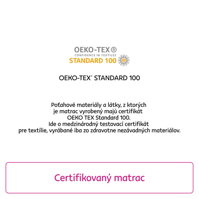 Vrchný matrac ZENY 90 je praktický doplnok, ktorý dokáže výrazne zvýšiť pohodlie pri spánku. Pomáha chrániť hlavný matrac pred opotrebovaním a zároveň zlepšuje jeho vlastnosti. Vďaka nemu sa aj bežné lôžko môže zmeniť na príjemné miesto na oddych. Tvrdosť T3 predstavuje stredne tvrdú úroveň, ktorá ponúka vyváženú kombináciu pohodlia a správnej opory tela. Vnútro toppera tvorí kvalitná PUR pena T23 s hustotou 21 kg/m3. Tento materiál sa dokáže prispôsobiť tvaru tela a rovnomerne rozložiť tlak v oblasti chrbtice, ramien aj bedier. Zároveň pomáha vyrovnávať menšie nerovnosti matraca a prispieva k predĺženiu jeho životnosti. Pena je priedušná, čím podporuje cirkuláciu vzduchu a prispieva k hygienickému prostrediu počas spánku. Povrch matraca má špeciálny vlnovitý tvar, ktorý jemne stimuluje telo, podporuje prekrvenie a zvyšuje celkový komfort pri ležaní. Poťah je vyrobený zo 100 % polyesteru a má gramáž 130 g/m2. Je prešívaný, príjemný na dotyk a zároveň dostatočne odolný voči oderu. Materiál disponuje antialergickými, antibakteriálnymi a antiroztočovými vlastnosťami. Certifikát OEKO-TEX STANDARD 100 zaručuje zdravotnú nezávadnosť a bezpečný kontakt s pokožkou. Poťah je snímateľný, vybavený praktickým zipsom a možno ho prať pri teplote do 40 °C. Topper je vhodný pre každého, kto chce rýchlo a jednoducho zvýšiť komfort spánku, zmäkčiť príliš tvrdý matrac alebo spevniť mäkké lôžko. Súčasťou sú aj elastické gumy, ktoré umožňujú jednoduché pripevnenie k matracu a zabezpečia, aby topper pevne držal na svojom mieste. Vrchný matrac je dodávaný vákuovo balený a zrolovaný. Po rozbalení ho odporúčame nechať približne 24 hodín voľne rozložený, aby sa úplne roztiahol a získal svoj pôvodný tvar. Farebné prevedenie peny alebo prešívanie poťahu sa môže mierne líšiť od fotografie, čo však nijako neovplyvňuje kvalitu ani funkčnosť výrobku. Materiál tvorí PUR pena T23 a poťah zo 100 % polyesteru. Rozmery toppera sú 90x200 cm a jeho hrúbka je 3 cm. Tvrdosť je stredne tvrdá T3 a maximálna nosnosť na osobu dosahuje 110 kg. Poťah má gramáž 130 g/m2, je snímateľný, prateľný do 40 °C a vybavený zipsom. Povrch je vlnovitý a prešívaný. Súčasťou sú aj elastické gumy na upevnenie k matracu.