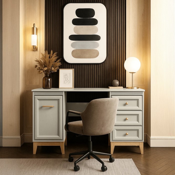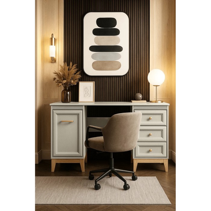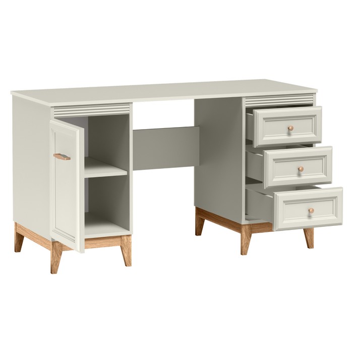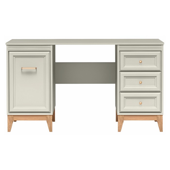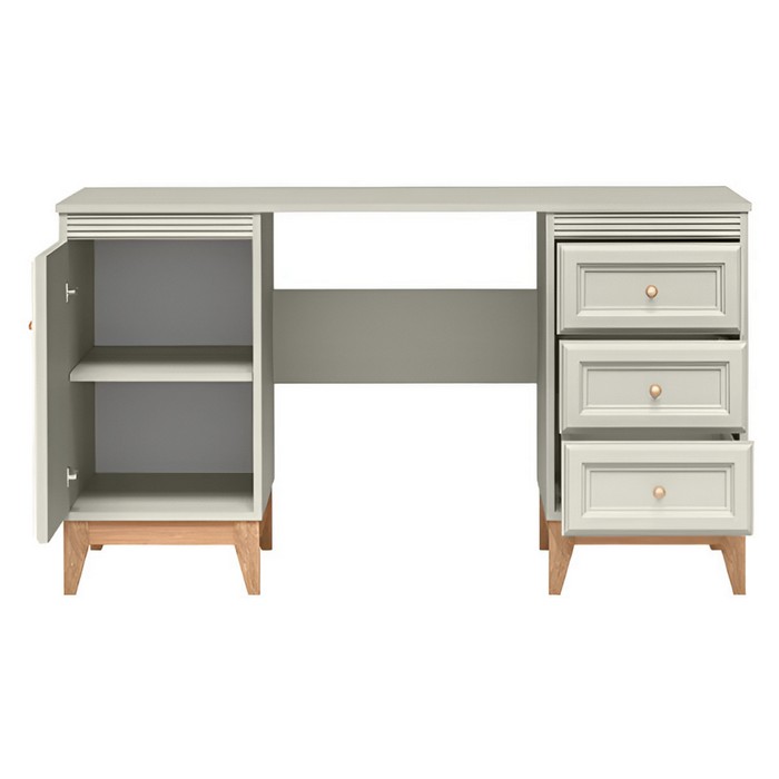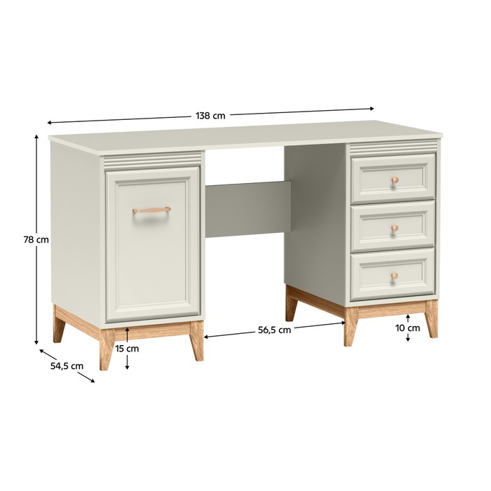 PC stolík VENDY W-14 predstavuje elegantné a praktické riešenie pre domácu pracovňu aj študentskú izbu. Je vyrobený z kvalitnej laminovanej DTD a fóliovanej MDF s odolnými ABS hranami, pričom jemné farebné prevedenie kašmír krémová dodáva interiéru moderný a zároveň útulný vzhľad. Stolík disponuje pracovnou plochou s rozmermi (ŠxHxV): 138x54,5x78 cm a hrúbkou materiálu 1,6 cm, ktorá poskytuje dostatok priestoru na počítač aj pracovné pomôcky. Praktické úložné riešenie tvorí jednodverová skrinka s policou s nosnosťou 5 kg a zásuvky s rovnakou nosnosťou, vhodné na prehľadné uloženie dokumentov či doplnkov. Komfort používania zvyšuje systém tichého domyku dvierok a zásuviek. Kovové úchytky v medenej farbe vytvárajú štýlový detail a nožičky v dekore dub s výškou 15 cm zabezpečujú stabilitu aj jednoduché upratovanie pod stolíkom. Moderný dizajn dopĺňajú prvky vidieckeho štýlu, vďaka ktorým stolík pôsobí nadčasovo. Pre bezpečné používanie odporúčame nábytok pripevniť k stene. Je dostupný len na objednávku s dodacou lehotou približne 3 až 5 týždňov a dodáva sa v demontovanom stave.