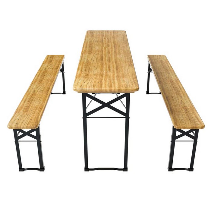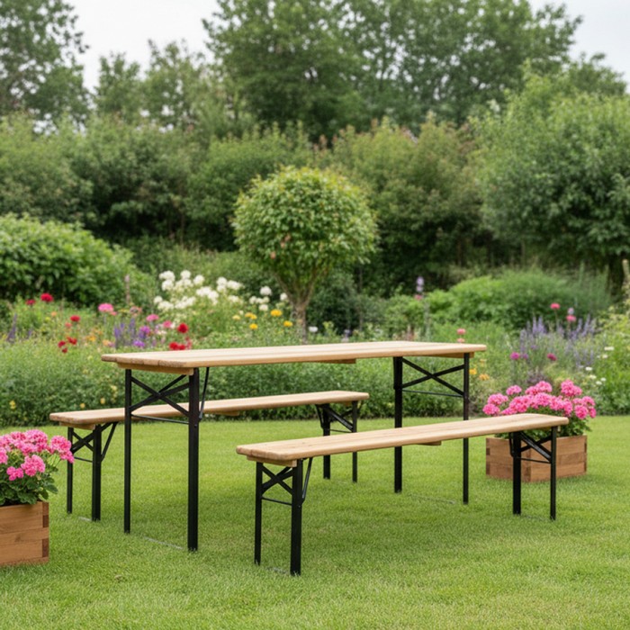 Vytvorte si príjemné miesto na spoločné chvíle na záhrade, terase či pri rôznych oslavách so skladacím pivným setom LORIS. Praktický set pozostáva zo stola a dvoch lavíc, ktoré poskytujú dostatok priestoru na pohodlné sedenie pre rodinu aj priateľov. Vďaka klasickému dizajnu a prírodnému vzhľadu dreva sa hodí na záhradné posedenia, grilovačky aj rôzne spoločenské podujatia. Súprava je vyrobená z kombinácie borovicového dreva a pevnej kovovej konštrukcie v prírodnom a čiernom farebnom prevedení, čo zabezpečuje stabilitu a odolnosť pri používaní. Stôl má rozmery (ŠxHxV): 167x46x75 cm a hrúbku dosky 2,1 cm. Lavice majú rozmery (ŠxHxV): 167x23x46 cm a hrúbku materiálu 2,6 cm. Veľkou výhodou je skladacia konštrukcia, ktorá umožňuje jednoduché rozloženie aj zloženie podľa potreby. Po zložení má stôl rozmery (ŠxHxV): 167x46x5 cm a lavice (ŠxHxV): 167x23x4 cm, čo uľahčuje prenášanie aj skladovanie. Nosnosť stola je 60 kg a nosnosť každej lavice je 90 kg. Pivný set je praktickým riešením pre každého, kto hľadá jednoduché a funkčné sedenie na záhradu, oslavy či rôzne vonkajšie aktivity. Dodáva sa už zmontovaný, takže je pripravený na okamžité použitie.