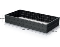 Záhon má tmavú, antracitovú farbu, ktorá sa hodí do každej zelenej oázy. Jeho rozmery sú 149.2 cm na šírku, 75.6 cm na hĺbku a 25 cm na výšku. Čistá váha výrobcu je 5.4 kg.