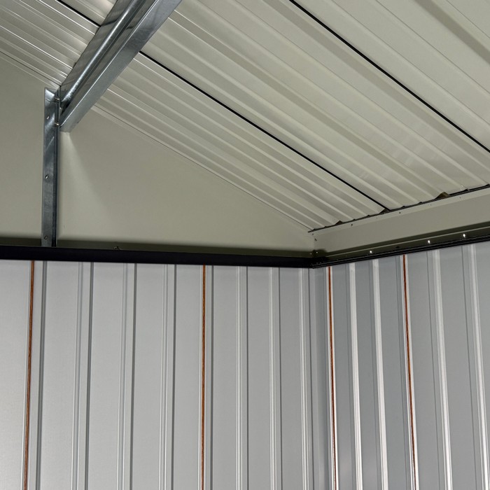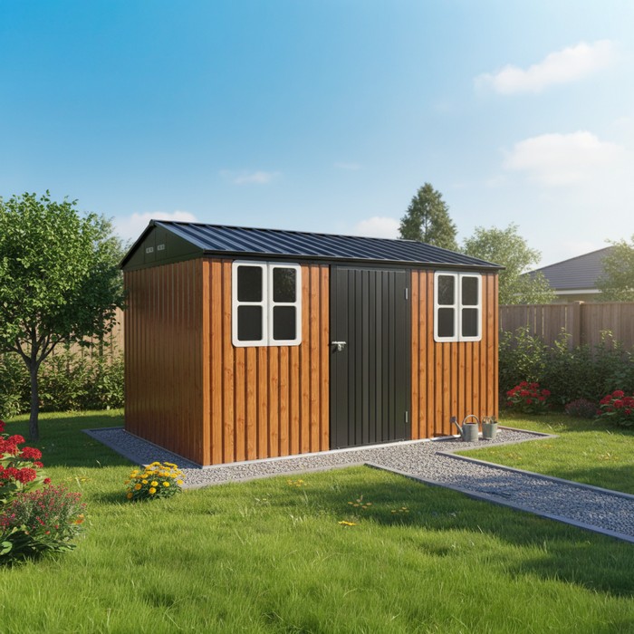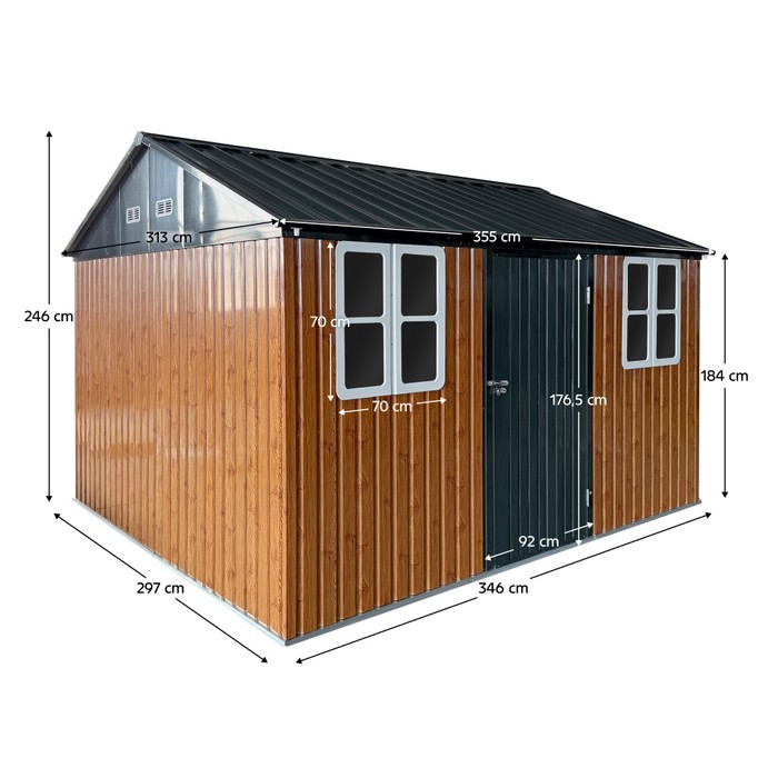 Udržte si v záhrade poriadok štýlovo a bez kompromisov. Plechový záhradný domček GABKO ponúka spoľahlivý úložný priestor na náradie, kosačku, bicykle či bazénové príslušenstvo a pomáha vytvoriť čisté, organizované prostredie. Vďaka pevnej konštrukcii z pozinkovaného kovu a nehrdzavejúcej ocele je stabilný, odolný voči dažďu, vetru, snehu aj UV žiareniu a zároveň si vyžaduje len minimálnu údržbu. Materiál je ekologický a 100 % recyklovateľný, čo z neho robí praktickú aj zodpovednú voľbu. Domček v modernom farebnom prevedení hnedá/antracit má rozmery v spodnej časti (ŠxHxV): 346x297x184 cm, pričom s presahom strechy dosahuje (ŠxHxV): 355x313x246 cm. Vnútorné rozmery sú (ŠxHxV): 330x287x168/230 cm, zastavaná plocha predstavuje 10,3 m2˛ a úžitková plocha 9,47 m2. Hrúbka plechu základne je 0,6 mm a prístrešku 0,25 mm. Celková hmotnosť domčeka je 140,5 kg. Praktické jednokrídlové dvere so západkou s rozmermi 92x176,5 cm umožňujú pohodlný vstup. Interiér presvetľujú dve okná s rozmermi (ŠxV): 70x70 cm a optimálnu cirkuláciu vzduchu zabezpečujú štyri vetracie otvory s veľkosťou (ŠxV): 22,5x9,5 cm. Klasická sedlová strecha efektívne odvádza dažďovú vodu aj sneh, pričom maximálne zaťaženie snehom je 50 kg. Domček je dodávaný v demonte bez podlahy a je potrebné ho umiestniť na pevný a rovný podklad, napríklad betónový základ alebo zámkovú dlažbu, aby bola zabezpečená jeho stabilita aj pri veternom počasí. Montáž je jednoduchá a rýchla.