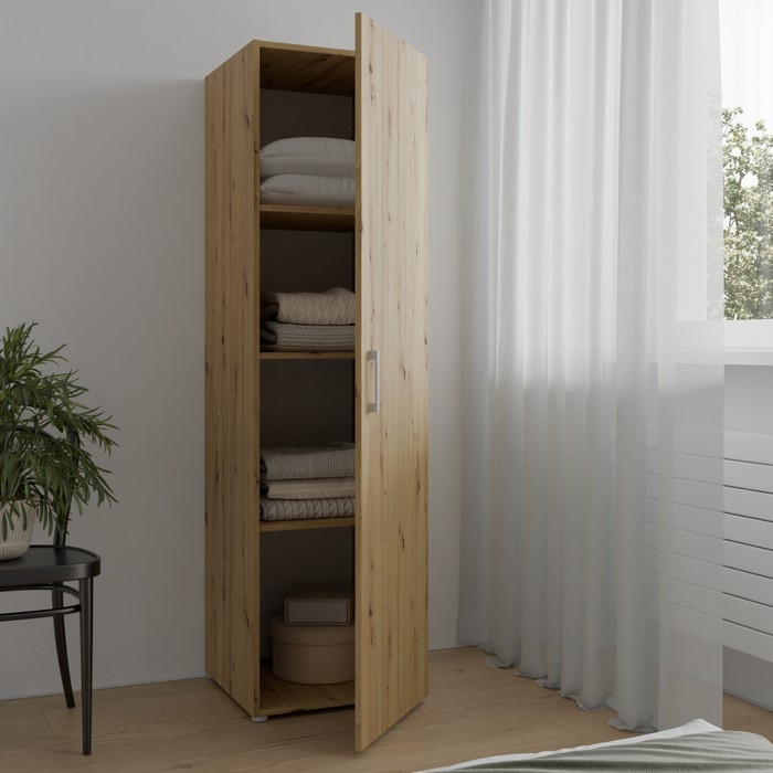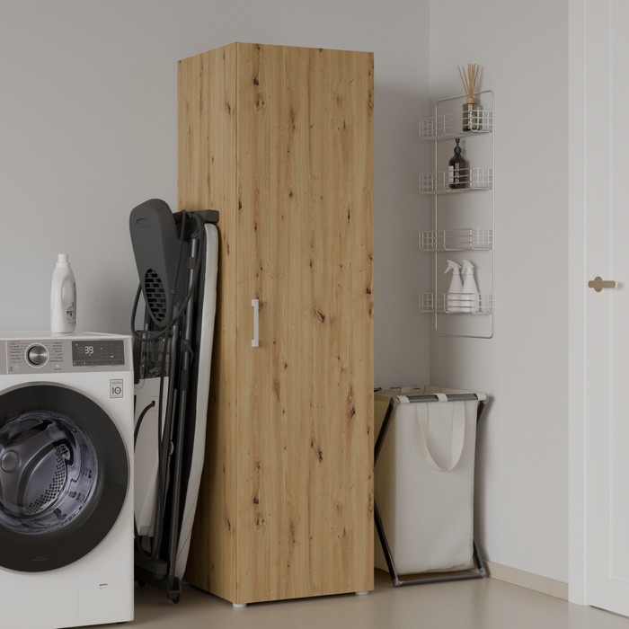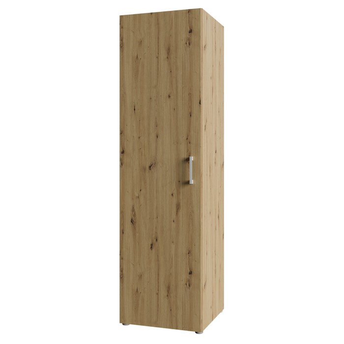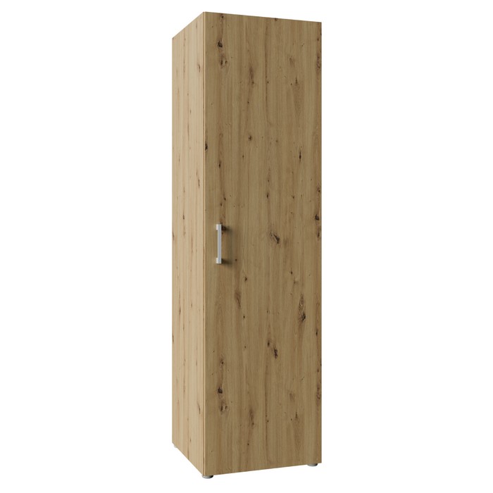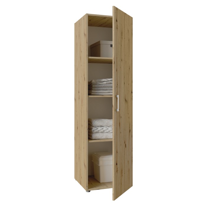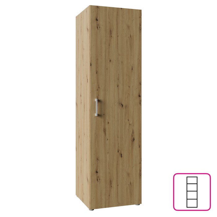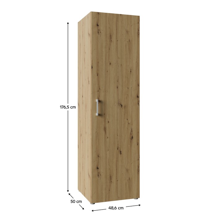 Jednoduchosť tvarov a premyslený úložný priestor robia zo skrine ROMER NEW 1D praktický a univerzálny nábytok vhodný do rôznych interiérov. Je vyrobená z kvalitnej laminovanej DTD s hrúbkou 1,6 cm v obľúbenom prevedení dub artisan, ktoré pôsobí prirodzene a ľahko sa kombinuje s ostatným zariadením. Celkové rozmery skrine sú (ŠxHxV): 48,6x50x176,5 cm, takže ponúka dostatok úložného priestoru pri zachovaní kompaktných rozmerov. Skriňa je jednodverová a vo vnútri sa nachádzajú tri police s nosnosťou 5 kg na každú z nich, pričom vrchná doska unesie až 10 kg. Poskytuje tak ideálne miesto na uloženie oblečenia, dokumentov či rôznych bytových doplnkov. Dvierka sú univerzálne, čo znamená, že ich môžete namontovať na pravú alebo ľavú stranu podľa dispozície miestnosti. Model je vybavený plastovou úchytkou v striebornej farbe, ktorá dotvára jeho decentný vzhľad. Skriňa sa hodí do spálne, chodby, kancelárie aj detskej izby, kde zabezpečí funkčný úložný priestor bez narušenia celkového štýlu interiéru. Pre zvýšenie stability odporúčame skriňu pripevniť k stene. Dodávaná je v demonte.