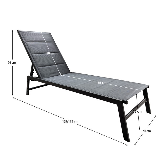 Užite si slnečné dni naplno v pohodlí vlastnej záhrady so záhradným ležadlom LOPEZ. Predstavuje ideálne miesto na oddych, čítanie aj opaľovanie, či už na terase, pri bazéne alebo na trávniku. Jednoduchý čierny dizajn pôsobí moderne a ľahko sa kombinuje s ostatným exteriérovým nábytkom. Ležadlo je vyrobené z odolnej látky a stabilnej kovovej konštrukcie v čiernom prevedení, ktorá zabezpečuje pevnosť a spoľahlivosť pri každodennom používaní. Opierku chrbta je možné nastaviť do štyroch polôh, takže si vždy zvolíte ideálnu pozíciu podľa aktuálnej potreby. Rozmery ležadla sú (ŠxHxV): 61x155x91 cm, výška sedu je 32 cm a hĺbka sedu 136 cm. Výška chrbtovej opierky dosahuje 59 cm a po úplnom sklopení má ležadlo celkovú hĺbku až 195 cm. Nosnosť je 110 kg. Ležadlo je dodávané v demonte a jeho montáž je jednoduchá.