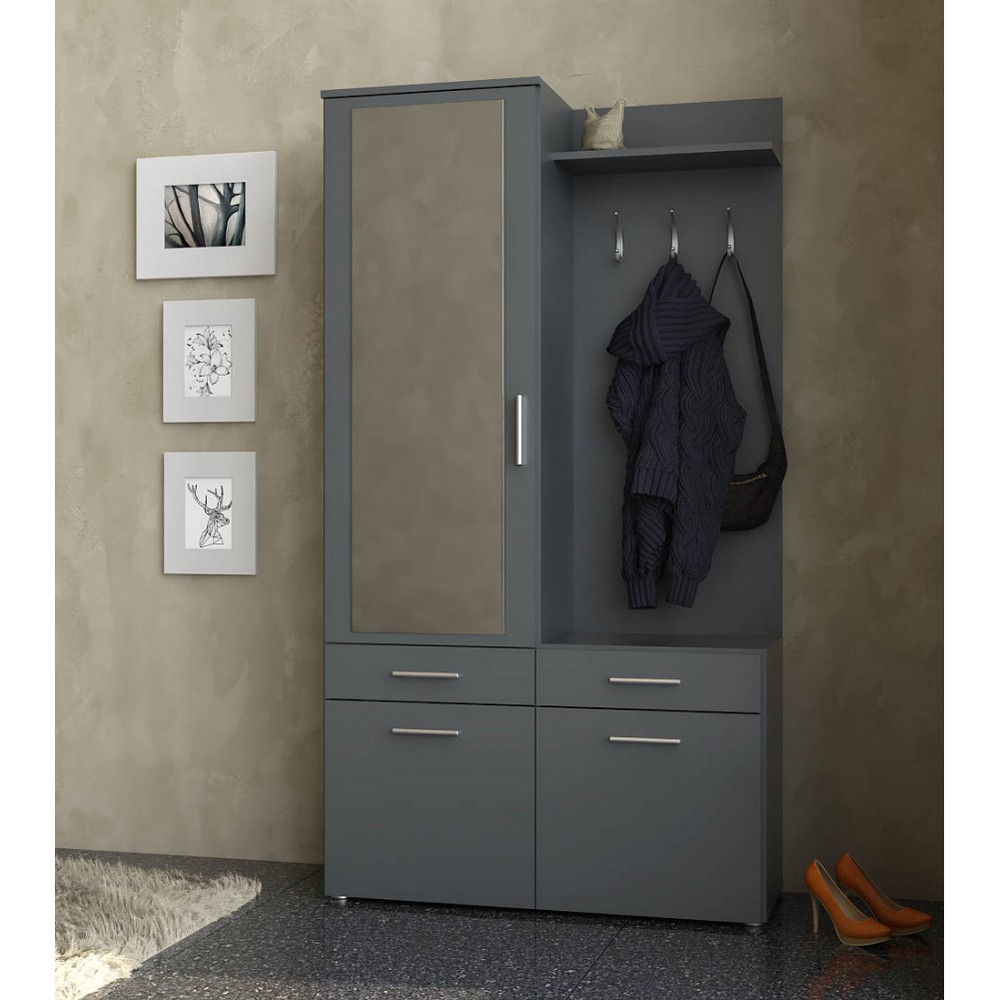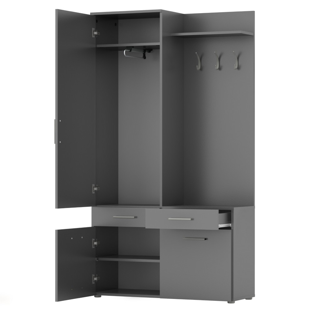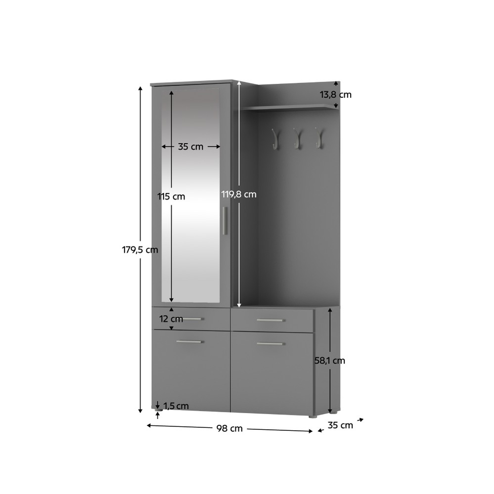 Predsieň LEVITO je kvalitný slovenský výrobok, ktorý zaujme moderným dizajnom a praktickým riešením úložného priestoru. Vyrobená je z odolnej drevotriesky DTD v príjemnej farbe grafit, takže ľahko zapadne do rôznych interiérov. Zostava má celkové rozmery (ŠxHxV): 98×35×179,5 cm, čo ju robí ideálnou voľbou aj do menších predsiení. Na ľavej strane sa nachádza vešiaková časť vybavená tromi plastovými háčikmi v striebornej farbe, doplnená o otvorenú policu s nosnosťou 5 kg, dvojdverovú skrinku s policami s rozmermi (ŠxV): 47,8×42,8 cm a dva šuplíky s výškou 12 cm a nosnosťou 5 kg. Na dverách je umiestnené zrkadlo s rozmermi (ŠxV): 35×115 cm, ktoré opticky zväčší priestor a zároveň umožní rýchlu kontrolu vzhľadu pred odchodom. Zostava stojí na plastových nožičkách v striebornej farbe s výškou 1,5 cm a dopĺňajú ju plastové úchytky v rovnakej farbe. Pre väčšiu stabilitu sa odporúča zostavu pripevniť k stene. Dodáva sa v demonte, takže si ju jednoducho zložíš priamo doma.