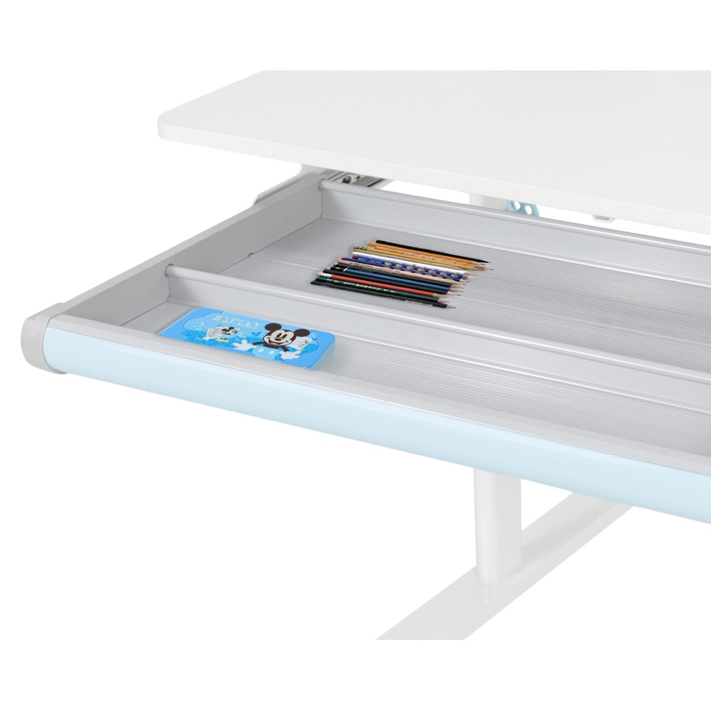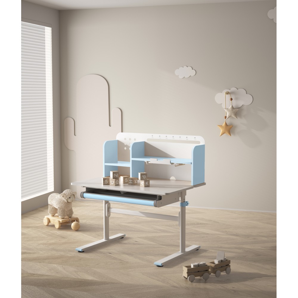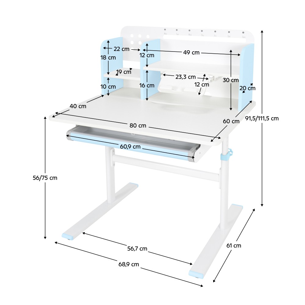 Ak hľadáte stôl, ktorý sa dokáže prispôsobiť vášmu dieťaťu a bude s ním rásť, model ADAN predstavuje praktické a dlhodobé riešenie. Vďaka nastaviteľnej výške poskytuje pohodlie pri rôznych činnostiach, ako je písanie domácich úloh, kreslenie či čítanie, a to od predškolského veku až po obdobie dospievania. Stôl je navrhnutý s dôrazom na ergonómiu a funkčnosť. Pracovnú dosku je možné nakláňať v rozsahu od 0° do 40°, čo umožňuje prispôsobiť jej polohu podľa aktuálnej aktivity a podporiť správne držanie tela. Výška stola sa nastavuje manuálne pomocou kľuky, ktorú si môžete umiestniť na pravú alebo ľavú stranu podľa potreby. Sklon pracovnej plochy sa nastavuje pomocou plynového piestu a páčky, čo zabezpečuje jednoduché, plynulé a bezpečné ovládanie. Okrem nastaviteľnej pracovnej plochy ponúka stôl aj dostatok úložného priestoru. Nachádza sa tu priestranná vysúvacia zásuvka s priehradkou na školské a výtvarné pomôcky. Vrchná časť obsahuje police na knihy a školské potreby, ako aj praktický držiak na knihy, ktorý uľahčuje čítanie. Nechýba ani lišta na poznámky, rozvrh či pripomienky. V zadnej časti police je otvor na vedenie káblov, ktorý pomáha udržať pracovnú plochu čistú a bez neporiadku. Konštrukcia stola je pevná a stabilná vďaka kombinácii kovu, laminovanej MDF dosky a PVC hrán, čo zároveň zaručuje jeho dlhú životnosť. Farebné prevedenie v modrej a bielej pôsobí sviežo a hravo, takže sa hodí najmä do detskej izby. Rozmery stola sú (ŠxHxV): 80x60x91,5/111,5 cm. Šírka podstavy je 68,9 cm a hĺbka podstavy 61 cm. Výšku pracovnej plochy je možné nastaviť v rozmedzí od 56 do 75 cm. Hĺbka polohovacej časti pracovnej dosky je 40 cm. Zadný panel má rozmery 75,6x36,5 cm. Menšia polica má šírku 22 cm a väčšia polica 49 cm. Šírka zásuvky je 60,9 cm a hrúbka MDF materiálu je 1,5 cm. Stôl je vhodný pre deti vo veku približne od 3 do 12 rokov s výškou od 100 do 150 cm a dodáva sa v demontovanom stave. Používanie rastúceho stola má pozitívny vplyv na zdravie dieťaťa. Umožňuje správne a pohodlné sedenie, podporuje zdravý vývoj chrbtice a celého kostrového systému a pomáha predchádzať problémom, ako je zakrivenie chrbtice. Zároveň vedie dieťa k správnym návykom pri sedení a prispôsobuje sa jeho rastu počas celého vývoja. Upozornenie: výrobok nie je vhodný pre deti do troch rokov z dôvodu rizika poranenia pohyblivými časťami.