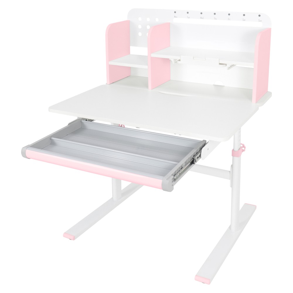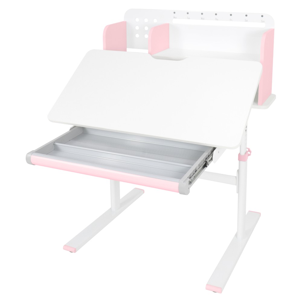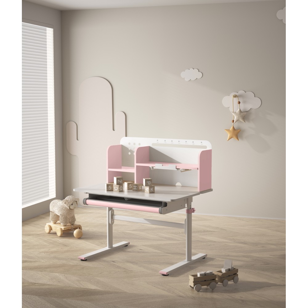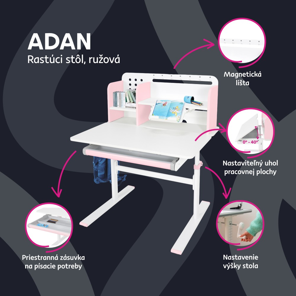Ak hľadáte stôl, ktorý sa dokáže prispôsobiť vášmu dieťaťu a bude s ním rásť, model ADAN predstavuje praktické a dlhodobé riešenie. Vďaka nastaviteľnej výške poskytuje pohodlie pri rôznych činnostiach, ako je písanie domácich úloh, kreslenie či čítanie, a to od predškolského veku až po obdobie dospievania. Stôl je navrhnutý s dôrazom na ergonómiu a funkčnosť. Pracovnú dosku je možné nakláňať v rozsahu od 0° do 40°, čo umožňuje prispôsobiť jej polohu podľa aktuálnej aktivity a podporiť správne držanie tela. Výška stola sa nastavuje manuálne pomocou kľuky, ktorú si môžete umiestniť na pravú alebo ľavú stranu podľa potreby. Sklon pracovnej plochy sa nastavuje pomocou plynového piestu a páčky, čo zabezpečuje jednoduché, plynulé a bezpečné ovládanie. Okrem nastaviteľnej pracovnej plochy ponúka stôl aj dostatok úložného priestoru. Nachádza sa tu priestranná vysúvacia zásuvka s priehradkou na školské a výtvarné pomôcky. Vrchná časť obsahuje police na knihy a školské potreby, ako aj praktický držiak na knihy, ktorý uľahčuje čítanie. Nechýba ani lišta na poznámky, rozvrh či pripomienky. V zadnej časti police je otvor na vedenie káblov, ktorý pomáha udržať pracovnú plochu čistú a bez neporiadku. Konštrukcia stola je pevná a stabilná vďaka kombinácii kovu, laminovanej MDF dosky a PVC hrán, čo zároveň zaručuje jeho dlhú životnosť. Farebné prevedenie v ružovej a bielej farbe pôsobí sviežo a hravo, takže sa hodí najmä do detskej izby. Rozmery stola sú (ŠxHxV): 80x60x91,5/111,5 cm. Šírka podstavy je 68,9 cm a hĺbka podstavy 61 cm. Výšku pracovnej plochy je možné nastaviť v rozmedzí od 56 do 75 cm. Hĺbka polohovacej časti pracovnej dosky je 40 cm. Zadný panel má rozmery 75,6x36,5 cm. Menšia polica má šírku 22 cm a väčšia polica 49 cm. Šírka zásuvky je 60,9 cm a hrúbka MDF materiálu je 1,5 cm. Stôl je vhodný pre deti vo veku približne od 3 do 12 rokov s výškou od 100 do 150 cm a dodáva sa v demontovanom stave. Používanie rastúceho stola má pozitívny vplyv na zdravie dieťaťa. Umožňuje správne a pohodlné sedenie, podporuje zdravý vývoj chrbtice a celého kostrového systému a pomáha predchádzať problémom, ako je zakrivenie chrbtice. Zároveň vedie dieťa k správnym návykom pri sedení a prispôsobuje sa jeho rastu počas celého vývoja. Upozornenie: výrobok nie je vhodný pre deti do troch rokov z dôvodu rizika poranenia pohyblivými časťami.
