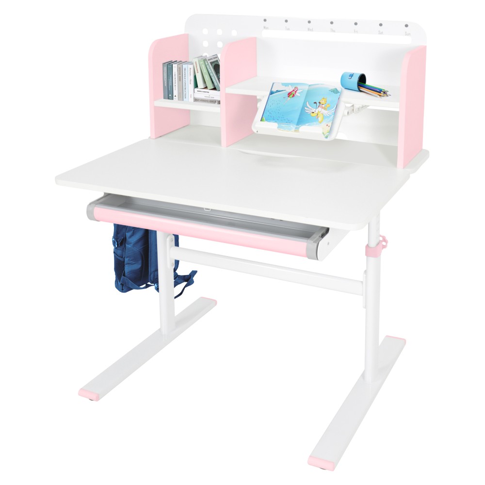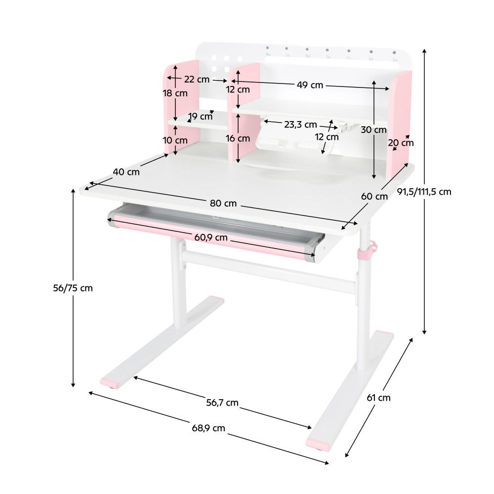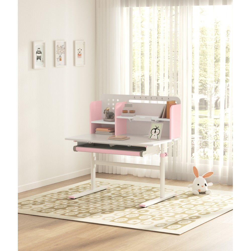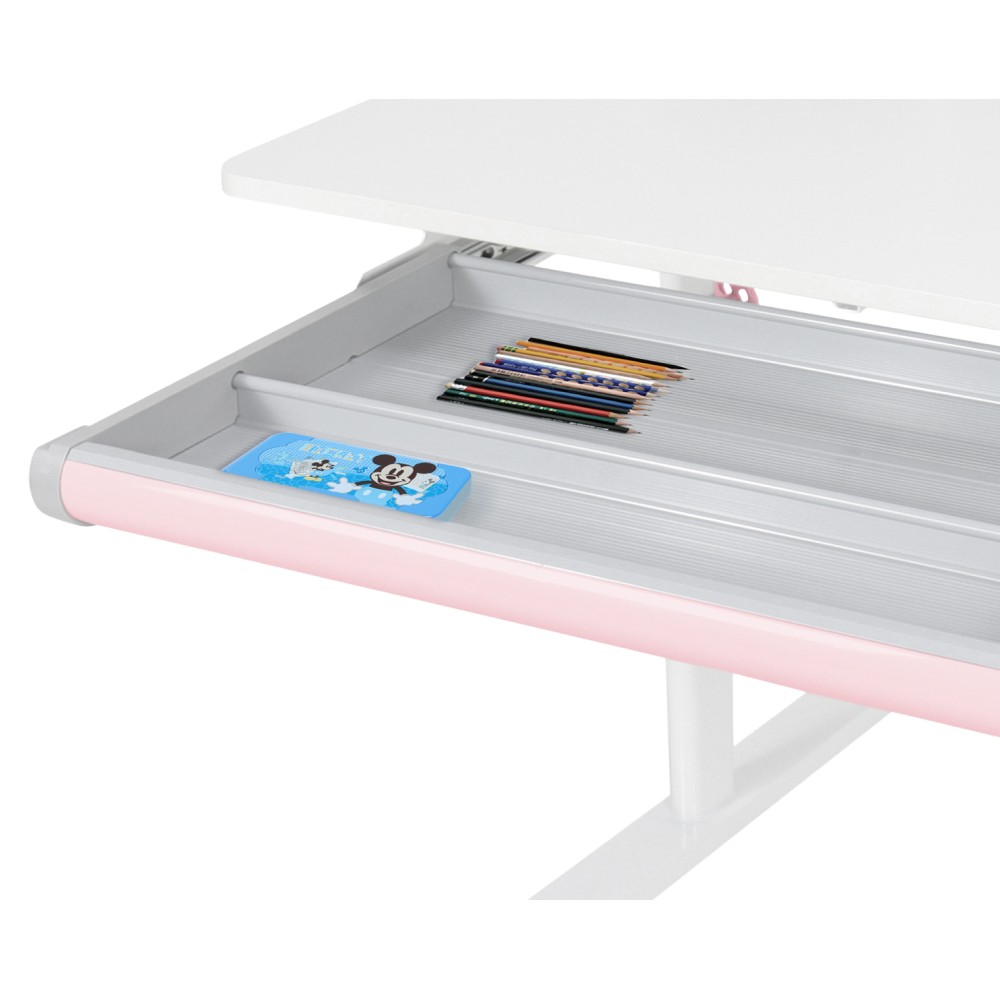 Ak hľadáte stôl, ktorý sa dokáže prispôsobiť vášmu dieťaťu a bude s ním rásť, model ADAN predstavuje praktické a dlhodobé riešenie. Vďaka nastaviteľnej výške poskytuje pohodlie pri rôznych činnostiach, ako je písanie domácich úloh, kreslenie či čítanie, a to od predškolského veku až po obdobie dospievania. Stôl je navrhnutý s dôrazom na ergonómiu a funkčnosť. Pracovnú dosku je možné nakláňať v rozsahu od 0° do 40°, čo umožňuje prispôsobiť jej polohu podľa aktuálnej aktivity a podporiť správne držanie tela. Výška stola sa nastavuje manuálne pomocou kľuky, ktorú si môžete umiestniť na pravú alebo ľavú stranu podľa potreby. Sklon pracovnej plochy sa nastavuje pomocou plynového piestu a páčky, čo zabezpečuje jednoduché, plynulé a bezpečné ovládanie. Okrem nastaviteľnej pracovnej plochy ponúka stôl aj dostatok úložného priestoru. Nachádza sa tu priestranná vysúvacia zásuvka s priehradkou na školské a výtvarné pomôcky. Vrchná časť obsahuje police na knihy a školské potreby, ako aj praktický držiak na knihy, ktorý uľahčuje čítanie. Nechýba ani lišta na poznámky, rozvrh či pripomienky. V zadnej časti police je otvor na vedenie káblov, ktorý pomáha udržať pracovnú plochu čistú a bez neporiadku. Konštrukcia stola je pevná a stabilná vďaka kombinácii kovu, laminovanej MDF dosky a PVC hrán, čo zároveň zaručuje jeho dlhú životnosť. Farebné prevedenie v ružovej a bielej farbe pôsobí sviežo a hravo, takže sa hodí najmä do detskej izby. Rozmery stola sú (ŠxHxV): 80x60x91,5/111,5 cm. Šírka podstavy je 68,9 cm a hĺbka podstavy 61 cm. Výšku pracovnej plochy je možné nastaviť v rozmedzí od 56 do 75 cm. Hĺbka polohovacej časti pracovnej dosky je 40 cm. Zadný panel má rozmery 75,6x36,5 cm. Menšia polica má šírku 22 cm a väčšia polica 49 cm. Šírka zásuvky je 60,9 cm a hrúbka MDF materiálu je 1,5 cm. Stôl je vhodný pre deti vo veku približne od 3 do 12 rokov s výškou od 100 do 150 cm a dodáva sa v demontovanom stave. Používanie rastúceho stola má pozitívny vplyv na zdravie dieťaťa. Umožňuje správne a pohodlné sedenie, podporuje zdravý vývoj chrbtice a celého kostrového systému a pomáha predchádzať problémom, ako je zakrivenie chrbtice. Zároveň vedie dieťa k správnym návykom pri sedení a prispôsobuje sa jeho rastu počas celého vývoja. Upozornenie: výrobok nie je vhodný pre deti do troch rokov z dôvodu rizika poranenia pohyblivými časťami.
