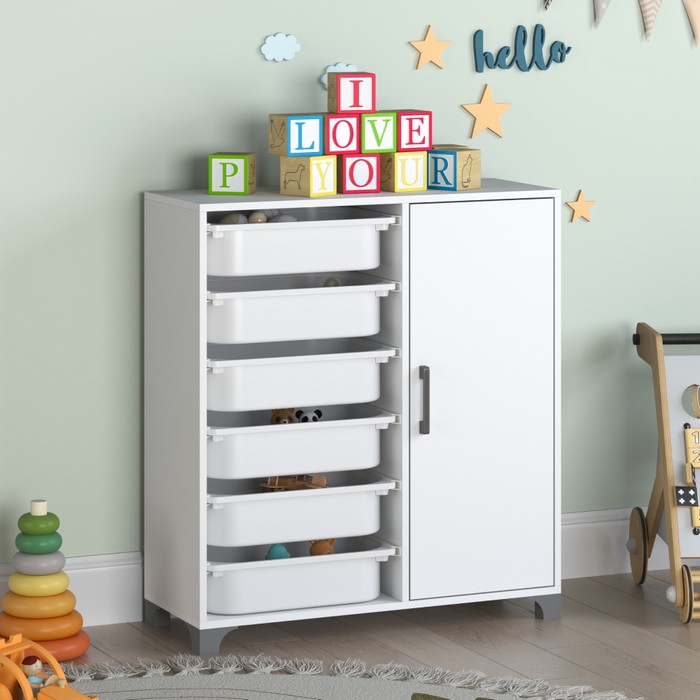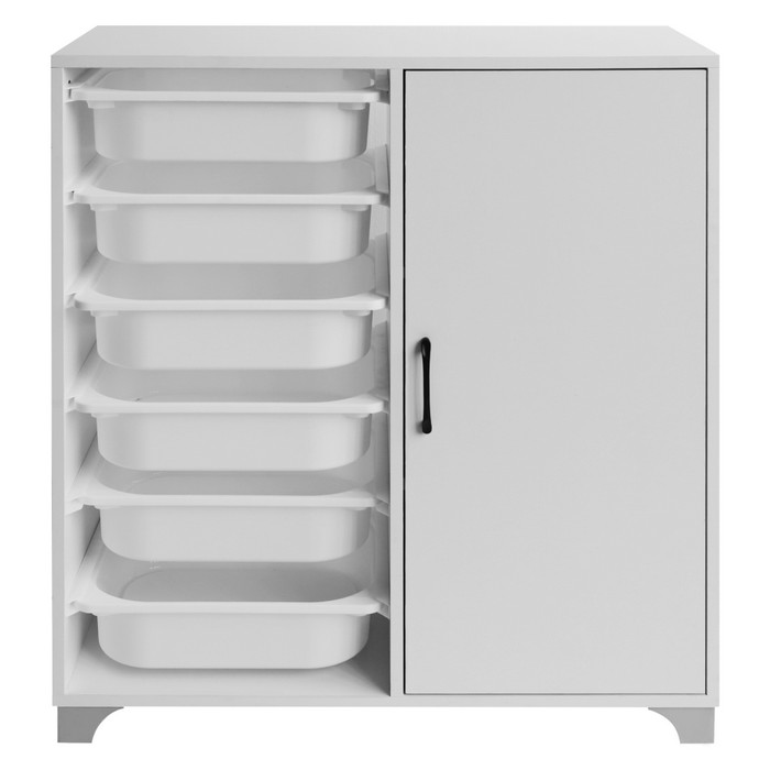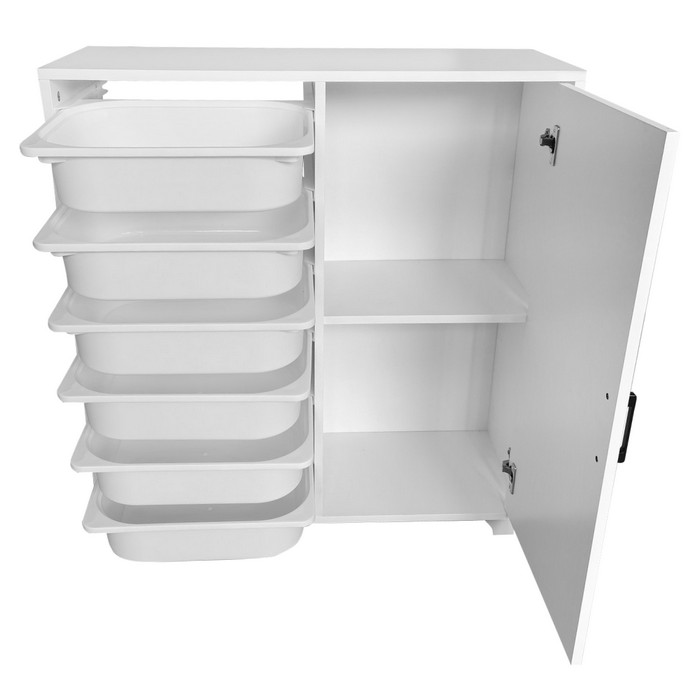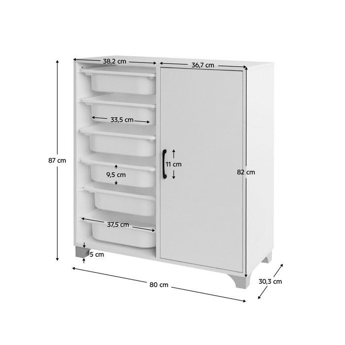 Vytvorte si doma prehľadný a uprataný priestor s praktickým úložným regálom VELTO v nadčasovej bielej farbe. Kombinácia otvorených plastových boxov a uzatvorenej skrinky prináša šikovné riešenie na organizáciu hračiek, drobností či kancelárskych potrieb. Predmety, ktoré chcete mať rýchlo po ruke, môžete uložiť do boxov, zatiaľ čo veci, ktoré majú zostať skryté, jednoducho odložíte do skrinky. Za dvierkami sa nachádza polica, ktorá rozdeľuje vnútorný priestor na dve praktické časti. Jednoduchý a moderný vzhľad sa ľahko prispôsobí detskej izbe aj pracovni a pomôže vytvoriť usporiadané a harmonické prostredie. Regál je vyrobený z laminovanej DTD v kombinácii s plastom a je prevedený v bielej farbe. Jeho rozmery sú (ŠxHxV): 80x30,3x87 cm. Súčasťou je jednodverová skrinka s policou, ktorej nosnosť je 10 kg. Otvorený úložný priestor obsahuje 6 plastových boxov s rozmermi (ŠxHxV): 37,5x29,9x9,5 cm, pričom nosnosť jedného boxu je maximálne 3 kg. Stabilitu zabezpečujú plastové nožičky v sivej farbe s výškou 5 cm, ktoré zároveň uľahčujú upratovanie pod nábytkom. Dvierka skrinky sú vybavené kovovou úchytkou v čiernej farbe, ktorá dotvára moderný vzhľad regála. Vrchna doska má nosnosť 38 kg, takže na ňu môžete umiestniť knihy, dekorácie alebo ďalšie potrebné veci. Je praktický a viacúčelový regál - organizér, ideálny najmä do detských izieb, kde poskytne dostatok miesta na hračky, knihy či školské pomôcky. Pre zvýšenie bezpečnosti odporúčame regál pripevniť k stene. Produkt je dodávaný v demonte, čo uľahčuje jeho prepravu a manipuláciu.