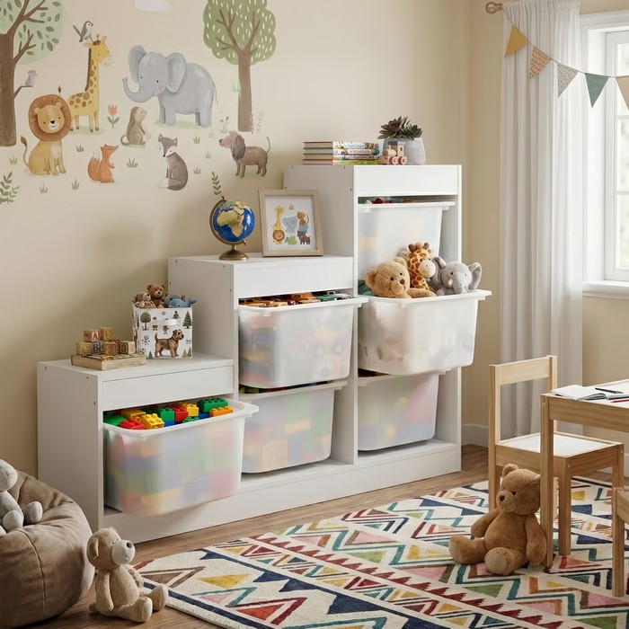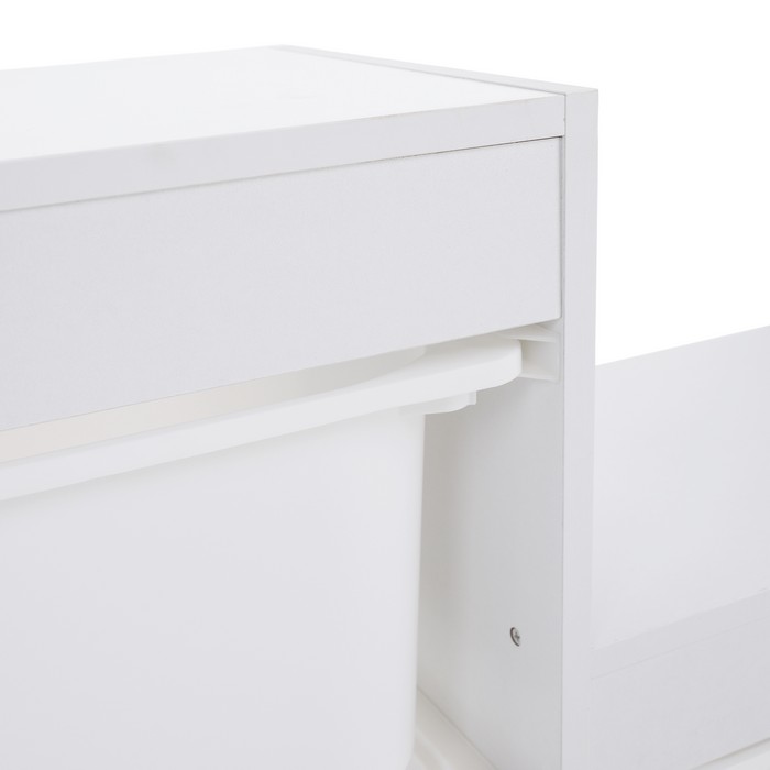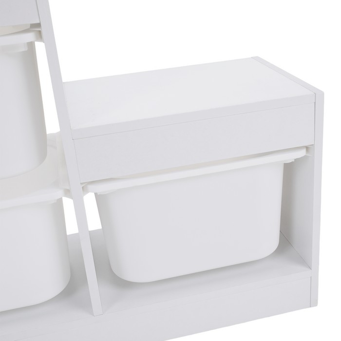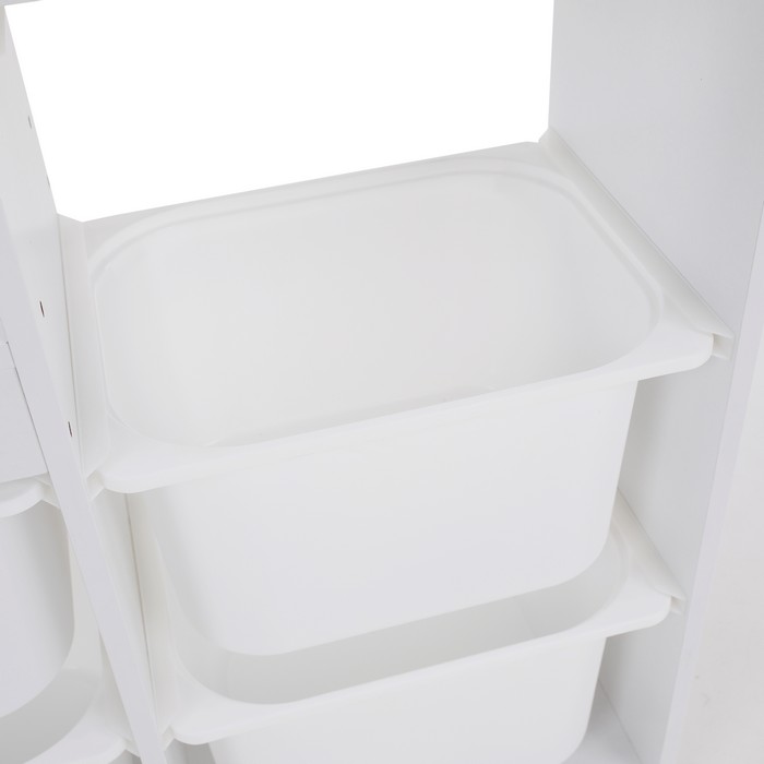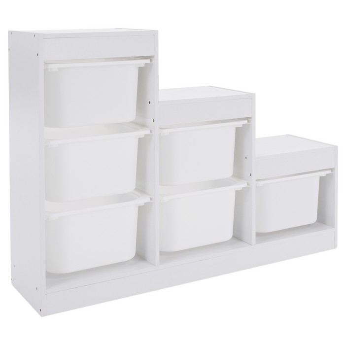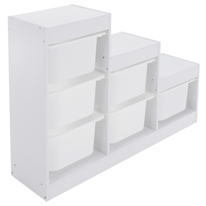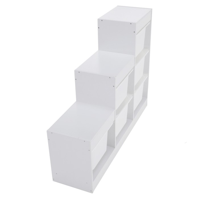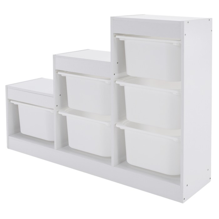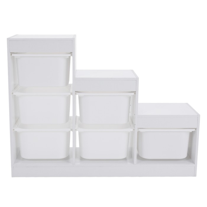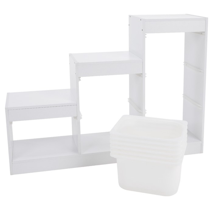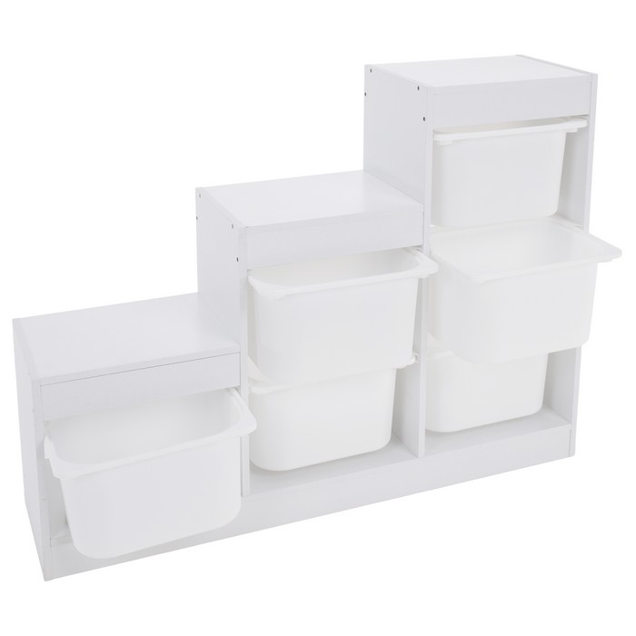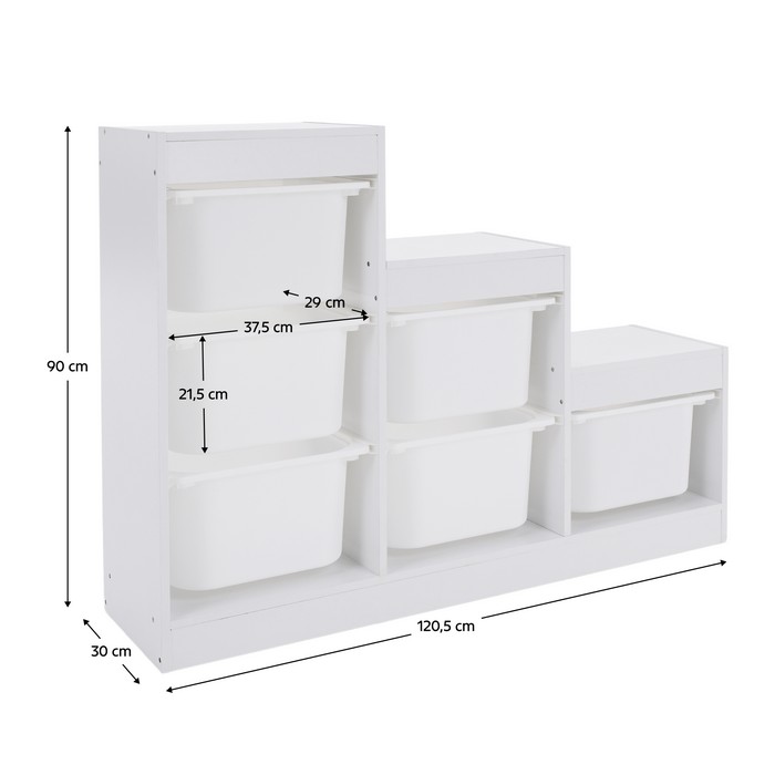 Regál TRINIS je praktickým riešením pre prehľadné usporiadanie vecí v detskej izbe aj v iných častiach domácnosti. Vďaka kompaktným rozmerom (ŠxHxV): 120,5x30x90 cm sa hodí aj do menších priestorov, kde ponúka dostatok miesta na uloženie hračiek, kníh, školských potrieb či rôznych drobností. Vyrobený je z kvalitnej DTD s hrúbkou 1,5 cm v bielom farebnom prevedení, ktoré pôsobí čisto a ľahko sa kombinuje s ostatným zariadením. Celková nosnosť regála dosahuje 30 kg. Súčasťou organizéra je šesť plastových boxov v bielej farbe s rozmermi (ŠxHxV): 37,5x29x21,5 cm, pričom nosnosť každého boxu je 5 kg. Boxy sú ľahké, pevné a jednoducho udržiavateľné, čo umožňuje jednoduchú manipuláciu aj pre deti. Trojposchodové usporiadanie v tvare pyramídy šetrí priestor a zároveň zabezpečuje dobrý prehľad o uložených veciach. Regál je viacúčelový a možno ho využiť na odkladanie hračiek, kníh alebo školských potrieb. Pomáha vytvárať poriadok a podporuje samostatnosť detí pri upratovaní. Stabilná konštrukcia v kombinácii s praktickými plastovými boxmi z neho robí funkčný doplnok do detskej izby. Produkt sa dodáva v demonte.