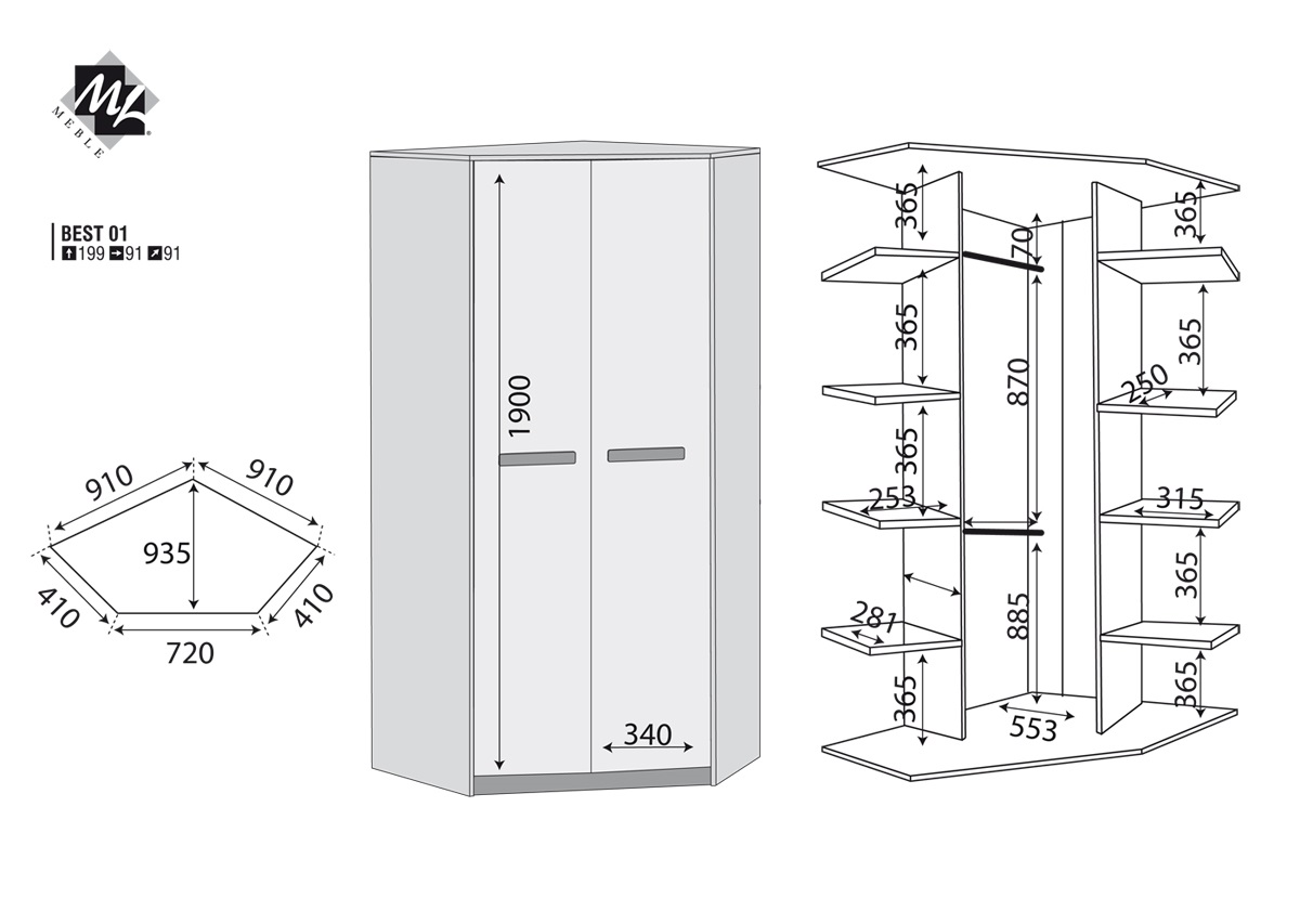 Rohová skriňa BEST 01 je šatníková skriňa s dvomi vešiakovými tyčami a poličkami umiestnenými po stranách. Skriňa je vyrobená vo farebnom prevedení dub divoký / biela linea / sivá, pričom na výber je aj vo viacerých farebných vyhotoveniach. Možno ju kombinovať s ostatnými prvkami z modelovej rady Best. Systém Best ponúka moderný nábytok najmä pre deti vo veku 5-16 rokov, ale aj pre študentov. Lišta s úchytmi sú dostupné vo viacerých farbách, korpus si možno vybrať v prevedení dub divoký alebo breza, fronty sú buď z brezy alebo v bielej farbe. Nábytok je vyrobený z kvalitných lamino dosiek odolných proti poškriabaniu, vlhkosti a vysokej teplote. Všetky hrany sú ohraničené ABS úpravou, ktorá je odolná proti nárazu, vlhkosti, nedeformuje sa a neodlepí.