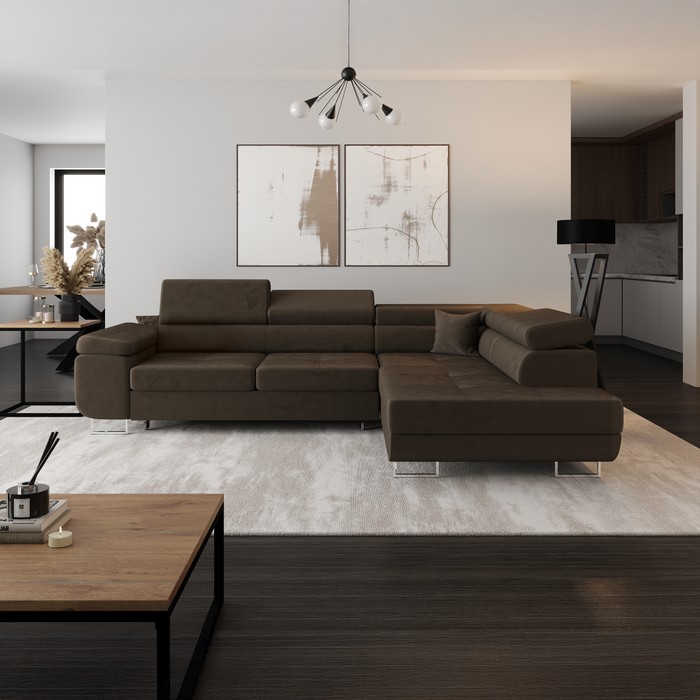 Rohová sedacia súprava ANTON ROH v pravom prevedení predstavuje spojenie moderného dizajnu, premyslenej funkčnosti a vysokého komfortu. Elegantné čalúnenie látkou Paros 4 v hnedej farbe s oderuodolnosťou až 50 000 cyklov Martindale pôsobí nadčasovo a je vhodné aj na každodenné používanie. Konštrukcia je vyrobená z drevotriesky a borovicového dreva, čo zabezpečuje stabilitu a dlhú životnosť. Sedacia súprava má rozmery (ŠxHxV): 274x203x70/90 cm a vďaka celočalúnenému prevedeniu ju môžete bez obáv umiestniť aj do priestoru. Výška sedu je 44 cm, hĺbka sedu 58 cm a šírka sedacej časti dosahuje 139 cm, čo poskytuje dostatok priestoru na pohodlné sedenie. Komfort zvyšuje výplň z falistej pružiny s tvrdosťou T30. Anton Roh je rozkladacia a po rozložení ponúka spaciu plochu s rozmermi 125x198 cm, vhodnú na príležitostné prespanie. Súčasťou je aj praktický úložný priestor, ideálny na uskladnenie diek či vankúšov. Otoman má rozmery 103x158 cm a opierka na ruku (ŠxHxV): 35x100x60 cm. Maximálny komfort zabezpečujú tri polohovateľné opierky hlavy s trojstupňovým nastavením, ktoré poskytujú optimálnu oporu hlavy a krčnej chrbtice. Výška chrbtovej opierky je 50 cm. Sedacia súprava je dodávaná spolu s vankúšom. Súprava stojí na kovových nožičkách v striebornej farbe s niklovou povrchovou úpravou, pričom zadné nožičky sú z čierneho plastu. Výška priestoru od podlahy je 9 cm, čo uľahčuje údržbu podlahy. Anton Roh je dodávaná v demonte a je ideálnou voľbou pre tých, ktorí hľadajú modernú, praktickú a komfortnú sedaciu súpravu do obývačky.