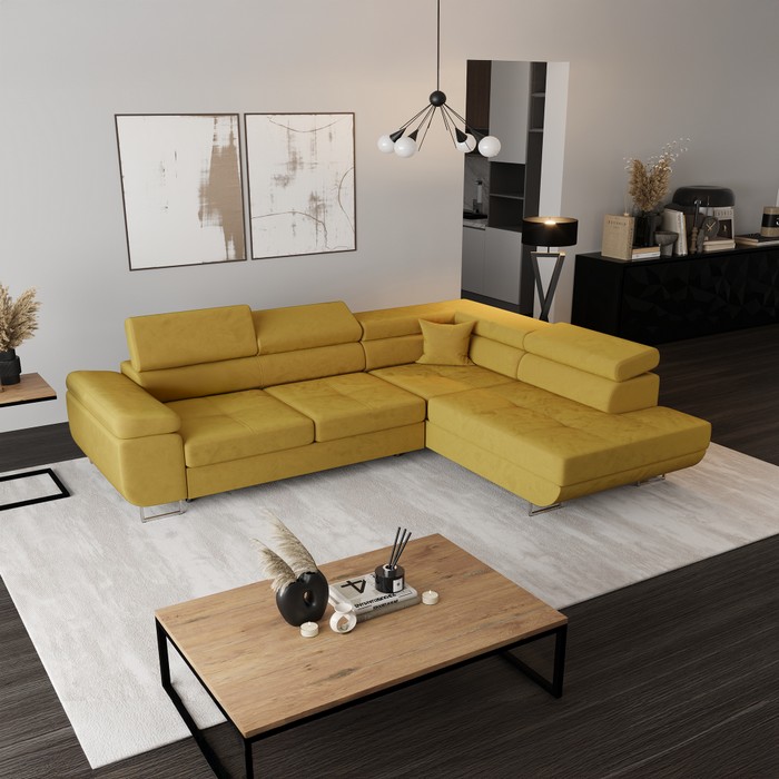Rohová sedacia súprava ANTON ROH v pravom prevedení predstavuje spojenie moderného dizajnu, premyslenej funkčnosti a vysokého komfortu. Elegantné čalúnenie látkou Holland 10 v žltej farbe s oderuodolnosťou až 50 000 cyklov Martindale pôsobí nadčasovo a je vhodné aj na každodenné používanie. Konštrukcia je vyrobená z drevotriesky a borovicového dreva, čo zabezpečuje stabilitu a dlhú životnosť. Sedacia súprava má rozmery (ŠxHxV): 274x203x70/90 cm a vďaka celočalúnenému prevedeniu ju môžete bez obáv umiestniť aj do priestoru. Výška sedu je 44 cm, hĺbka sedu 58 cm a šírka sedacej časti dosahuje 139 cm, čo poskytuje dostatok priestoru na pohodlné sedenie. Komfort zvyšuje výplň z falistej pružiny s tvrdosťou T30. Anton Roh je rozkladacia a po rozložení ponúka spaciu plochu s rozmermi 125x198 cm, vhodnú na príležitostné prespanie. Súčasťou je aj praktický úložný priestor, ideálny na uskladnenie diek či vankúšov. Otoman má rozmery 103x158 cm a opierka na ruku (ŠxHxV): 35x100x60 cm. Maximálny komfort zabezpečujú tri polohovateľné opierky hlavy s trojstupňovým nastavením, ktoré poskytujú optimálnu oporu hlavy a krčnej chrbtice. Výška chrbtovej opierky je 50 cm. Sedacia súprava je dodávaná spolu s vankúšom. Súprava stojí na kovových nožičkách v striebornej farbe s niklovou povrchovou úpravou, pričom zadné nožičky sú z čierneho plastu. Výška priestoru od podlahy je 9 cm, čo uľahčuje údržbu podlahy. Anton Roh je dodávaná v demonte a je ideálnou voľbou pre tých, ktorí hľadajú modernú, praktickú a komfortnú sedaciu súpravu do obývačky.