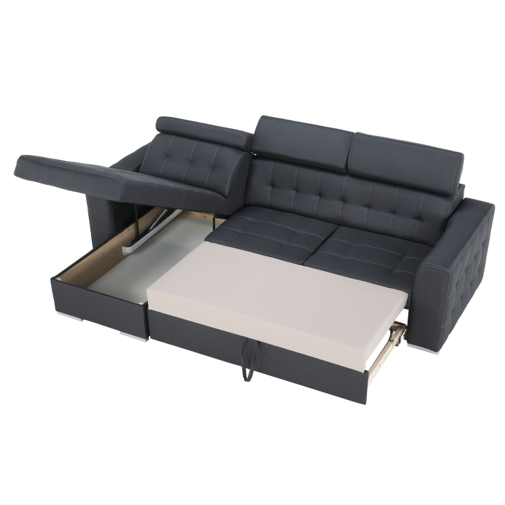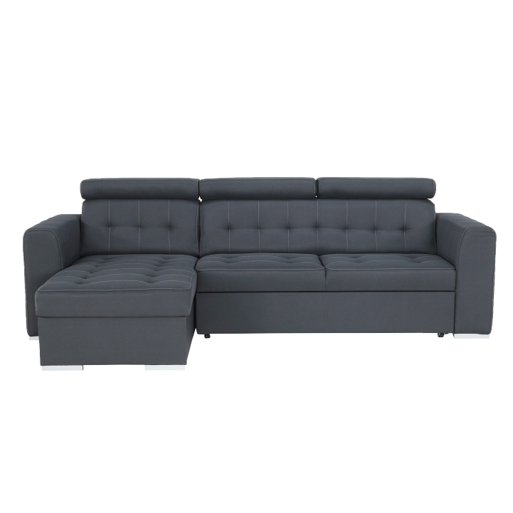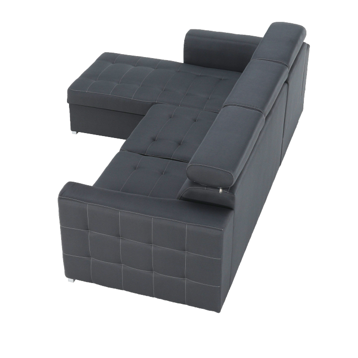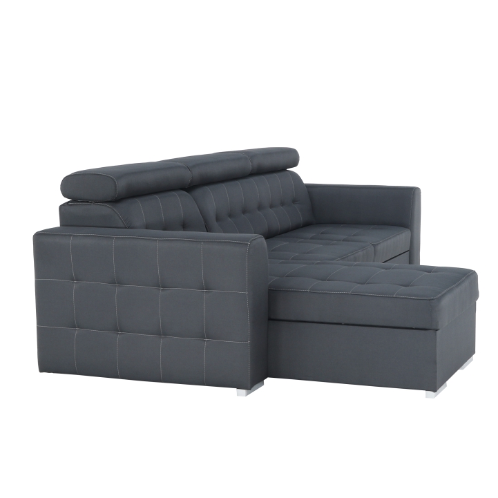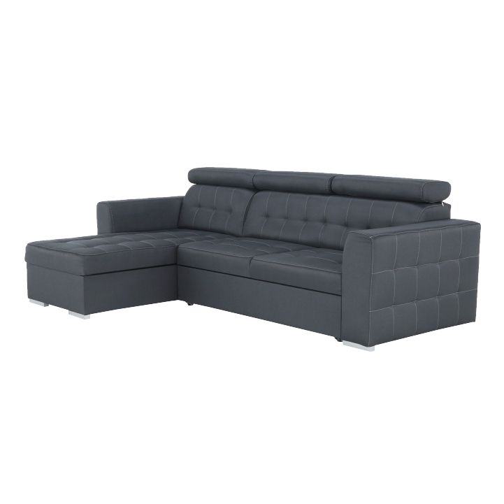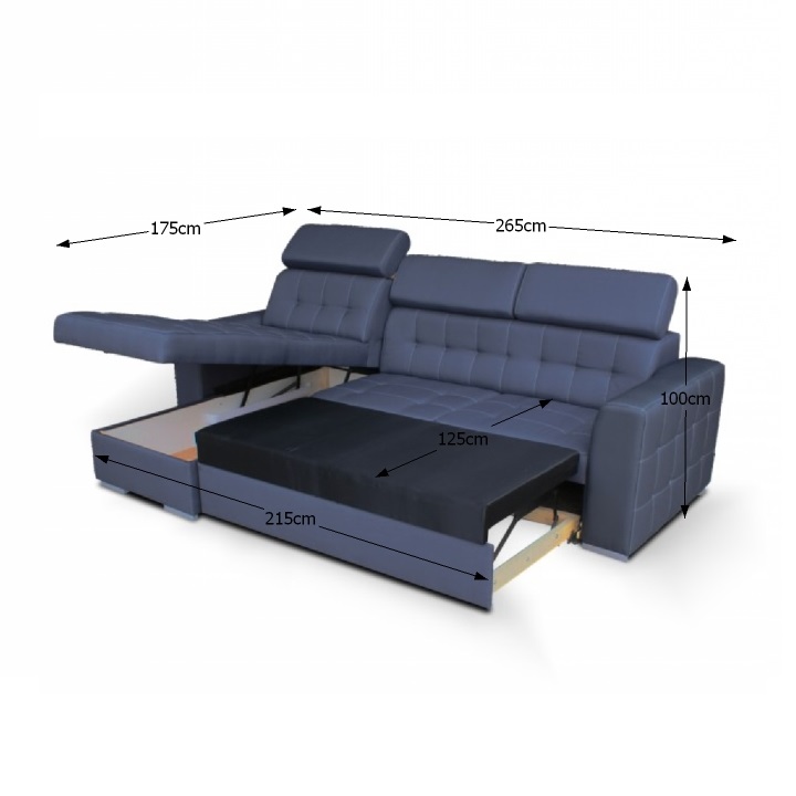 Rohová sedačka KAZARA L je celočalúnená rozkladacia sedačka s úložným priestorom, ktorú možno umiestniť do obývacej izby. Spacia plocha má rozmery 215x125 cm. Prednosťou sedačky je polohovateľné záhlavie, ktoré zabezpečuje komfortné opretie chrbta a hlavy. Pohodlné sedenie poskytuje kombinácia pružín falista s molitanom. Do úložného priestoru možno uložiť deky, vankúše či posteľné prádlo. Sedačka je na výber v ľavom aj v pravom prevedení. Je potiahnutá sivým šenilom (Nemo 15) so svetlým šitím, pričom na výber je aj v iných farebných vyhotoveniach. Je možné si objednať zo 4 farebných prevedení šenilu Nemo. Výška sedu je 42 cm a hĺbka sedu je 58 cm. K sedačke odporúčame dokúpiť kreslo alebo taburetky Kazara.