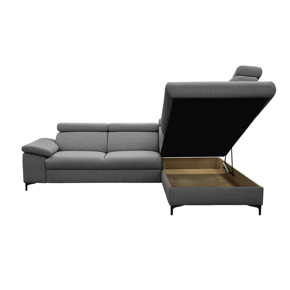 Rohová sedacia súprava ZACHARY ROH v pravom prevedení spája nadčasový dizajn, výnimočný komfort a praktické funkcie. Je celočalúnená odolnou látkou Toronto 14 v elegantnej sivej farbe, ktorá má vodeodolnú úpravu a oderuodolnosť 70 000 cyklov podľa testu Martindale. Moderný vzhľad dopĺňajú čierne kovové nožičky s výškou spodného priestoru 10 cm, čo uľahčuje upratovanie. Rozmery sedacej súpravy sú (ŠxHxV): 268x205x81/92 cm, pričom výška sedu je 44 cm a hĺbka sedu 61 cm. Päť polohovateľných opierok hlavy ponúka 6 stupňov nastavenia, takže si pohodlie prispôsobíte podľa seba. Výška opierky chrbta je 28 cm, výška opierky na ruku 46 cm a jej šírka 28 cm. Vďaka rozkladacej funkcii vytvoríte spaciu plochu s rozmerom 132x210 cm, ideálnu pre príležitostné prespatie. V otomanovej časti sa nachádza priestranný úložný priestor, kam uložíte deky, prikrývky či paplóny. Sedacia časť je vyplnená kombináciou pružiny falista a PUR peny, čo zaručuje vysoký komfort a tvarovú stálosť. Nosnosť je 90 kg na osobu. Tento kvalitný slovenský výrobok sa dodáva v demonte, pripravený na jednoduchú montáž.