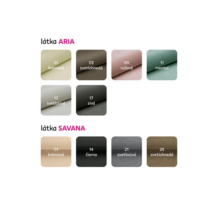 Sedačku si môžete objednať aj v inej farbe. Na výber máte šesť odtieňov látky Aria a 4 odtiene látky Savana. Odtiene nájdete v priloženom vzorkovníku. Výber farebného odtieňa poznačte pri objednávaní priamo do poznámky . Segoria P (pevná bez úložného priestoru) na objednávku vo vyobrazených prevedeniach v cene: 1.389 Eur. Pri individuálnej objednávke je potrebné zaplatiť 20% zálohu z danej sumy. Po uhradení zálohy bude Vaša požiadavka zadaná do výroby. Dodacia doba 6-8 týždňov.