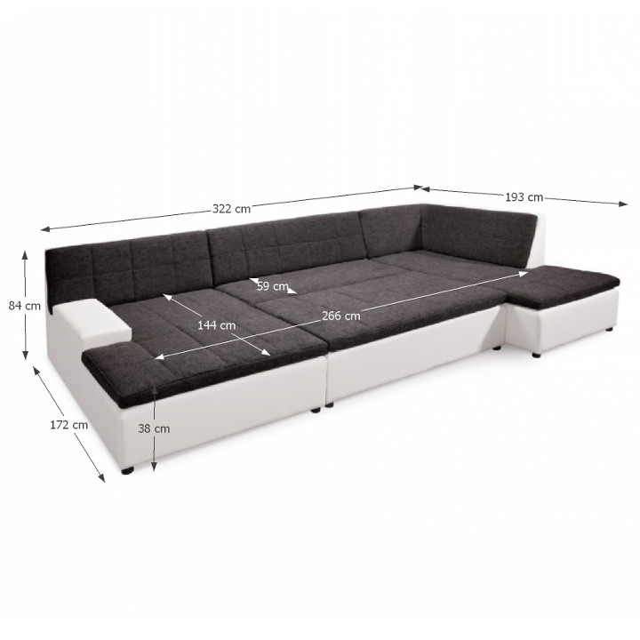 Rohová sedačka HOUSTON P je pohodlná sedačka v tvare U, ktorú možno umiestniť do moderne zariadenej obývacej izby. Obsahuje taburetku, vďaka ktorej po priložení poskytuje sedačka dostatok priestoru na každodenné spanie. Plocha na spanie má rozmery 266x144 cm. Sedačka ponúka príjemné sedenie s dekoratívne prešitým sedákom a opierkou. Sedačka je na výber v ľavom aj v pravom prevedení. Korpus je čalúnený bielou ekokožou (Madryt 120) a sedenie sivou látkou (Inari 96). Výška sedu je 38 cm a hĺbka sedu je 59 cm.