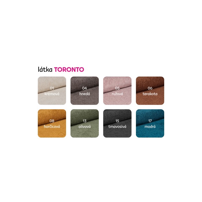 Možnosť objednania v 8 farebných prevedeniach látky Toronto v cene 1 515 Eur. Pri individuálnej objednávke je potrebné zaplatiť 20% zálohu z danej sumy. Po uhradení zálohy bude Vaša požiadavka zadaná do výroby. Dodacia lehota 8-10 týždňov.