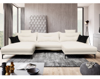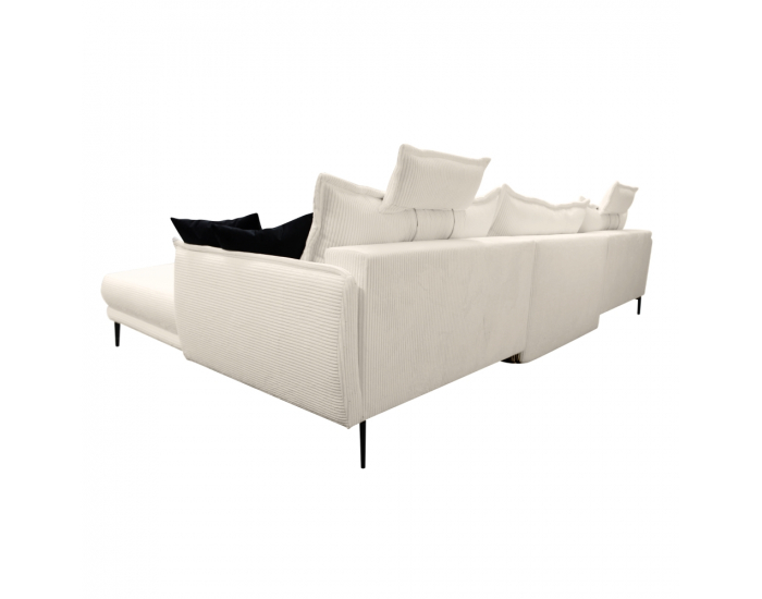 Univerzálna rohová sedacia súprava CASIDY U L/P ponúka pohodlie a štýl pre celú rodinu. Vďaka veľkému priestoru s rozmermi (ŠxHxV): 360x197x69/93/110 cm sa stane dominantou vašej obývačky. Celočalúnená je odolnou látkou Poso 38 v smotanovej farbe, ktorá je kombinovaná s čiernou látkou Kronos 07 na dekoratívnych vankúšoch. Táto sedacia súprava v tvare U je vybavená funkciou rozkladu na plnohodnotnú plochu na spanie o rozmere 137x343 cm a praktickým úložným priestorom na posteľnú bielizeň alebo iné veci. Sedenie zvyšuje pohodlie vďaka výplni z pružiny falista a PUR peny. Stabilitu zabezpečujú pevné čierne kovové nožičky, ktoré tiež vytvárajú praktický spodný priestor vysoký 17 cm. Sedacia súprava je dodávaná s troma veľkými opierkovými vankúšmi 123x60 cm s dvoma záhlavkami a štyrmi menšími dekoratívnymi vankúšikmi 42x42 cm. CasidyU Uni je univerzálna, rozkladacia, celočalúnená rohová súprava s praktickými vlastnosťami, ktorá skvelo zapadne do moderného interiéru.